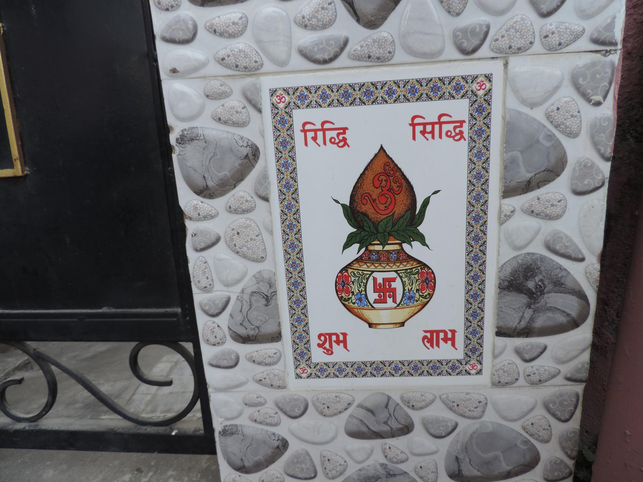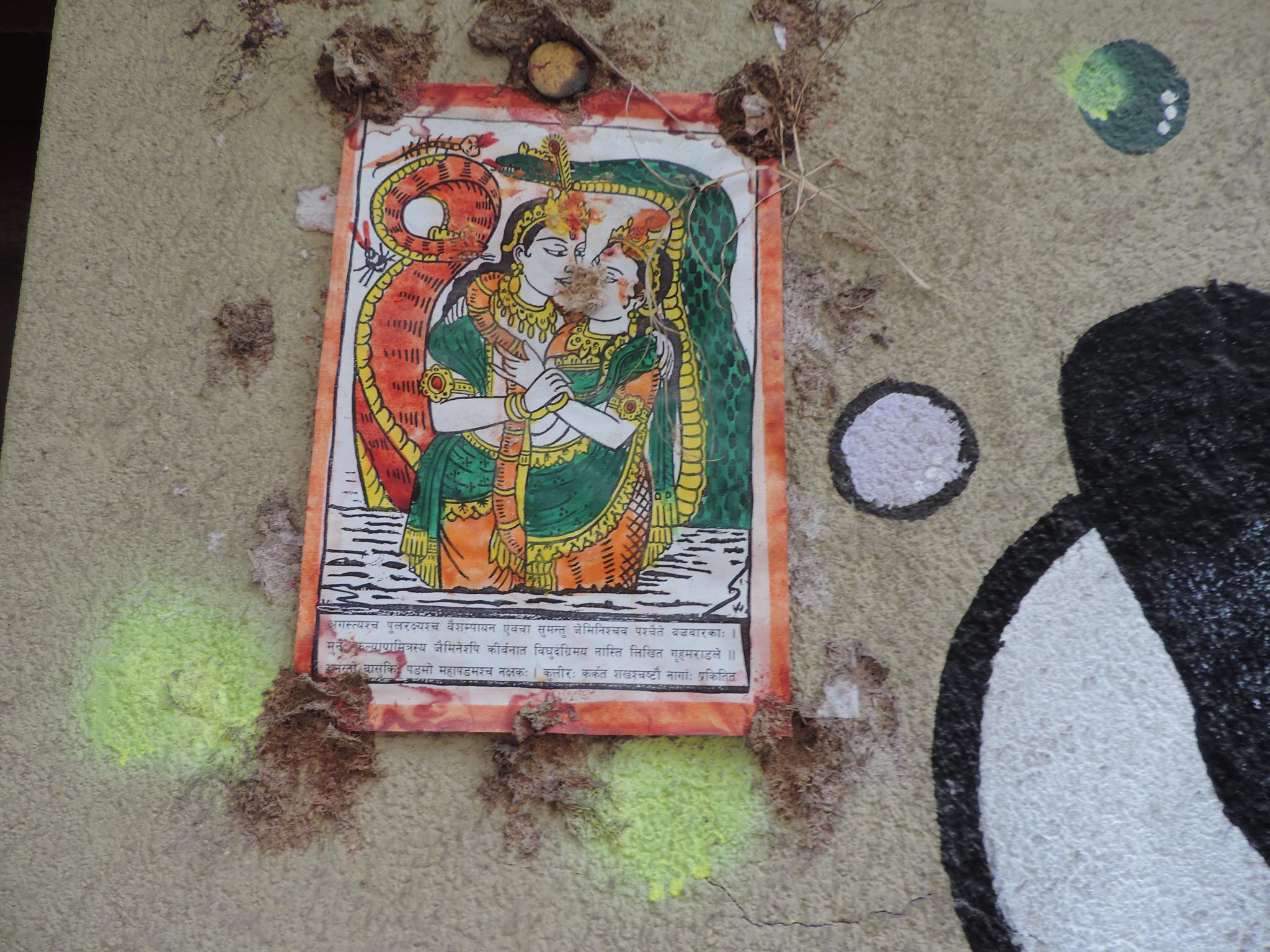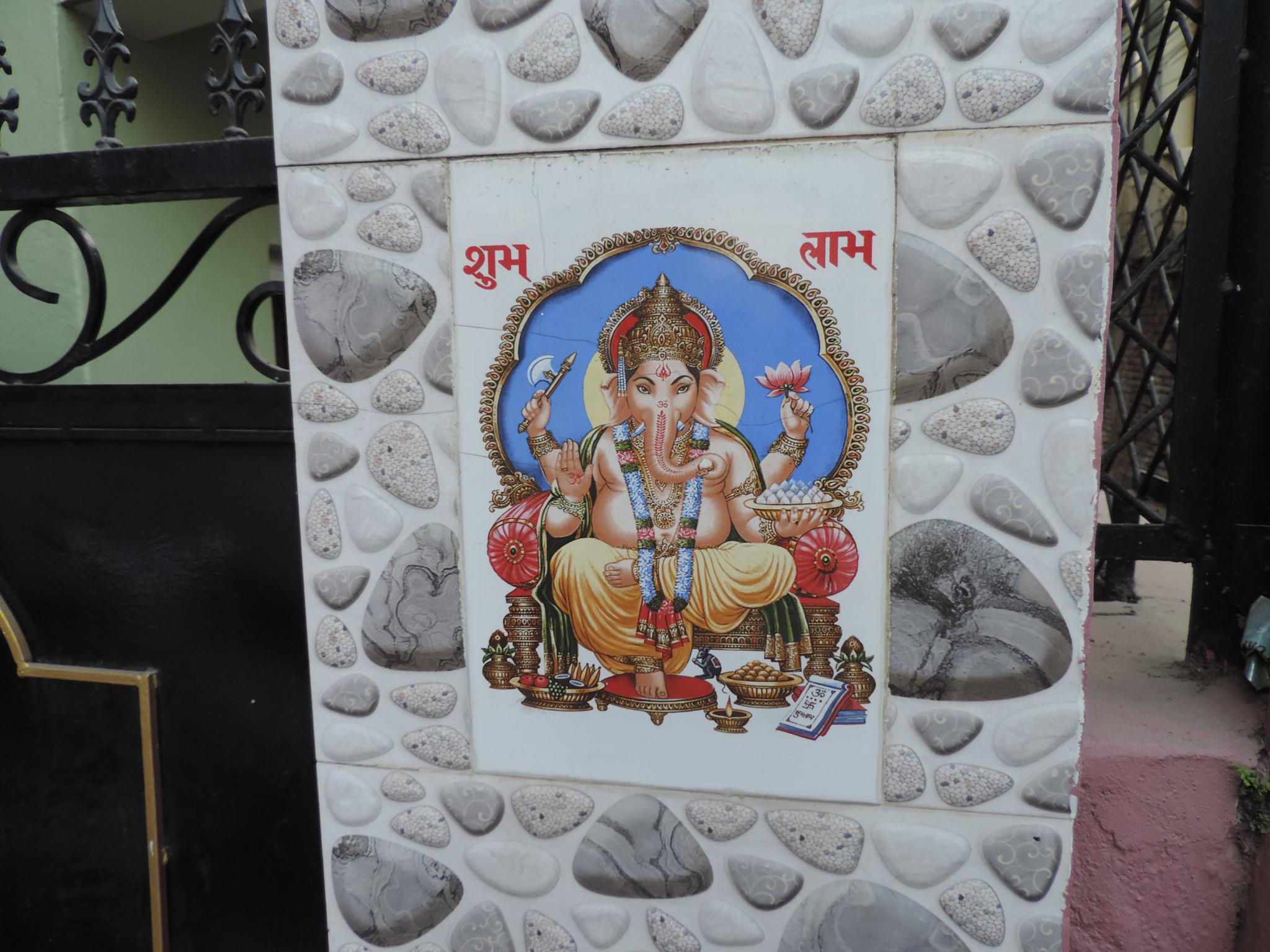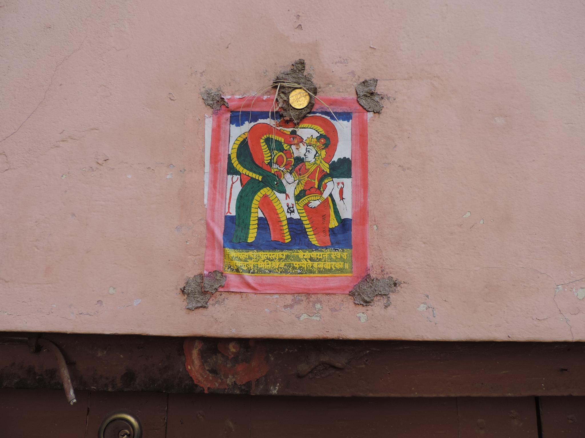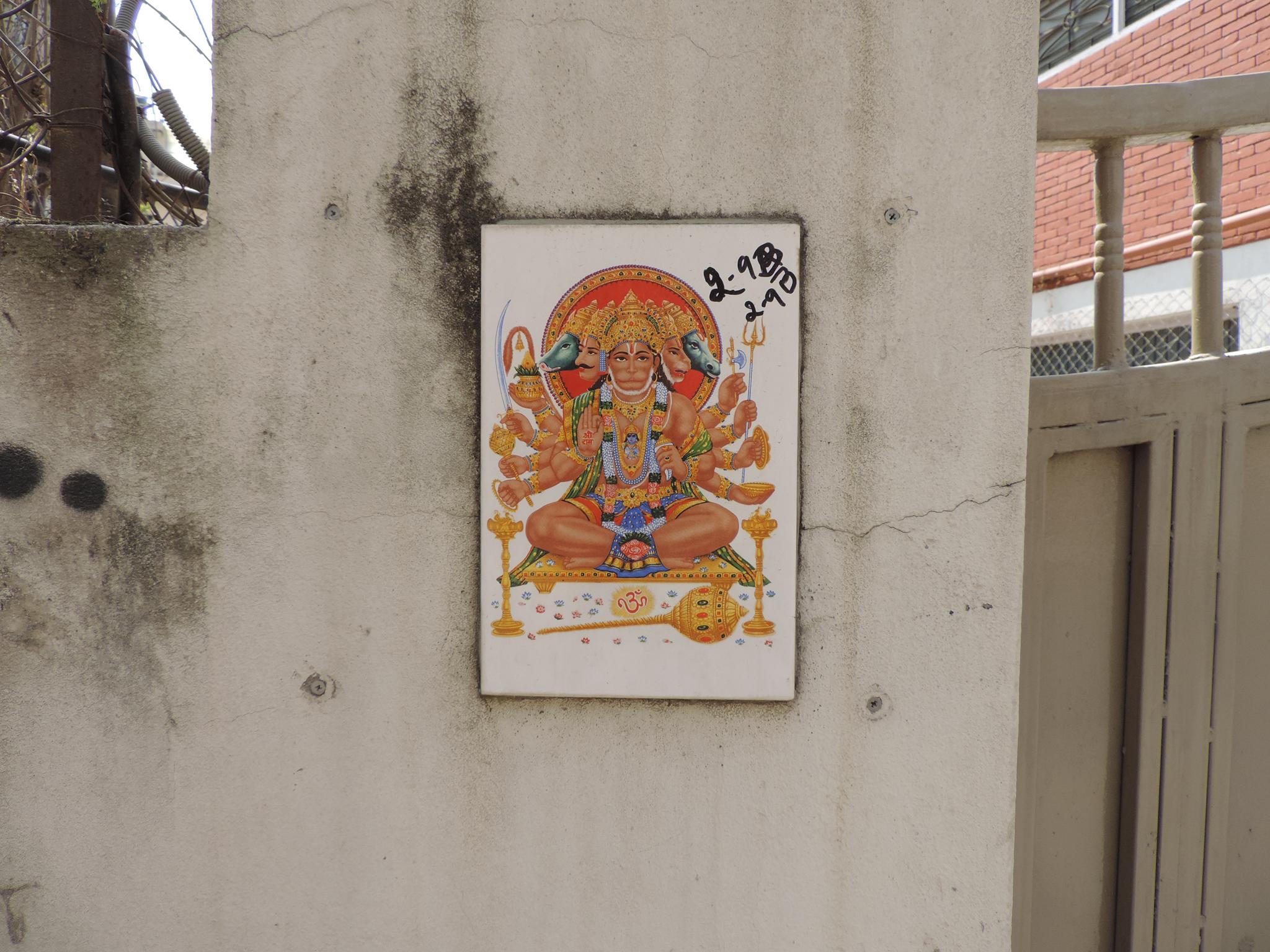 In Kathmandu and Patan, you often see small stone or terracotta tiles with religious motifs placed near house entrances. These elements are part of traditional Newar architecture and are generally referred to as religious relief panels, protective tiles, or small outdoor household shrines. They are typically made of carved stone, fired clay, or more rarely metal. These tiles are not merely decorative but serve with religious purposes as protective symbols against misfortune. At the same time, they function as miniature shrines where residents offer flowers, rice, or incense. The handmade artworks often depict deities such as Krishna, Shiwa, Ganesha, Hanuman, Saraswati or Buddha, as well as protective symbols, mandalas, and mythical beings. Their placement at the entrance is intentional, because the doorway is seen as a transitional space between the outside world and the private home, which the depicted deities are meant to protect, bless, and keep spiritually pure. Besides the numerous tiles, there are also paste up works, wooden boards or wall paintings around the entrance doors.