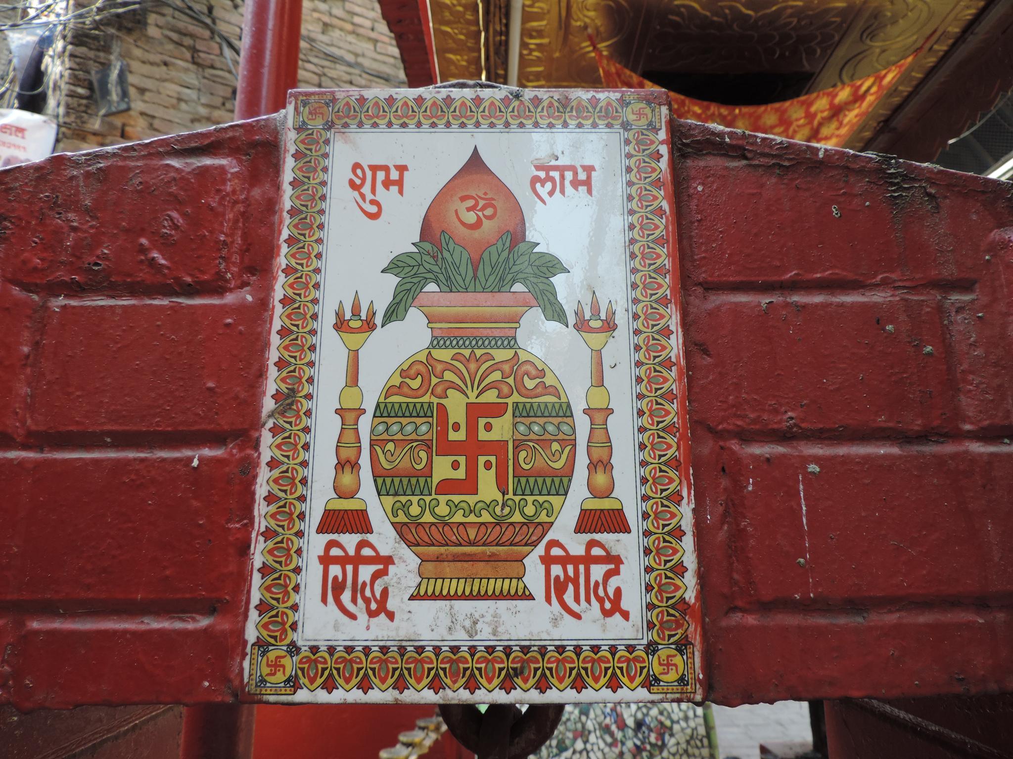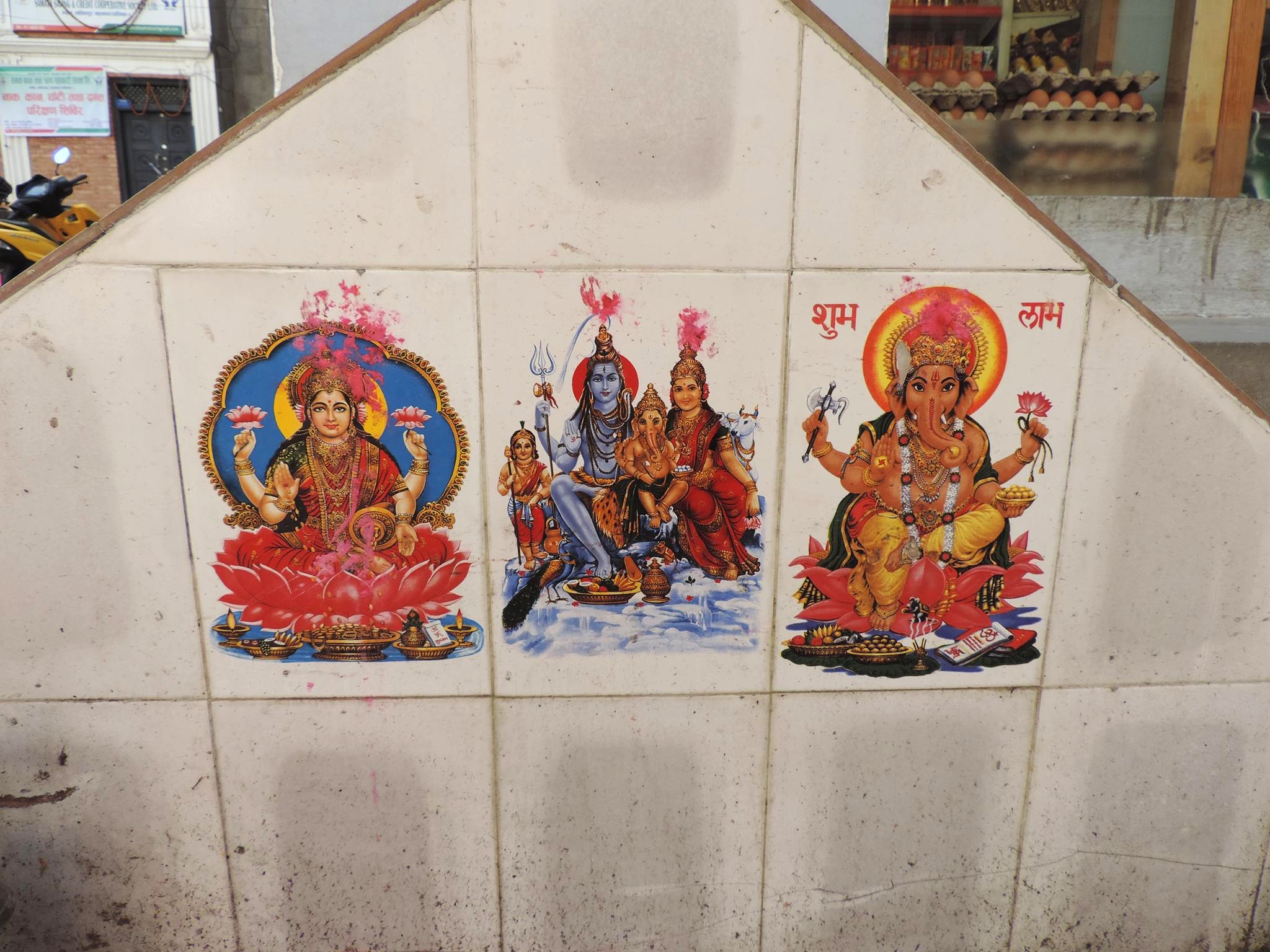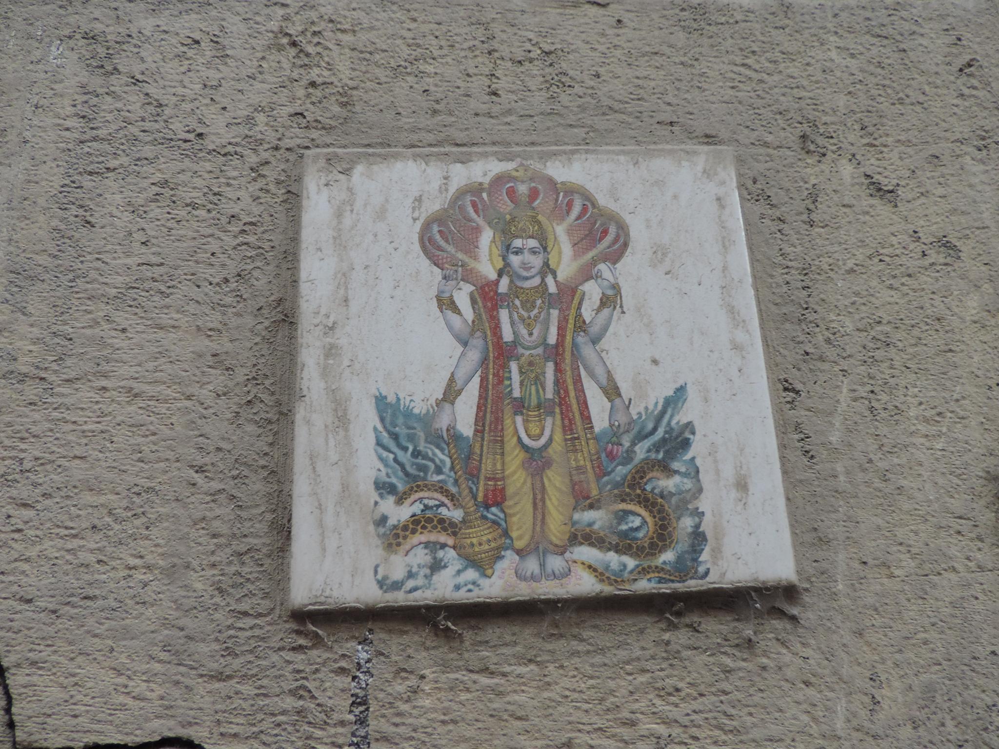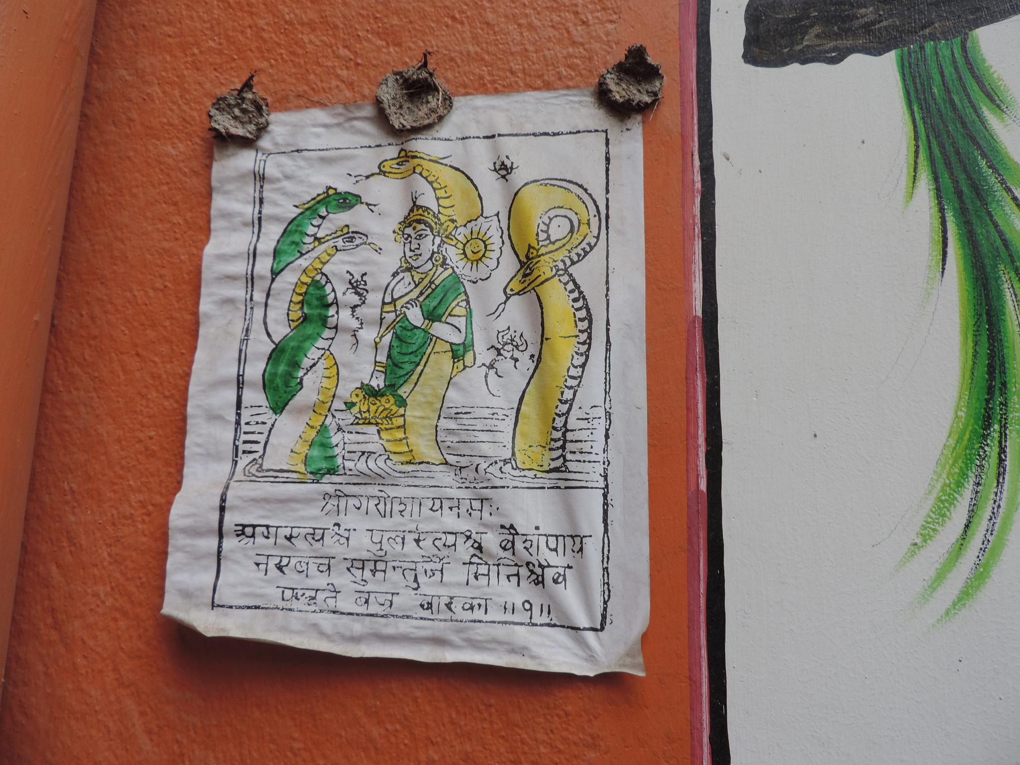 In Kathmandu and Patan, you often see small stone or terracotta tiles with religious motifs placed near house entrances. These elements are part of traditional Newar architecture and are generally referred to as religious relief panels, protective tiles, or small outdoor household shrines. They are typically made of carved stone, fired clay, or more rarely metal. These tiles are not merely decorative but serve with religious purposes as protective symbols against misfortune. At the same time, they function as miniature shrines where residents offer flowers, rice, or incense. The handmade artworks often depict deities such as Krishna, Shiwa, Ganesha, Hanuman, Saraswati or Buddha, as well as protective symbols, mandalas, and mythical beings. Their placement at the entrance is intentional, because the doorway is seen as a transitional space between the outside world and the private home, which the depicted deities are meant to protect, bless, and keep spiritually pure. Besides the numerous tiles, there are also paste up works, wooden boards or wall paintings around the entrance doors.