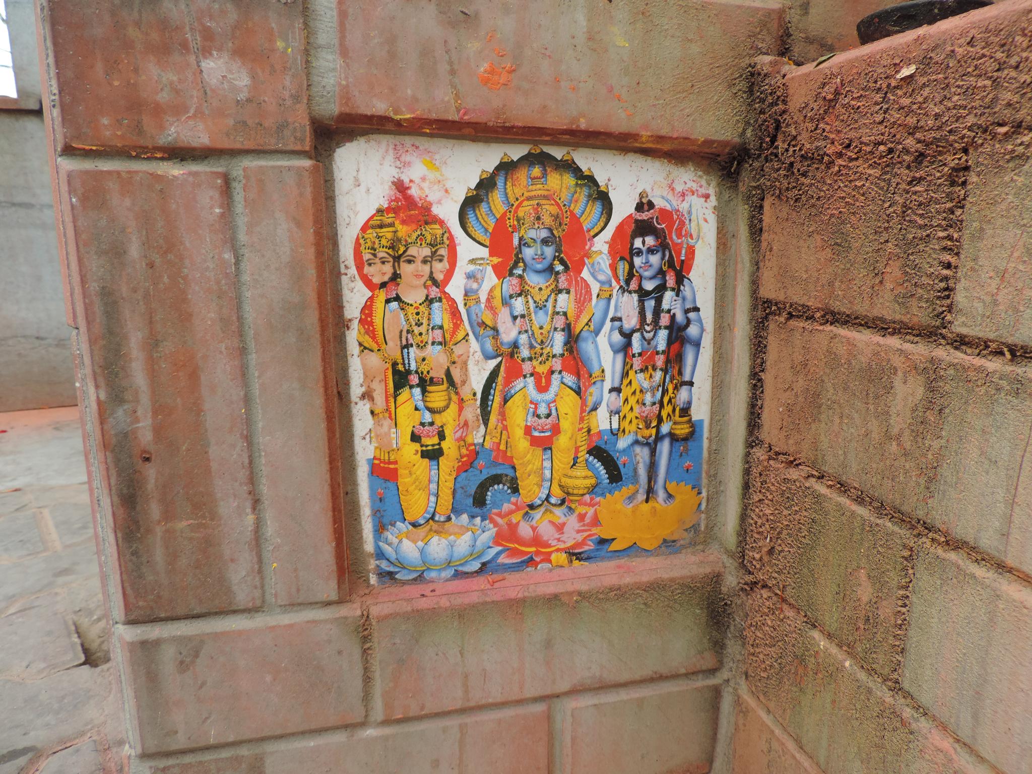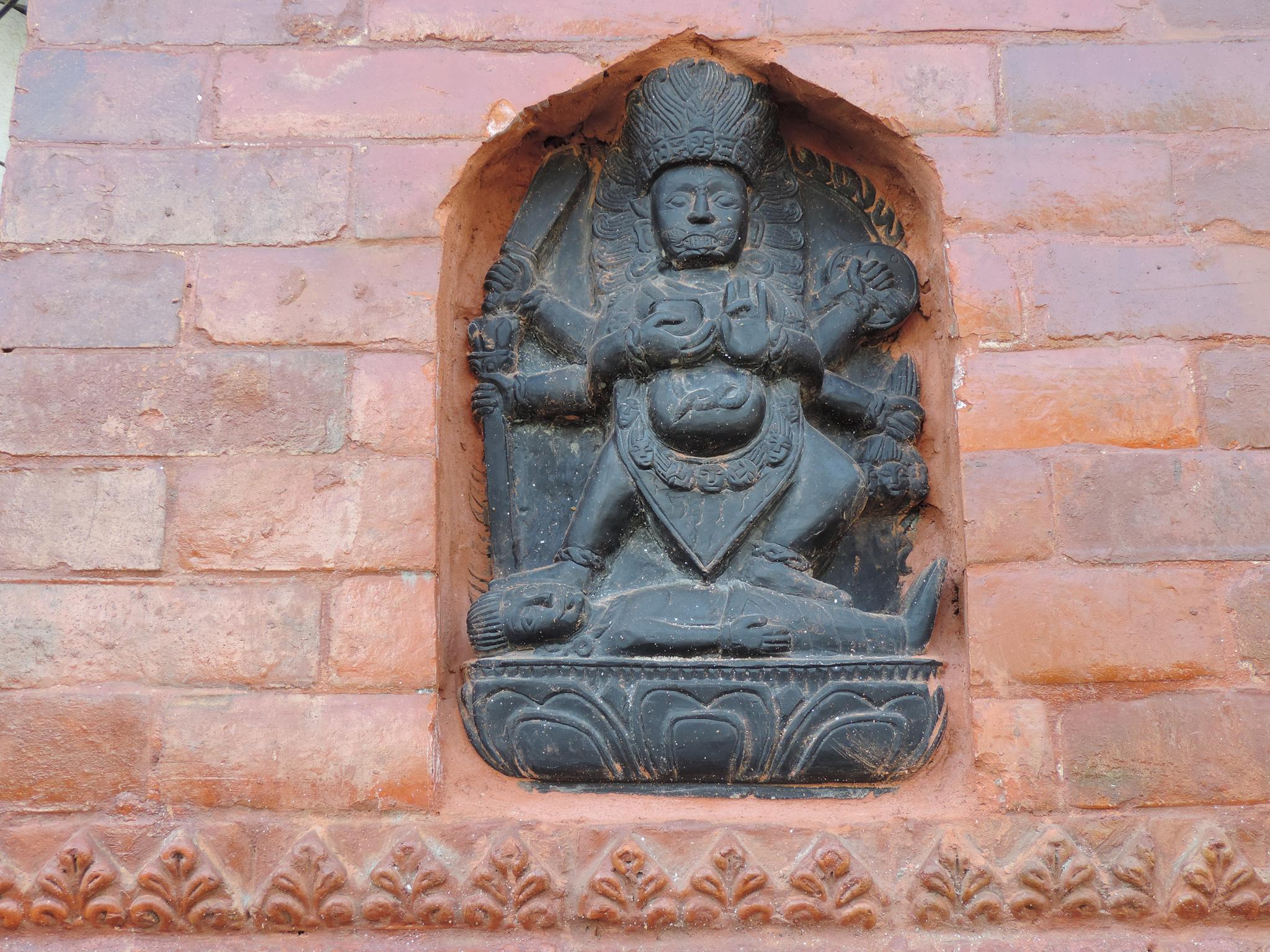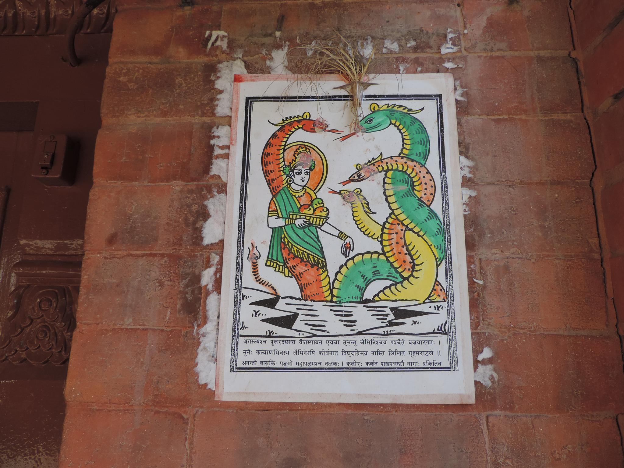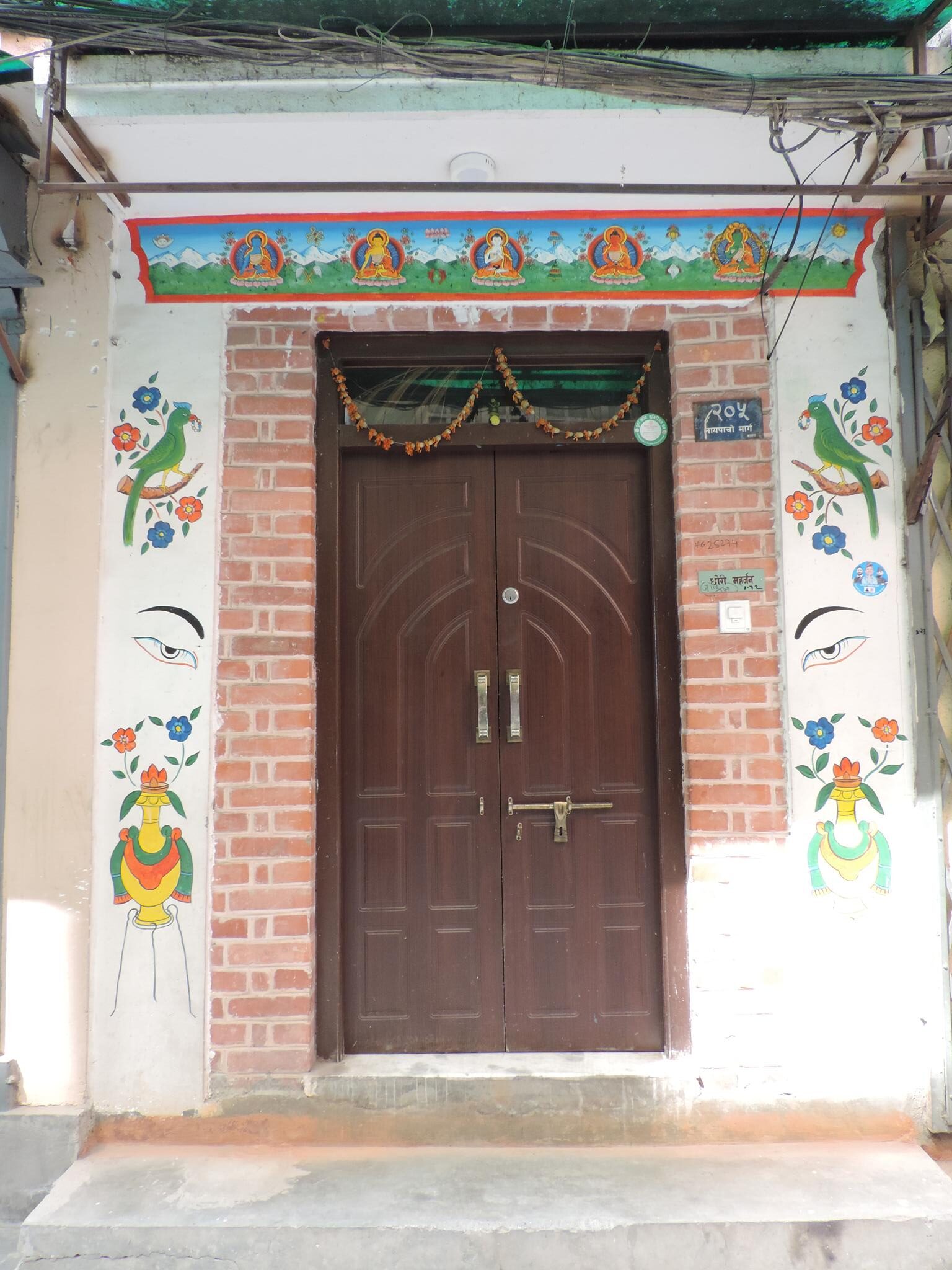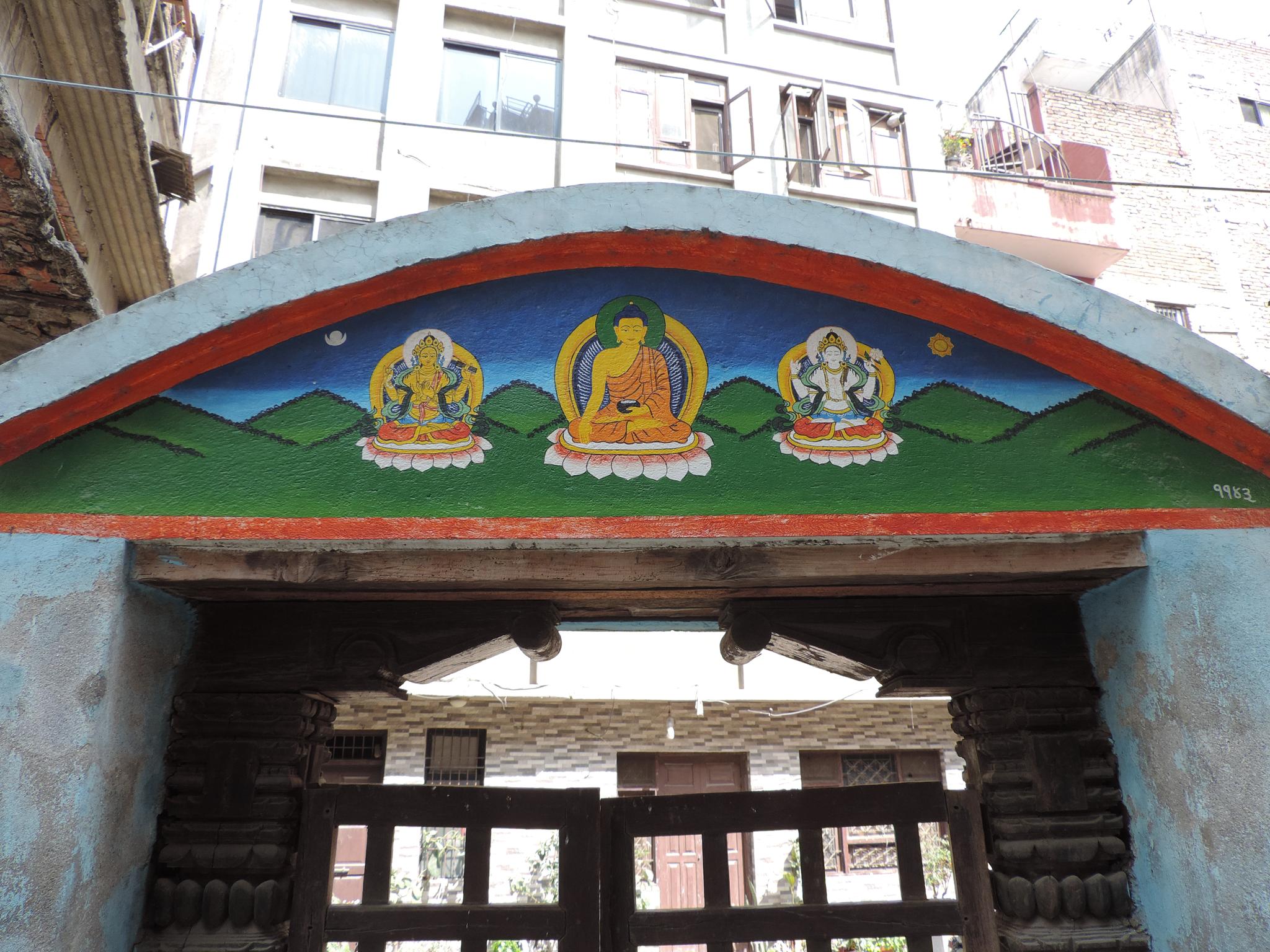 In Kathmandu and Patan, you often see small stone or terracotta tiles with religious motifs placed near house entrances. These elements are part of traditional Newar architecture and are generally referred to as religious relief panels, protective tiles, or small outdoor household shrines. They are typically made of carved stone, fired clay, or more rarely metal. These tiles are not merely decorative but serve with religious purposes as protective symbols against misfortune. At the same time, they function as miniature shrines where residents offer flowers, rice, or incense. The handmade artworks often depict deities such as Krishna, Shiwa, Ganesha, Hanuman, Saraswati or Buddha, as well as protective symbols, mandalas, and mythical beings. Their placement at the entrance is intentional, because the doorway is seen as a transitional space between the outside world and the private home, which the depicted deities are meant to protect, bless, and keep spiritually pure. Besides the numerous tiles, there are also paste up works, wooden boards or wall paintings around the entrance doors.