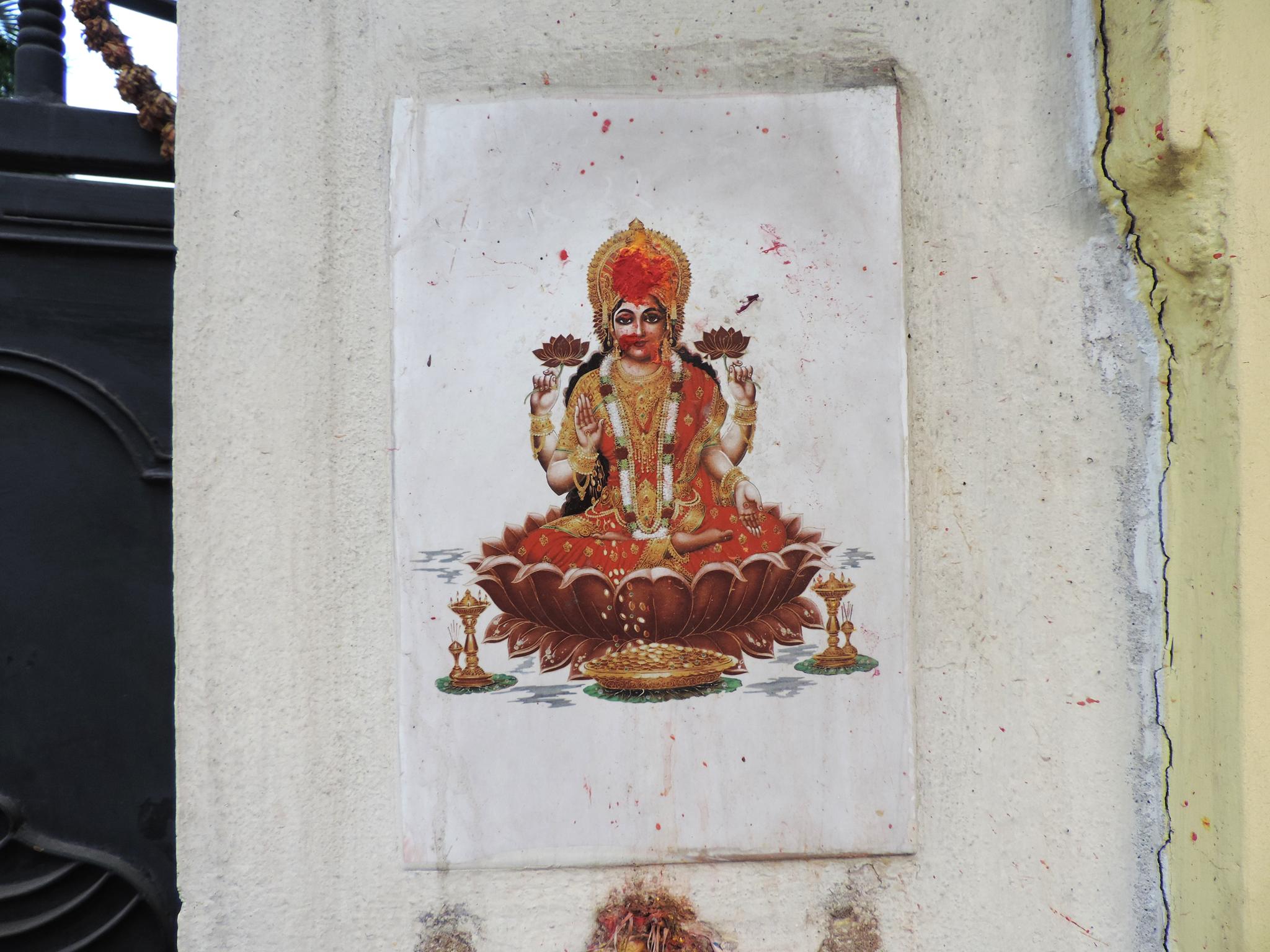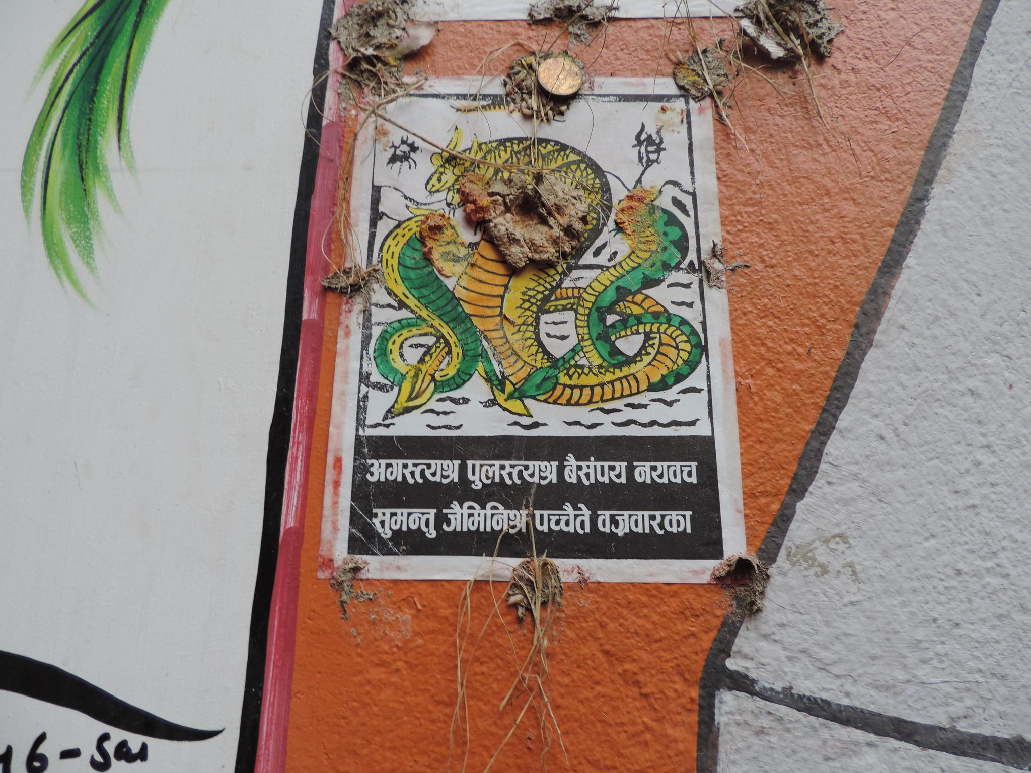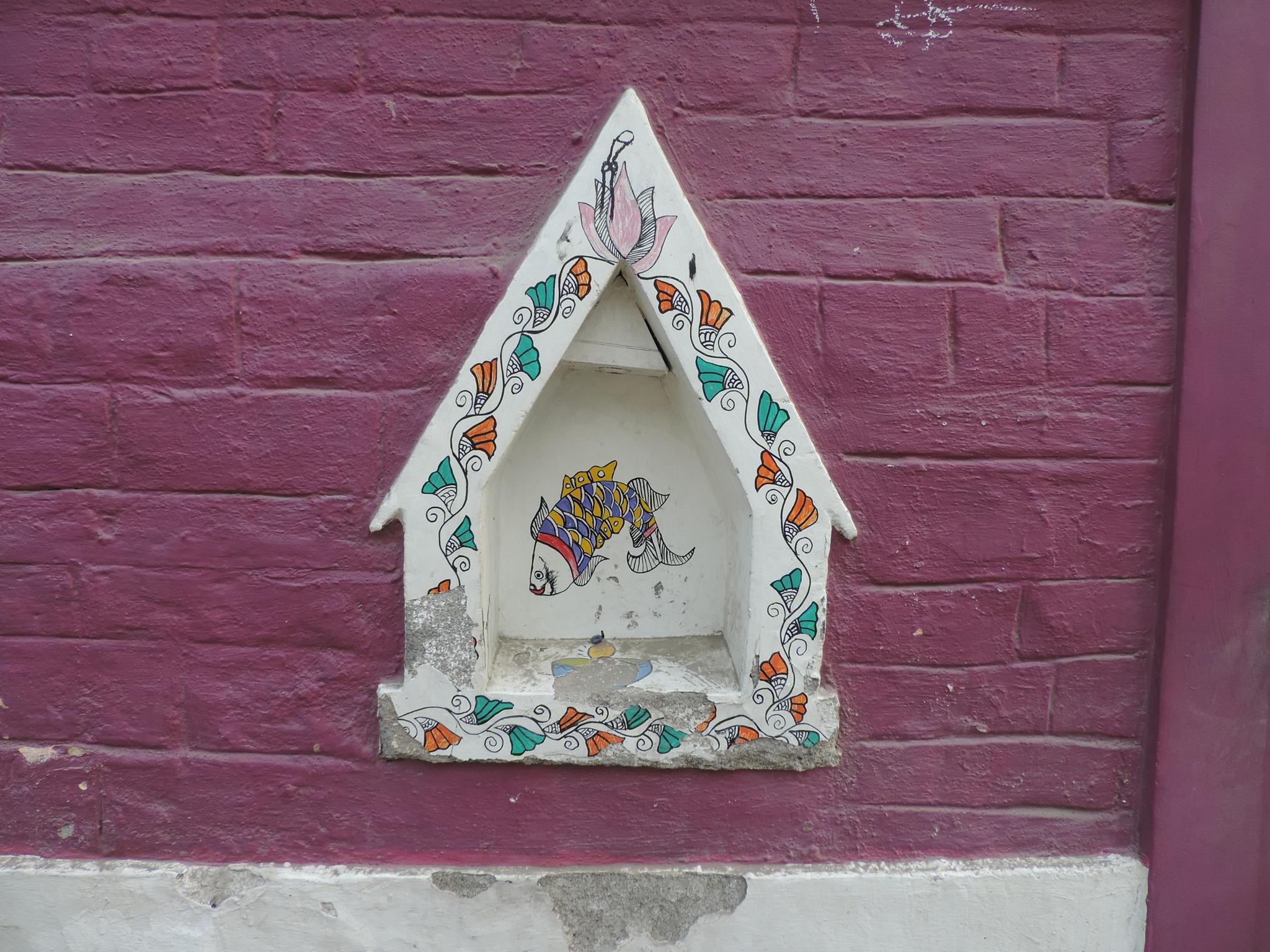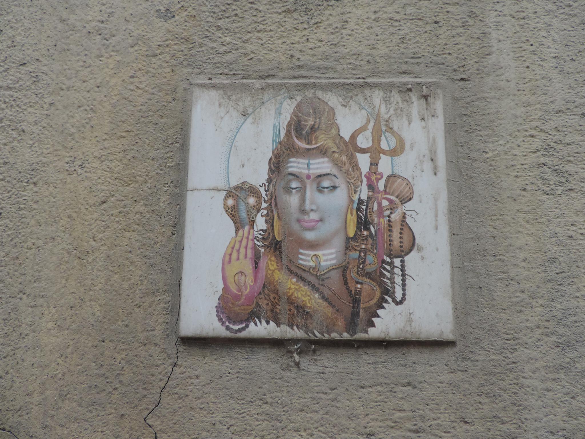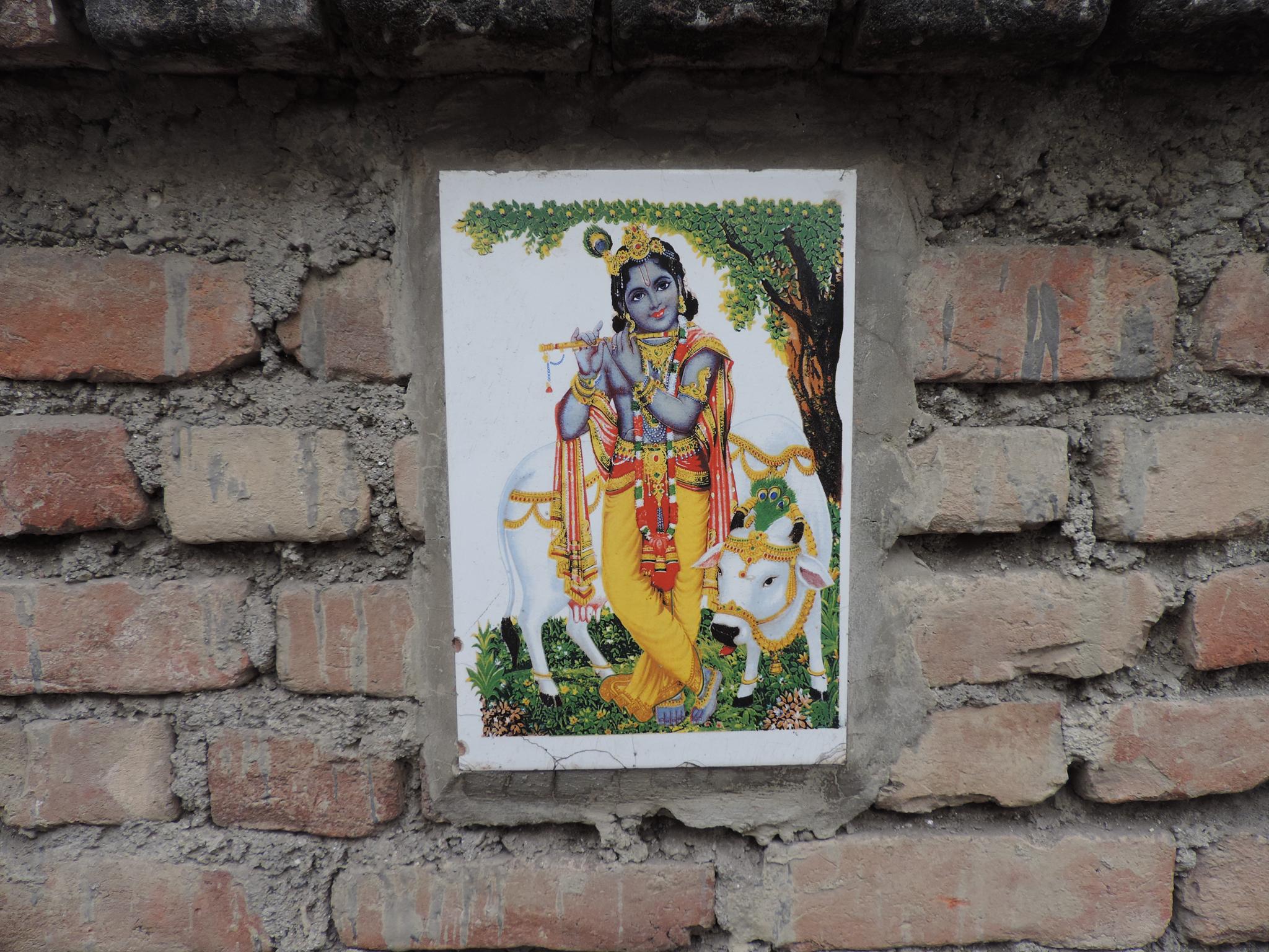 In Kathmandu and Patan, you often see small stone or terracotta tiles with religious motifs placed near house entrances. These elements are part of traditional Newar architecture and are generally referred to as religious relief panels, protective tiles, or small outdoor household shrines. They are typically made of carved stone, fired clay, or more rarely metal. These tiles are not merely decorative but serve with religious purposes as protective symbols against misfortune. At the same time, they function as miniature shrines where residents offer flowers, rice, or incense. The handmade artworks often depict deities such as Krishna, Shiwa, Ganesha, Hanuman, Saraswati or Buddha, as well as protective symbols, mandalas, and mythical beings. Their placement at the entrance is intentional, because the doorway is seen as a transitional space between the outside world and the private home, which the depicted deities are meant to protect, bless, and keep spiritually pure. Besides the numerous tiles, there are also paste up works, wooden boards or wall paintings around the entrance doors.