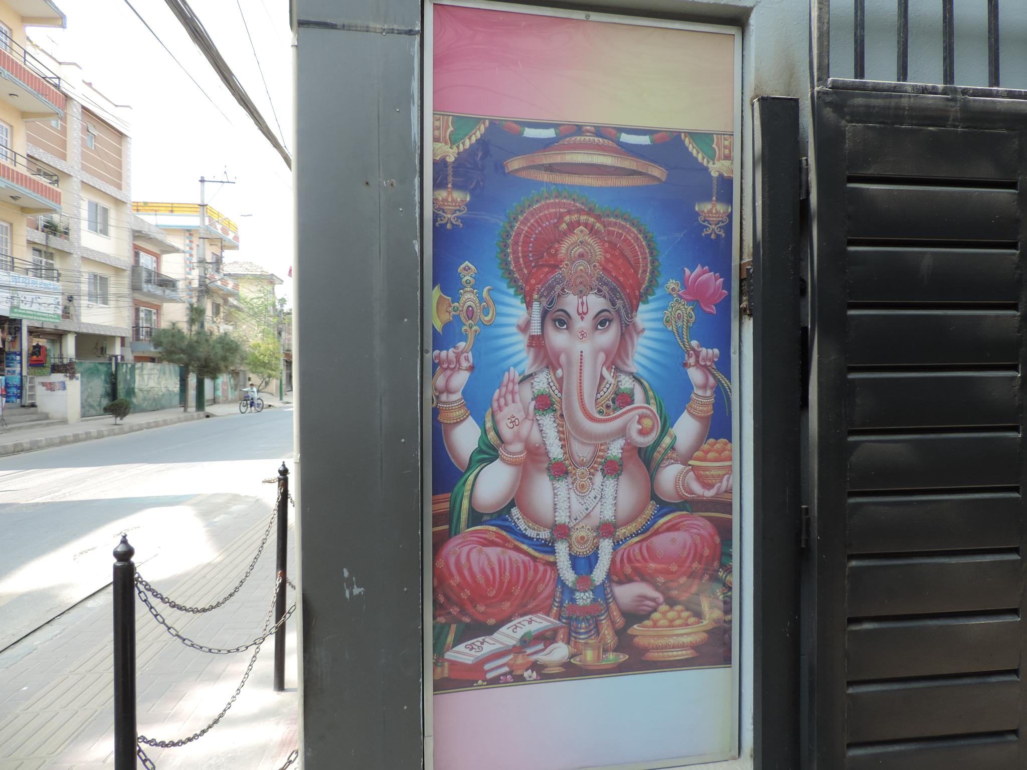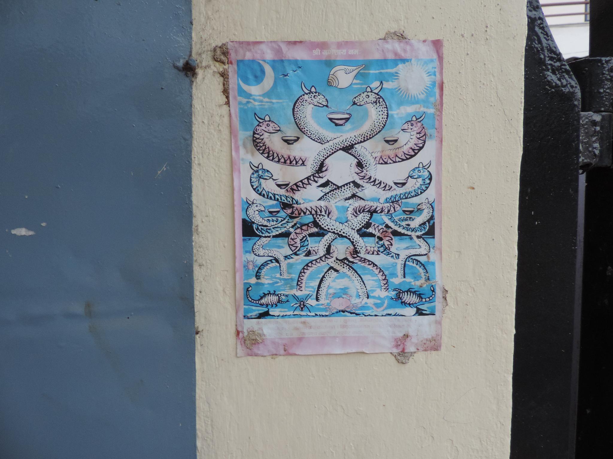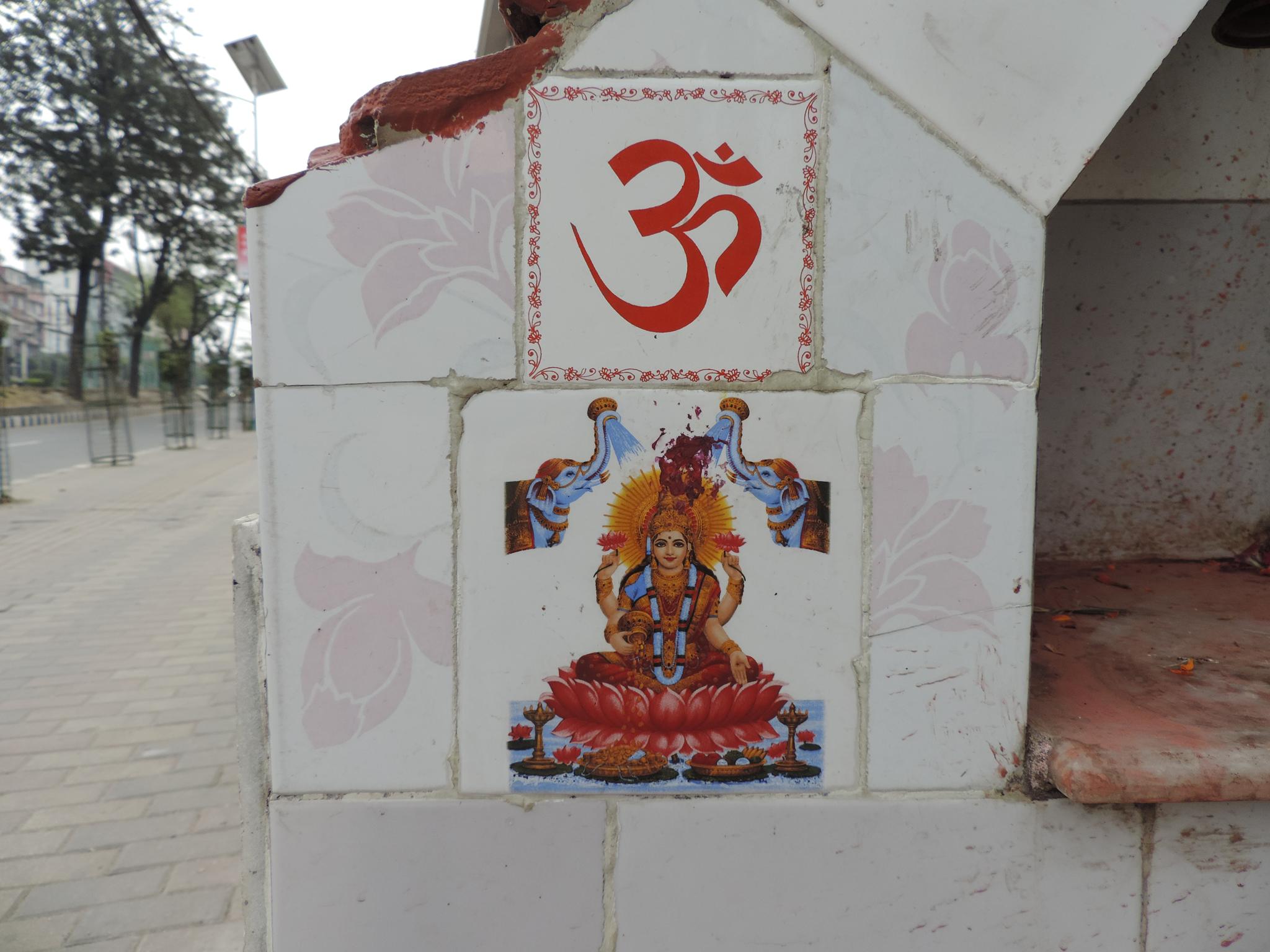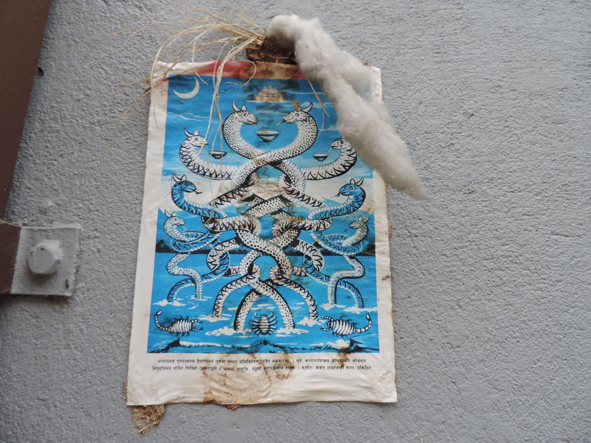 In Kathmandu and Patan, you often see small stone or terracotta tiles with religious motifs placed near house entrances. These elements are part of traditional Newar architecture and are generally referred to as religious relief panels, protective tiles, or small outdoor household shrines. They are typically made of carved stone, fired clay, or more rarely metal. These tiles are not merely decorative but serve with religious purposes as protective symbols against misfortune. At the same time, they function as miniature shrines where residents offer flowers, rice, or incense. The handmade artworks often depict deities such as Krishna, Shiwa, Ganesha, Hanuman, Saraswati or Buddha, as well as protective symbols, mandalas, and mythical beings. Their placement at the entrance is intentional, because the doorway is seen as a transitional space between the outside world and the private home, which the depicted deities are meant to protect, bless, and keep spiritually pure. Besides the numerous tiles, there are also paste up works, wooden boards or wall paintings around the entrance doors.
