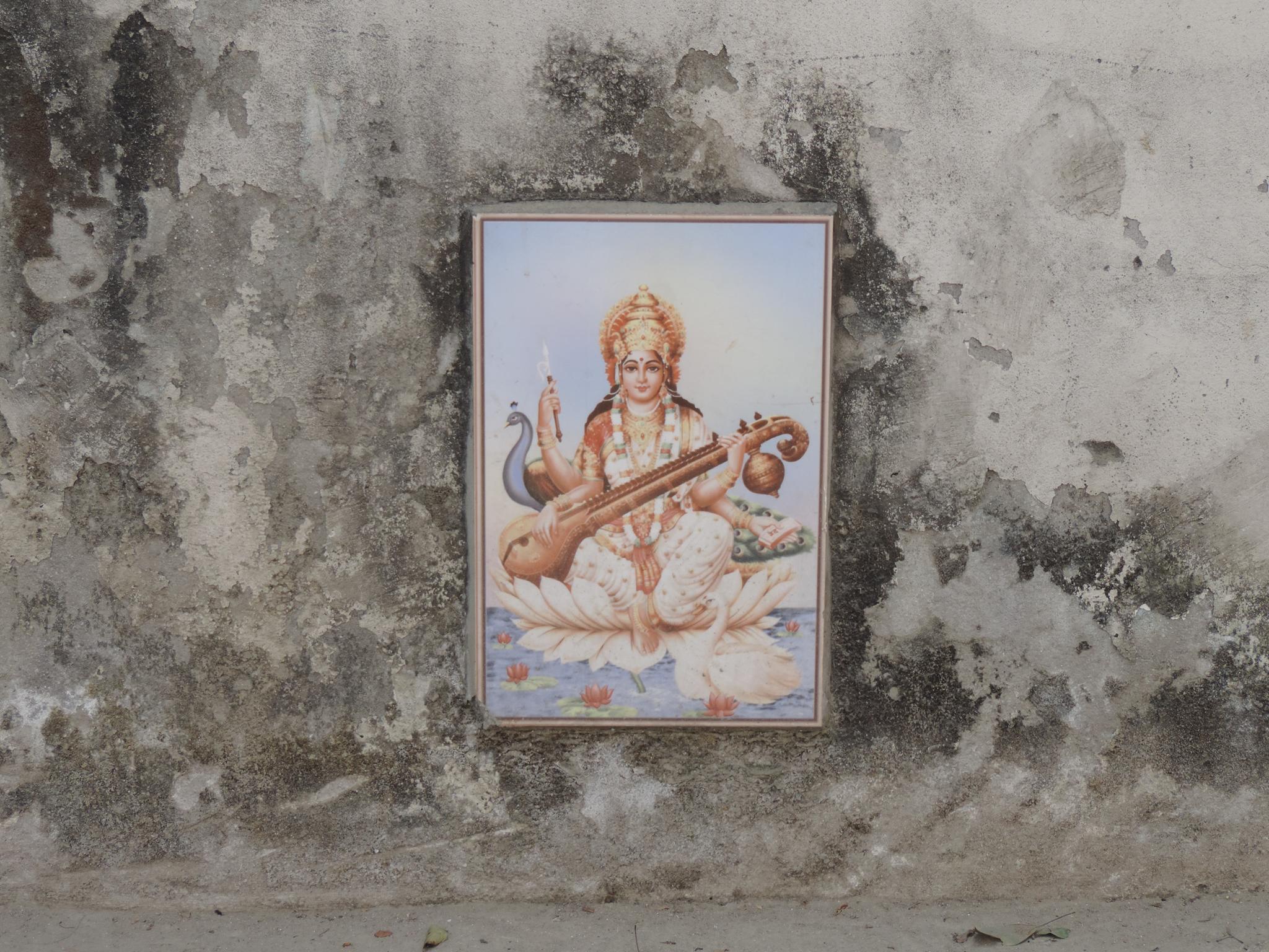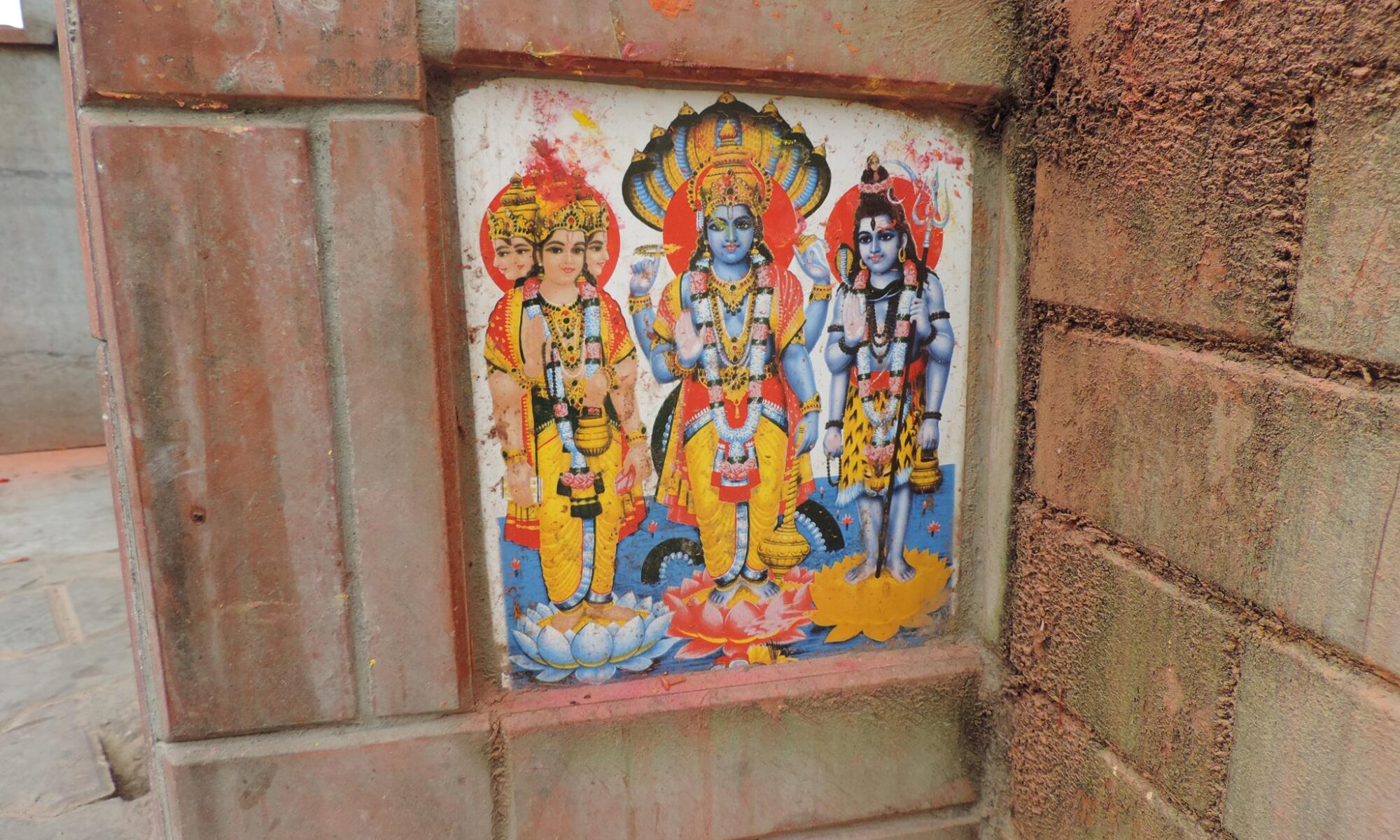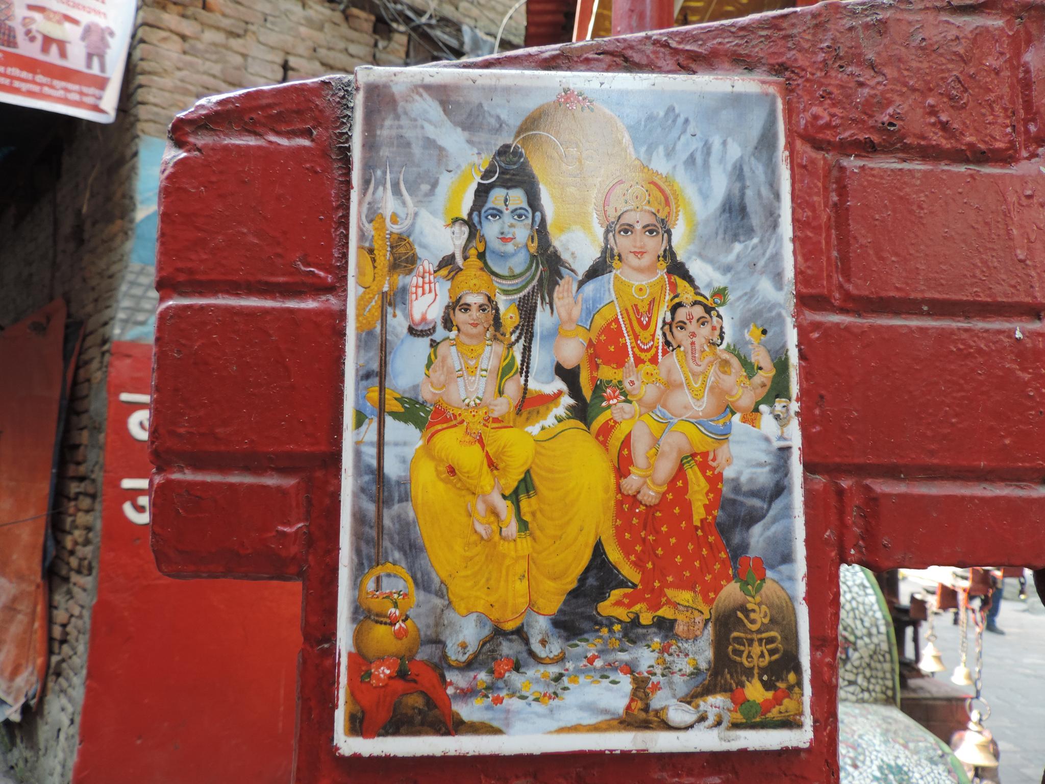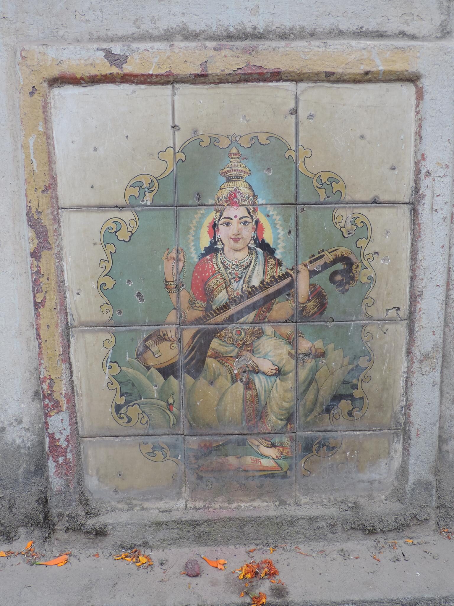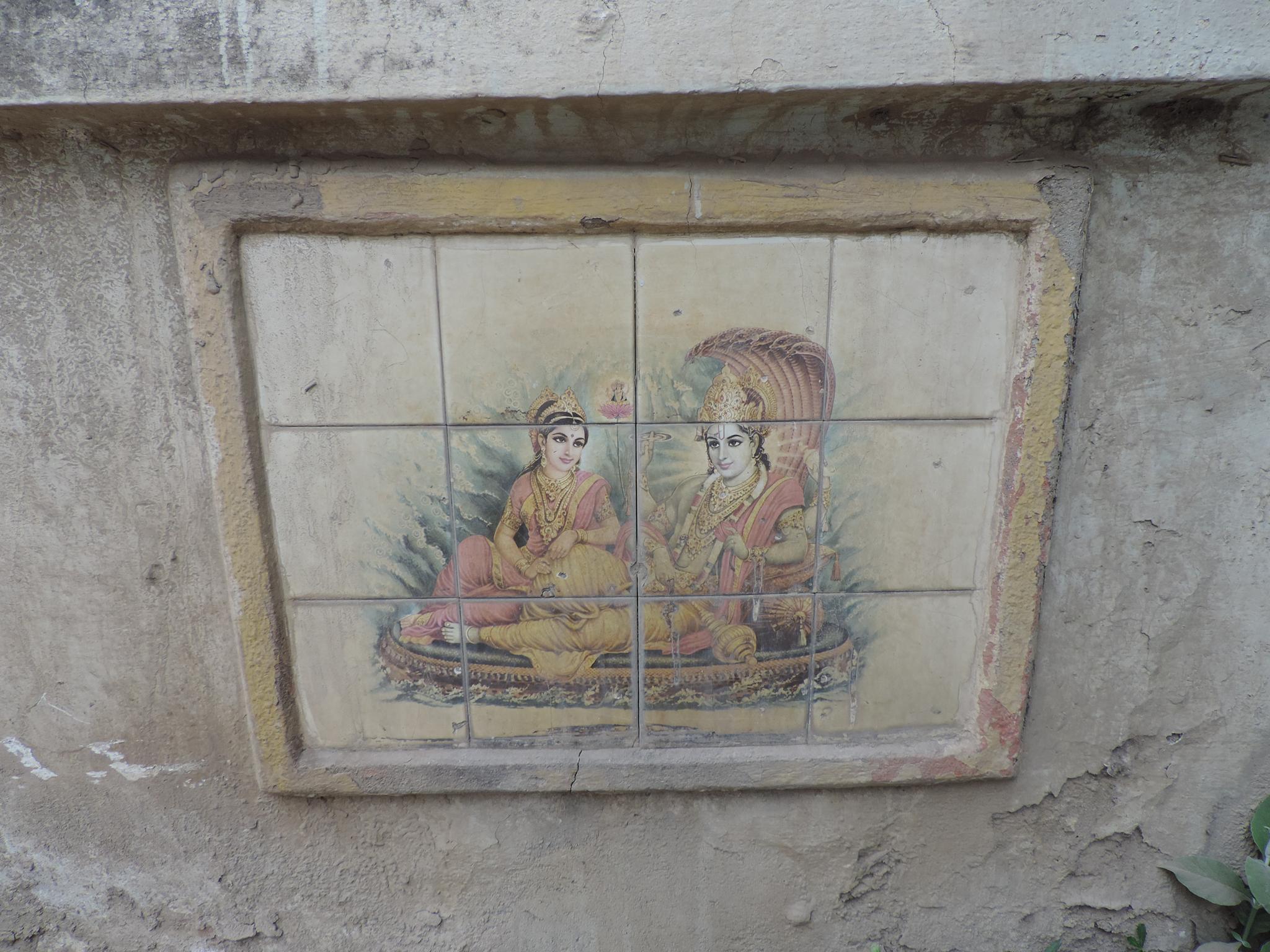 In Kathmandu and Patan, you often see small stone or terracotta tiles with religious motifs placed near house entrances. These elements are part of traditional Newar architecture and are generally referred to as religious relief panels, protective tiles, or small outdoor household shrines. They are typically made of carved stone, fired clay, or more rarely metal. These tiles are not merely decorative but serve with religious purposes as protective symbols against misfortune. At the same time, they function as miniature shrines where residents offer flowers, rice, or incense. The handmade artworks often depict deities such as Krishna, Shiwa, Ganesha, Hanuman, Saraswati or Buddha, as well as protective symbols, mandalas, and mythical beings. Their placement at the entrance is intentional, because the doorway is seen as a transitional space between the outside world and the private home, which the depicted deities are meant to protect, bless, and keep spiritually pure. Besides the numerous tiles, there are also paste up works, wooden boards or wall paintings around the entrance doors.