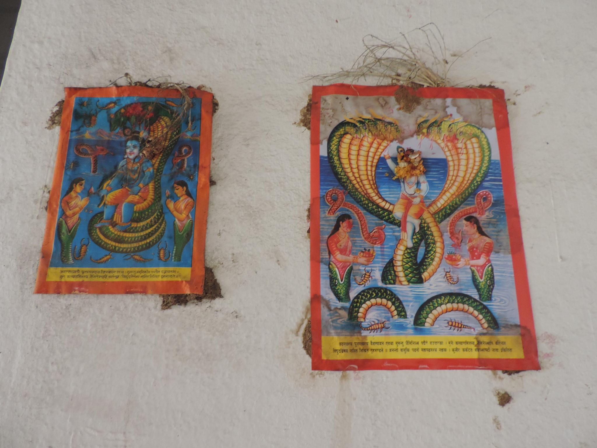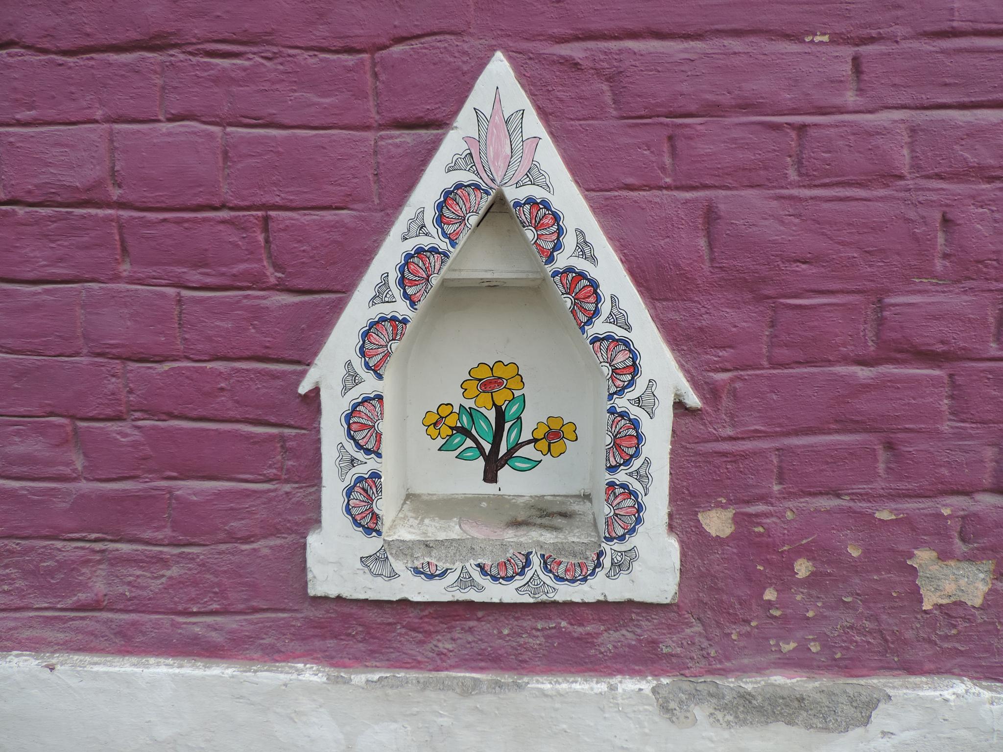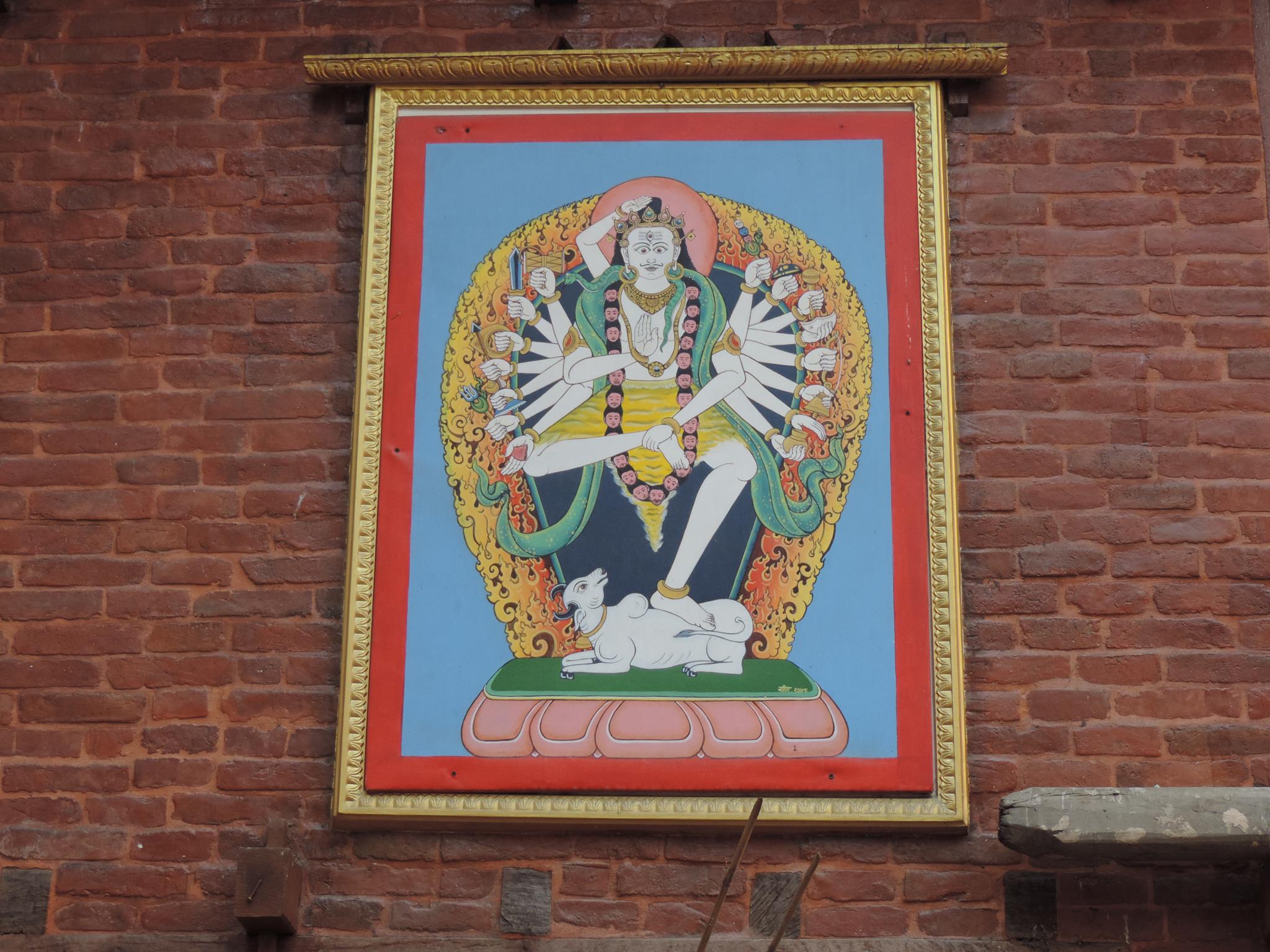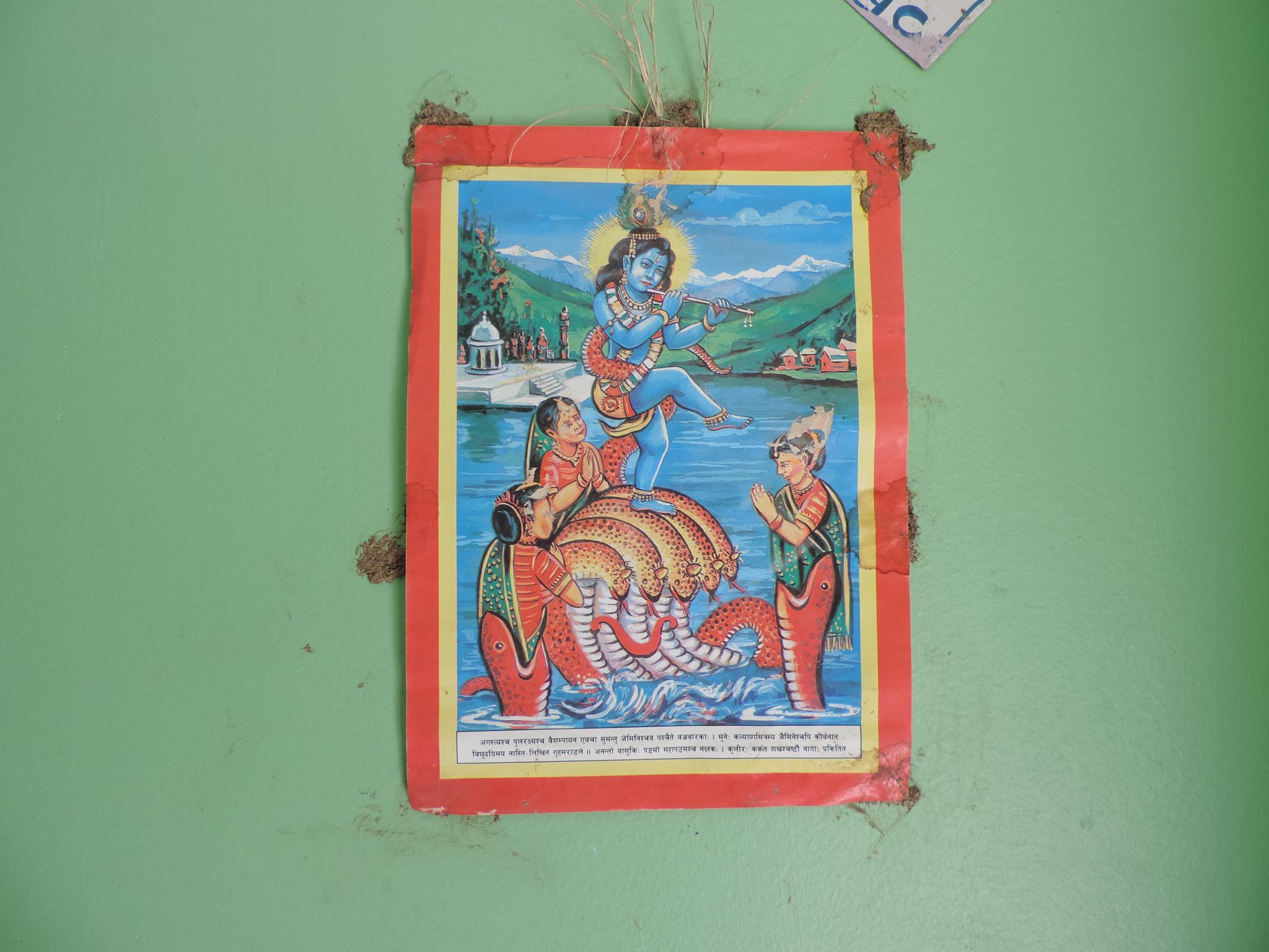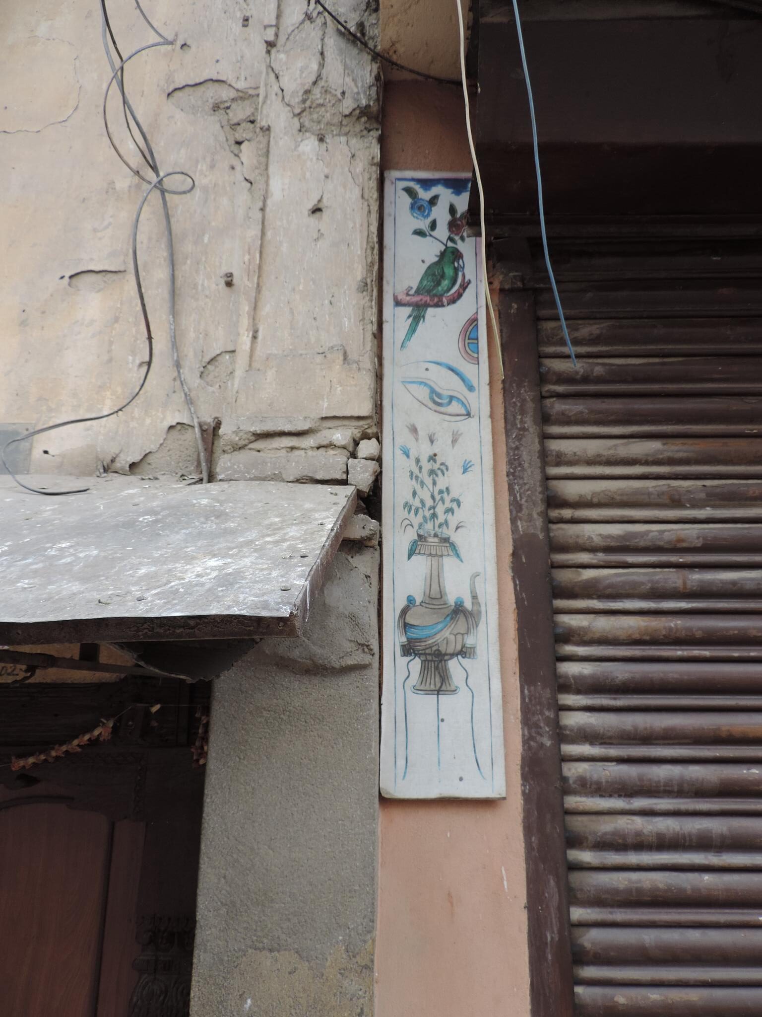 In Kathmandu and Patan, you often see small stone or terracotta tiles with religious motifs placed near house entrances. These elements are part of traditional Newar architecture and are generally referred to as religious relief panels, protective tiles, or small outdoor household shrines. They are typically made of carved stone, fired clay, or more rarely metal. These tiles are not merely decorative but serve with religious purposes as protective symbols against misfortune. At the same time, they function as miniature shrines where residents offer flowers, rice, or incense. The handmade artworks often depict deities such as Krishna, Shiwa, Ganesha, Hanuman, Saraswati or Buddha, as well as protective symbols, mandalas, and mythical beings. Their placement at the entrance is intentional, because the doorway is seen as a transitional space between the outside world and the private home, which the depicted deities are meant to protect, bless, and keep spiritually pure. Besides the numerous tiles, there are also paste up works, wooden boards or wall paintings around the entrance doors.
