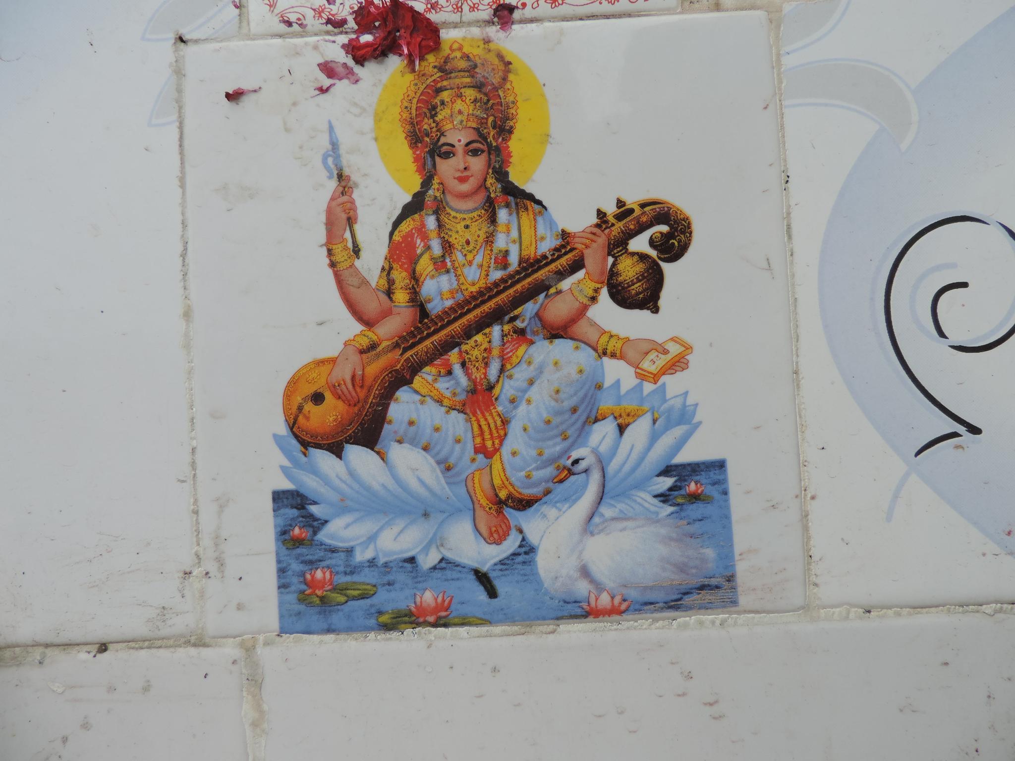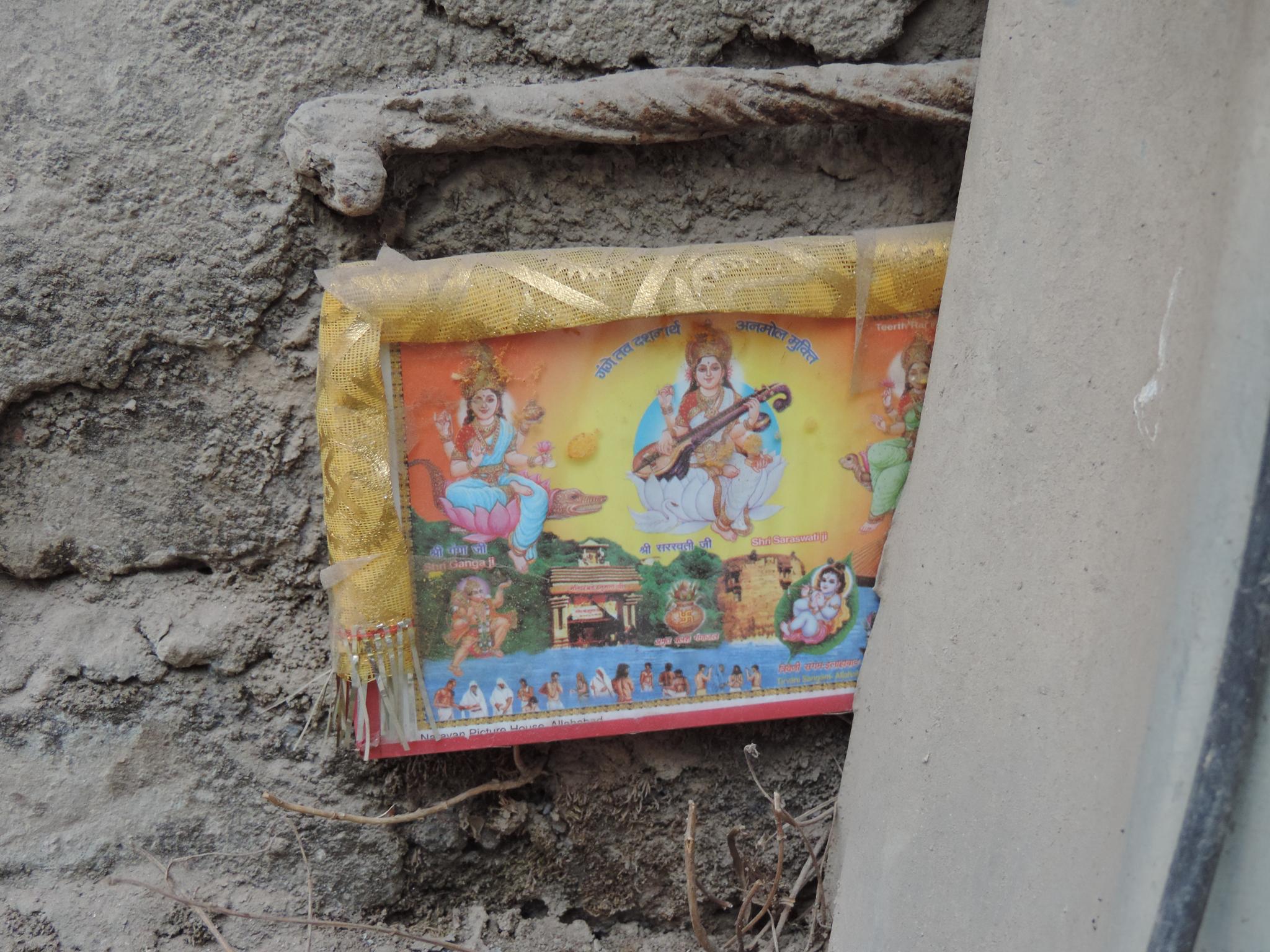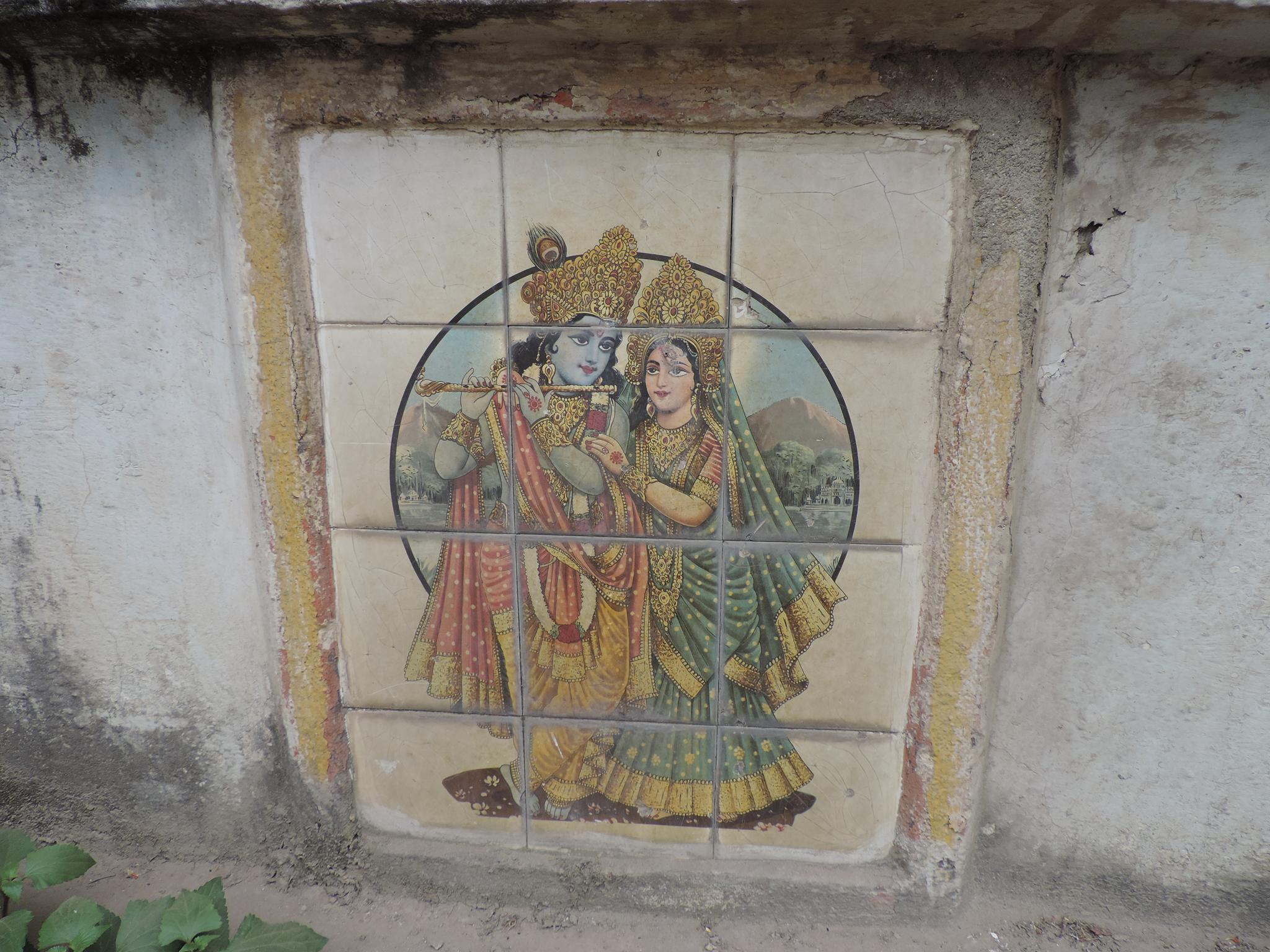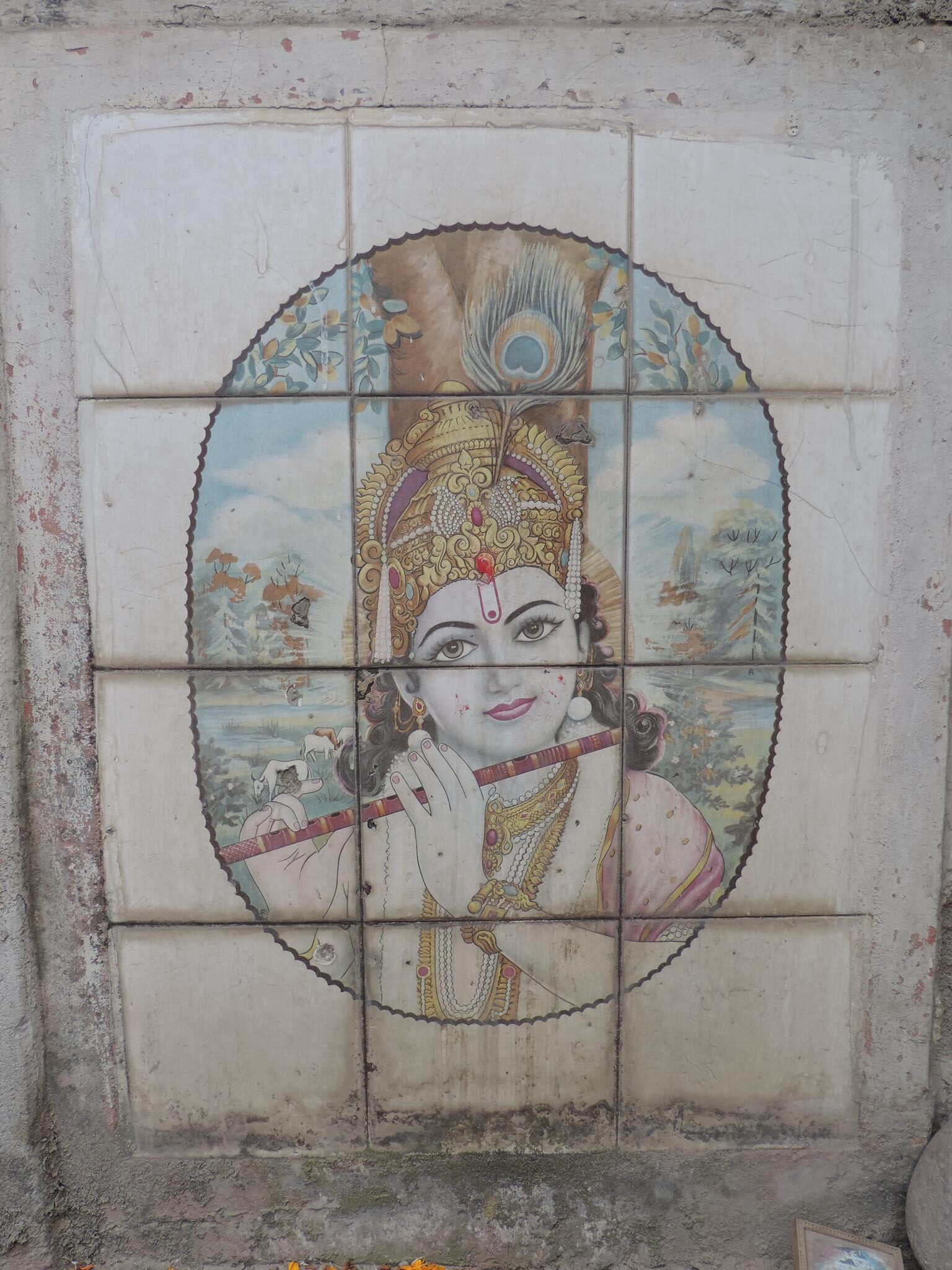In Kathmandu and Patan, you often see small stone or terracotta tiles with religious motifs placed near house entrances. These elements are part of traditional Newar architecture and are generally referred to as religious relief panels, protective tiles, or small outdoor household shrines. They are typically made of carved stone, fired clay, or more rarely metal. These tiles are not merely decorative but serve with religious purposes as protective symbols against misfortune. At the same time, they function as miniature shrines where residents offer flowers, rice, or incense. The handmade artworks often depict deities such as Krishna, Shiwa, Ganesha, Hanuman, Saraswati or Buddha, as well as protective symbols, mandalas, and mythical beings. Their placement at the entrance is intentional, because the doorway is seen as a transitional space between the outside world and the private home, which the depicted deities are meant to protect, bless, and keep spiritually pure. Besides the numerous tiles, there are also paste up works, wooden boards or wall paintings around the entrance doors.