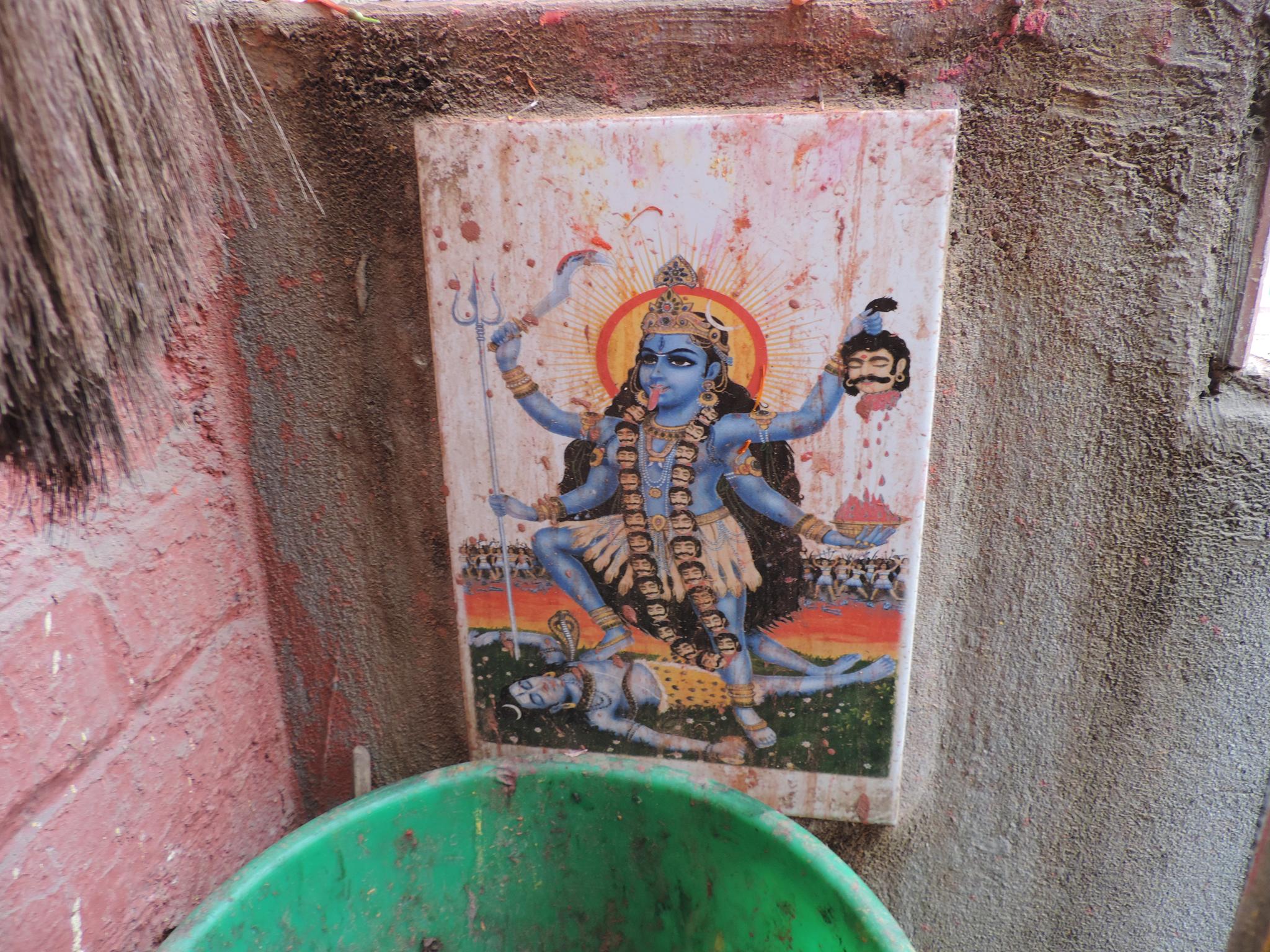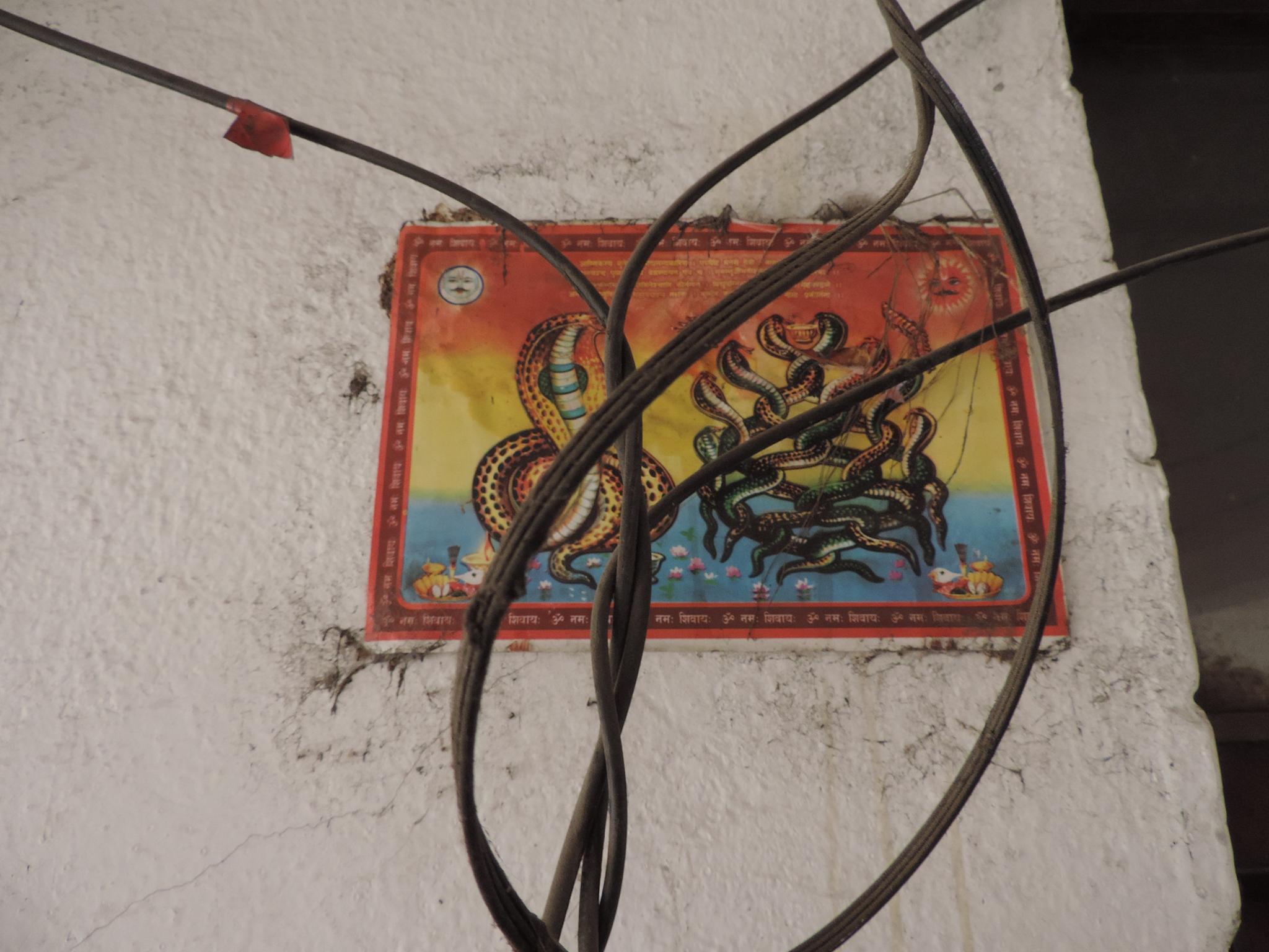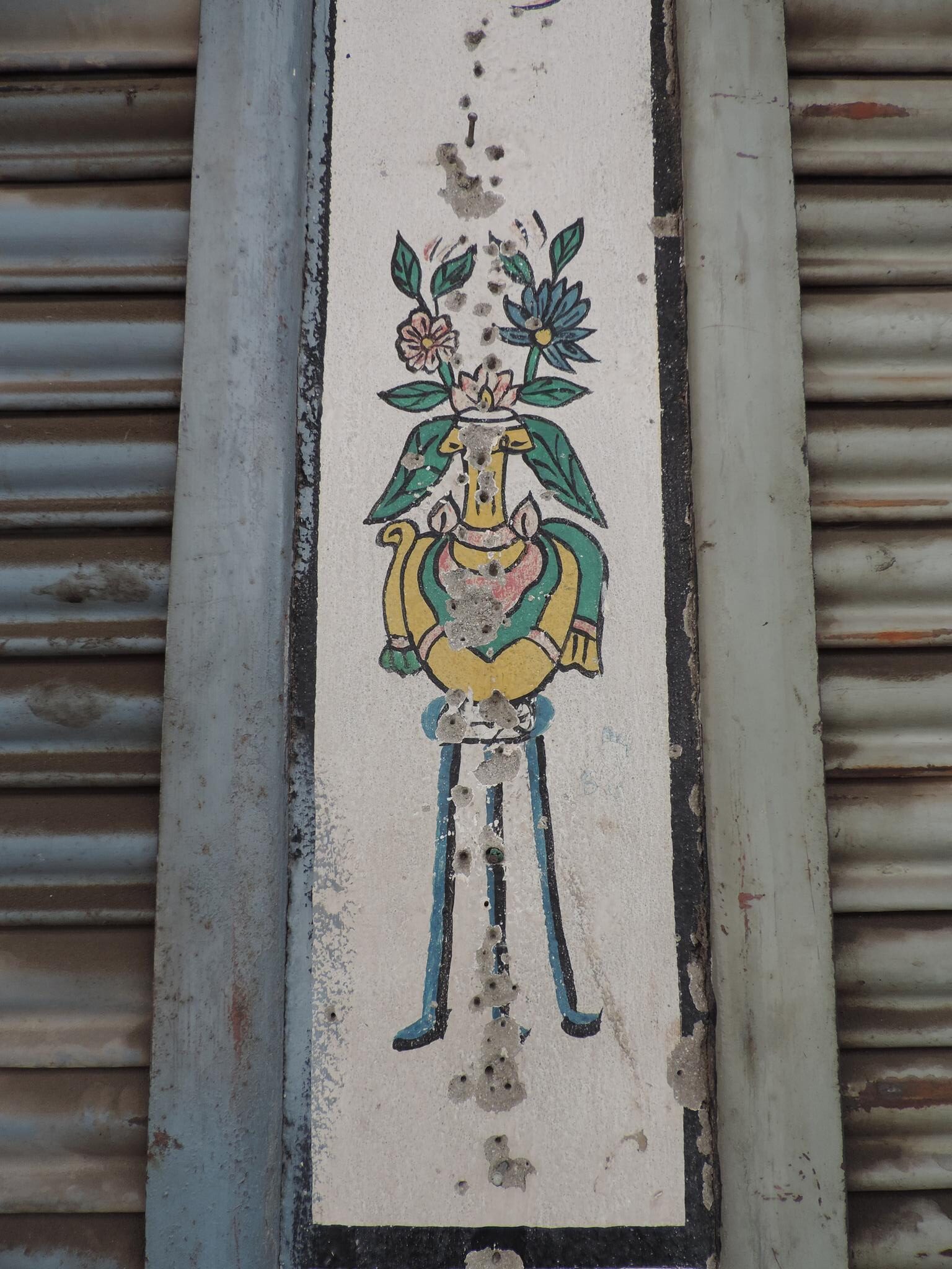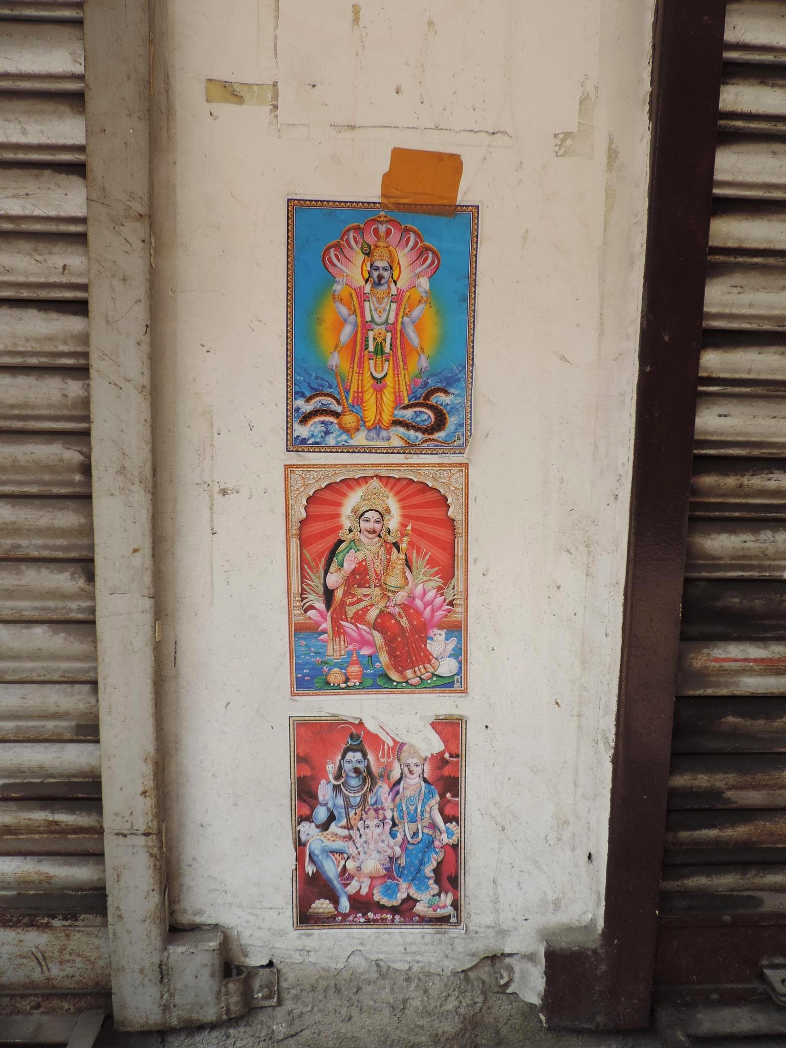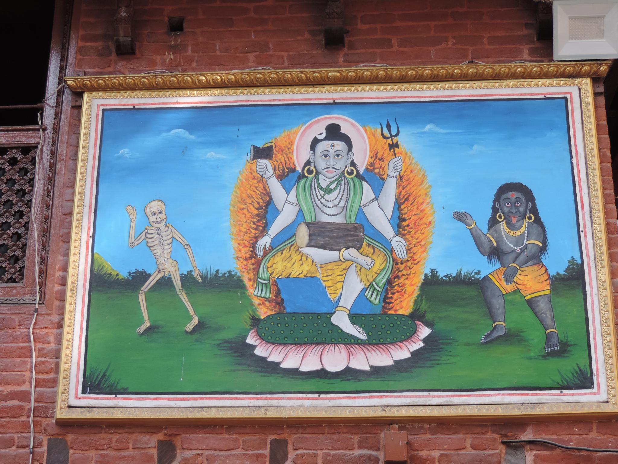 In Kathmandu and Patan, you often see small stone or terracotta tiles with religious motifs placed near house entrances. These elements are part of traditional Newar architecture and are generally referred to as religious relief panels, protective tiles, or small outdoor household shrines. They are typically made of carved stone, fired clay, or more rarely metal. These tiles are not merely decorative but serve with religious purposes as protective symbols against misfortune. At the same time, they function as miniature shrines where residents offer flowers, rice, or incense. The handmade artworks often depict deities such as Krishna, Shiwa, Ganesha, Hanuman, Saraswati or Buddha, as well as protective symbols, mandalas, and mythical beings. Their placement at the entrance is intentional, because the doorway is seen as a transitional space between the outside world and the private home, which the depicted deities are meant to protect, bless, and keep spiritually pure. Besides the numerous tiles, there are also paste up works, wooden boards or wall paintings around the entrance doors.