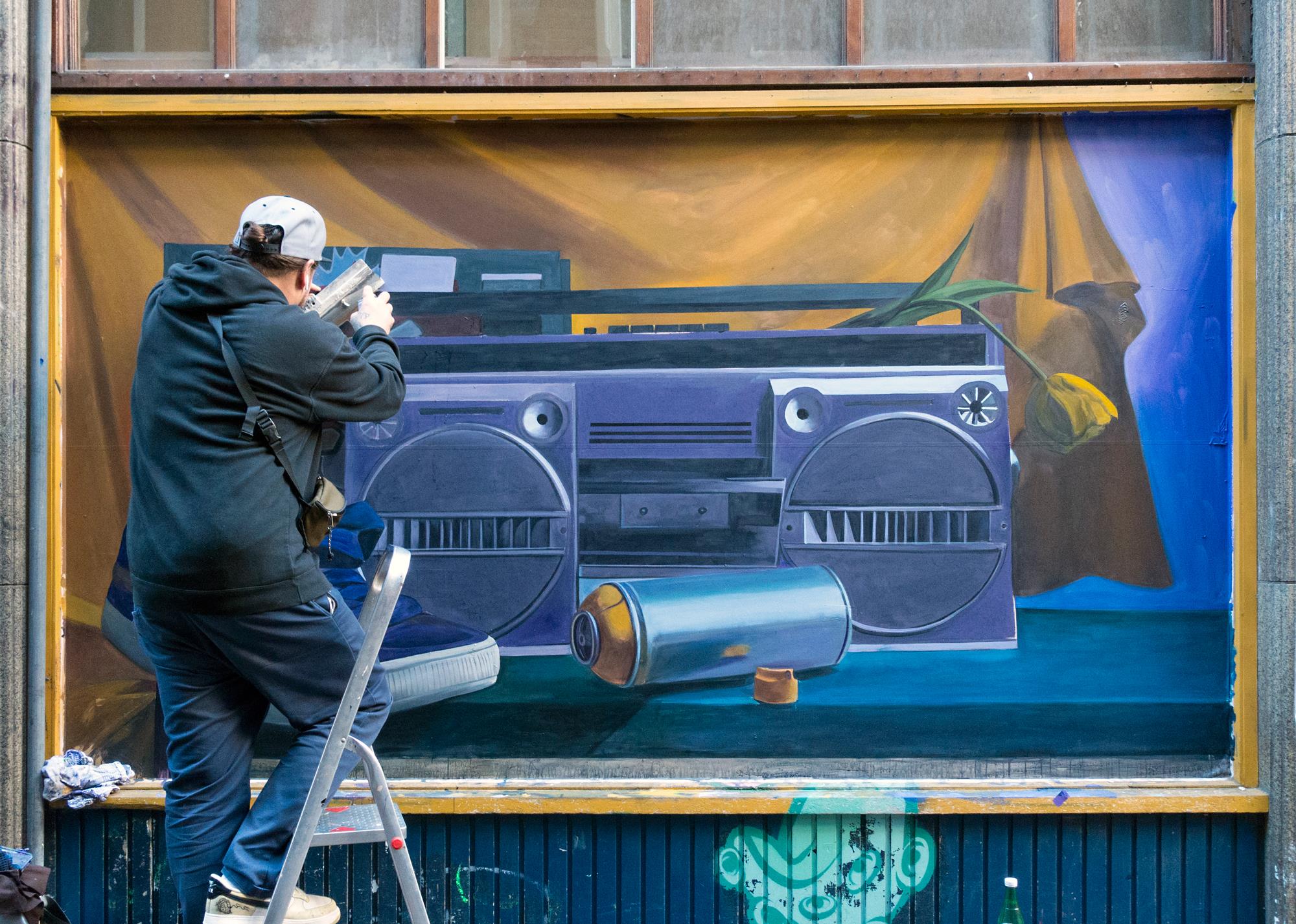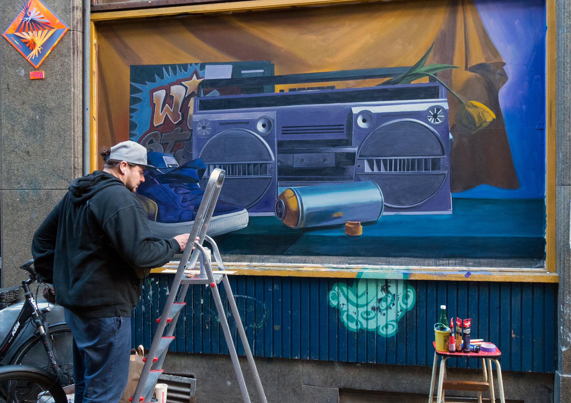 On the façade next to the Schoenreparatie there are two wall surfaces especially for urban art and here you can always find changing great works by different artists. The two surfaces are covered with wooden frames, making the works look like pictures hanging in a street museum. Check out as well the artworks wall just across the alley at Gravenstraat 2. There are more objects of this installation series located all over Amsterdam which we compiled on a collection page.