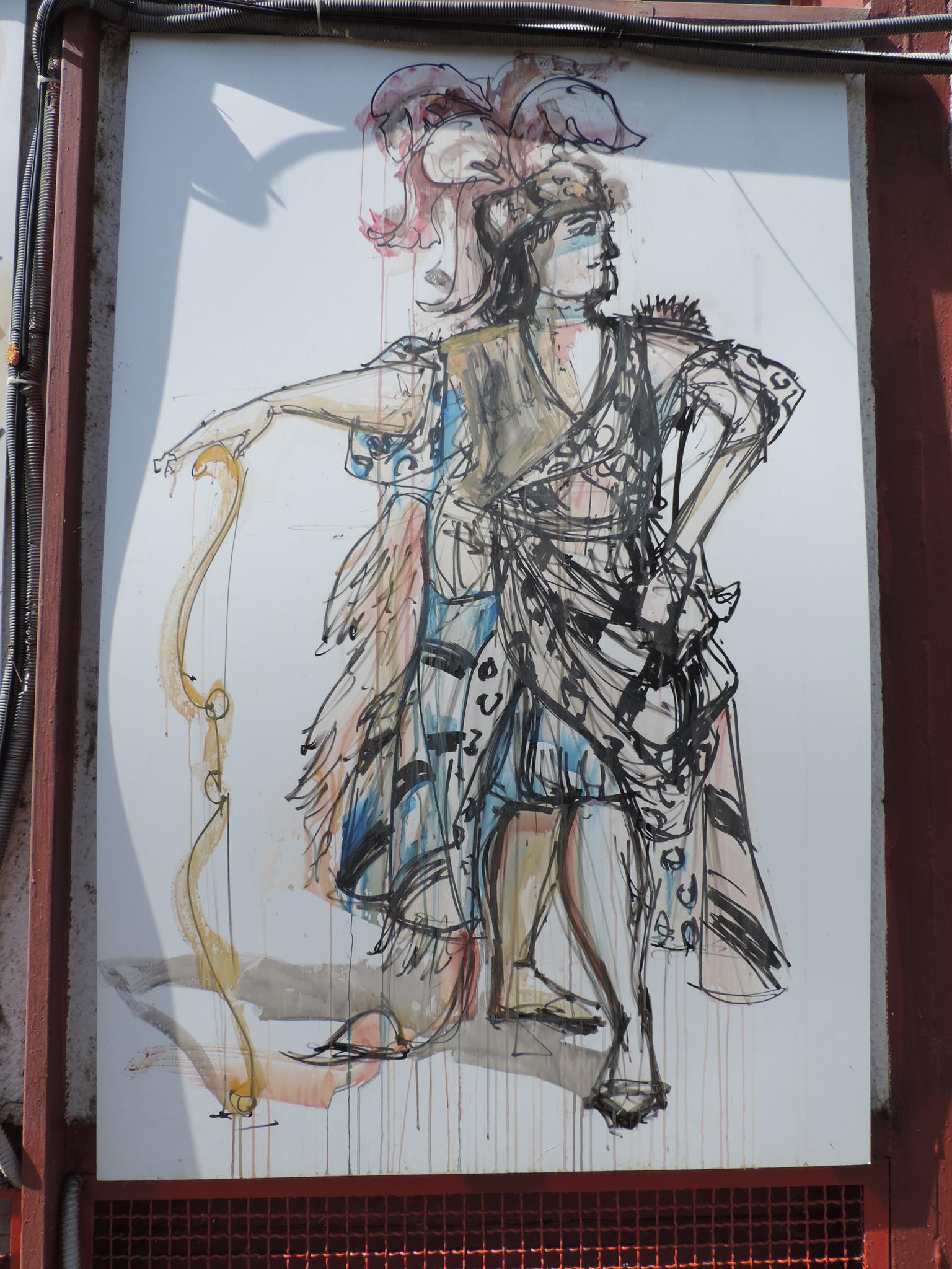 The following artworks represent scenes from the play „Colomba, Jean Anou“, a comedy in four acts directed by Dimitar Kostarov. It was the very first premiere in this building and the previous theater on 19the February 1965. As a connection to the today’s TEATAR KOMEDIJA several artworks of the series show scenes from „Ah, my love“ with text and direction by Kole Angelovski.  It was the first premiere at the TEATAR KOMEDIJA on 27th March 2012.