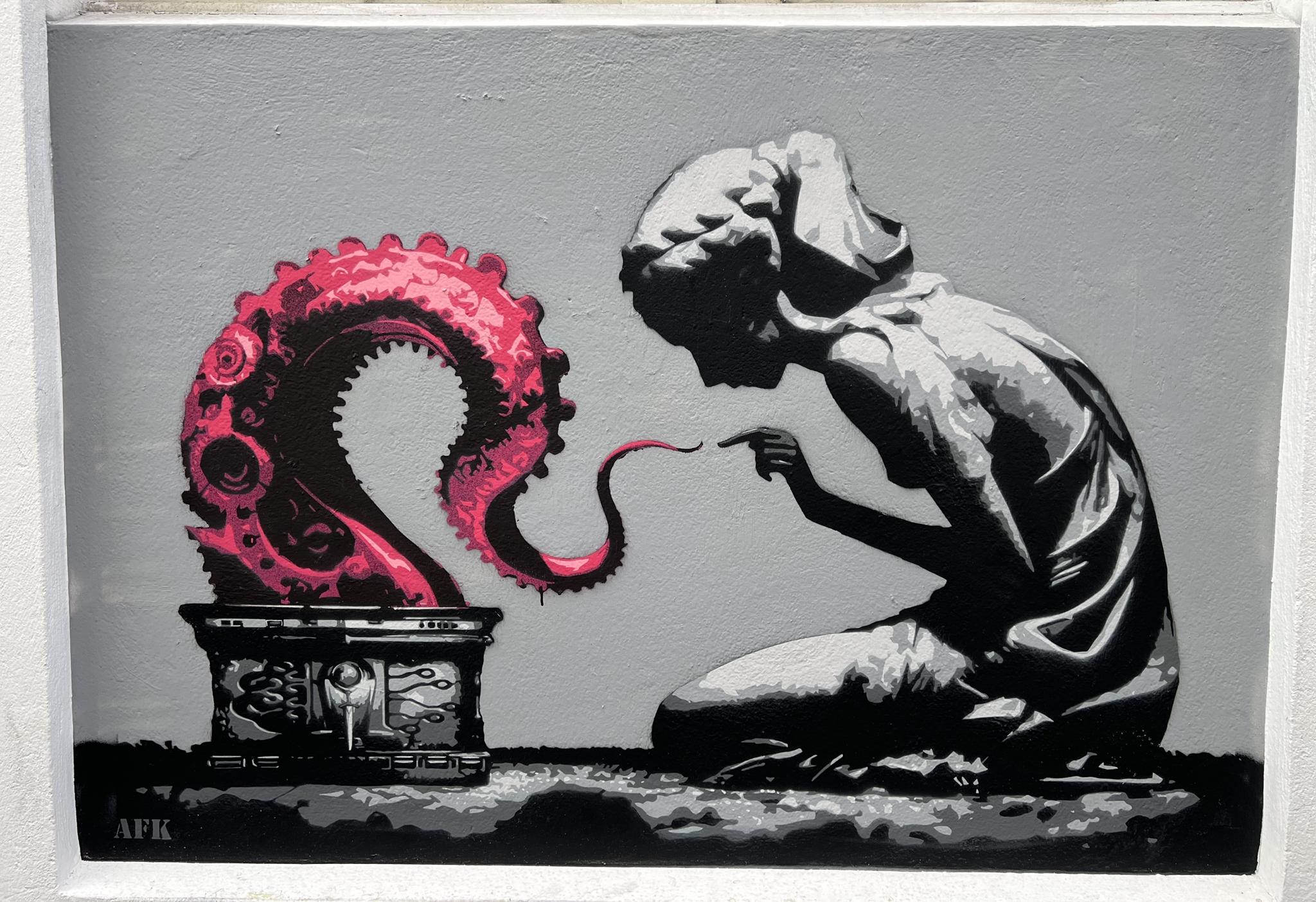 The artist about the artwork: „Ah, yes, the AI genie is out of the bottle and we can finally breathe a sigh of relief. Who needs pesky things like critical thinking and human agency when we can just ask Siri, right? And why bother with the nuances of human experience or our messy emotions when all of life’s problems can be quantified, fed into a machine, and solved with a perfectly optimized algorithm. Now that’s beauty! And gone are the days of grinding away to hone our skills. Now we can all be content creators, at just the touch of a button. Yay!! Sure, there’ll be some challenges along the way, like rampant job displacement and algorithmic bias, but I’m sure we’ll figure it out. But if not, with all the fancy new gadgets and endless content to distract us, we probably won’t notice anyway. Ahh, the comfort.“ – AFK