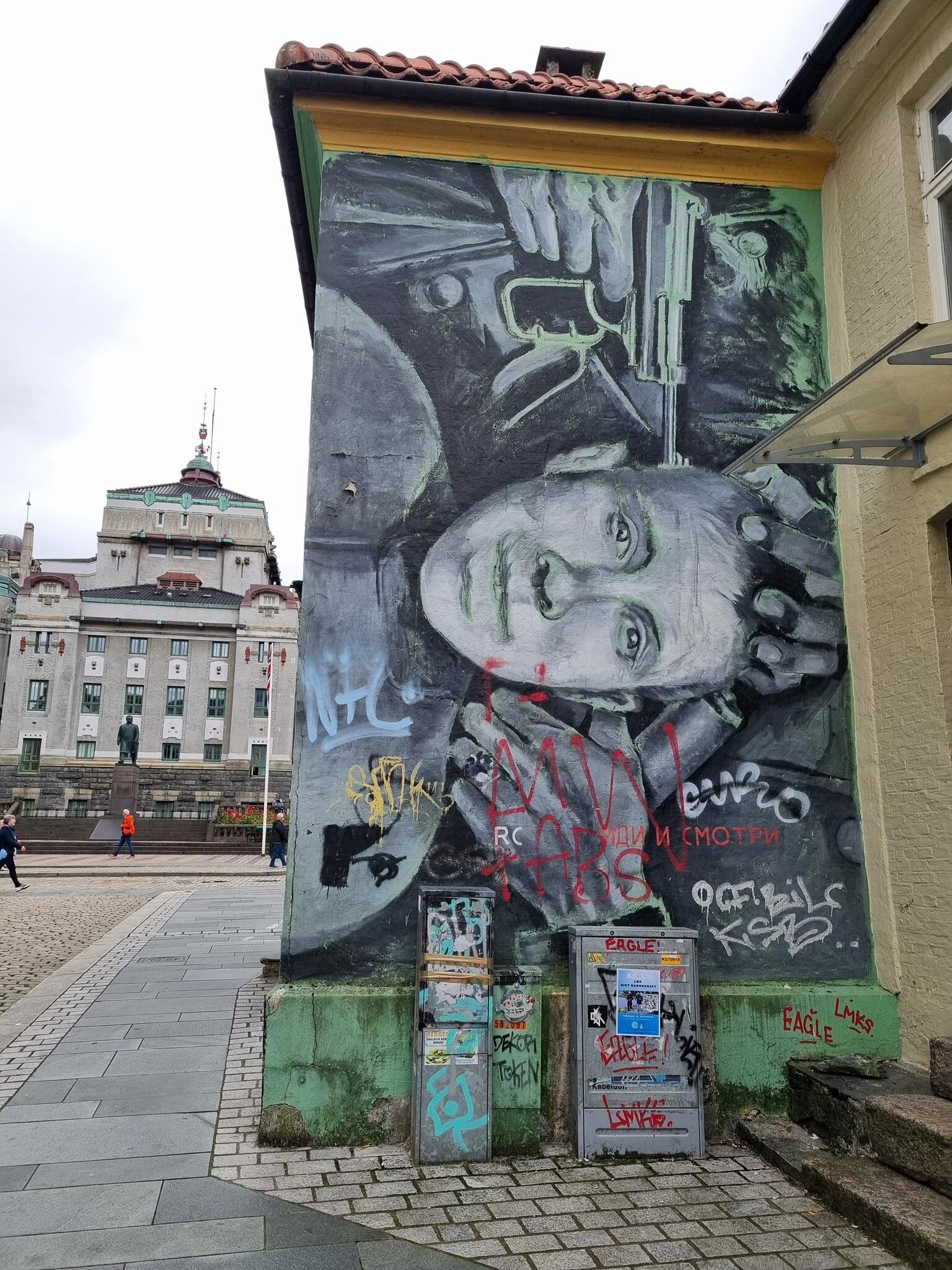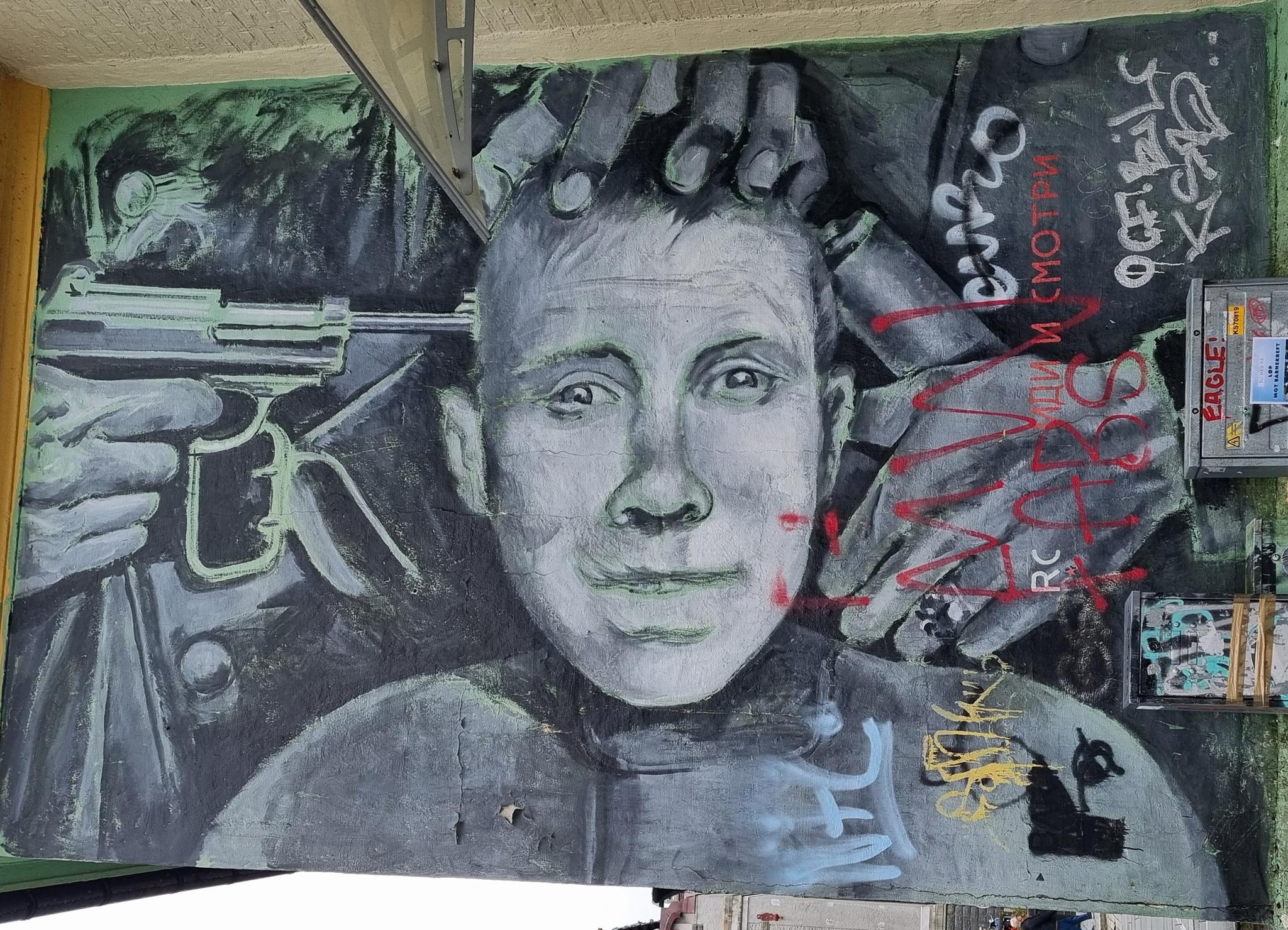 The mural at Sverres gate 4 by the artist RC depicts a scene from the famous Soviet anti-war movie „Come and See“ from 1985. The Russian original title is Иди и смотри.