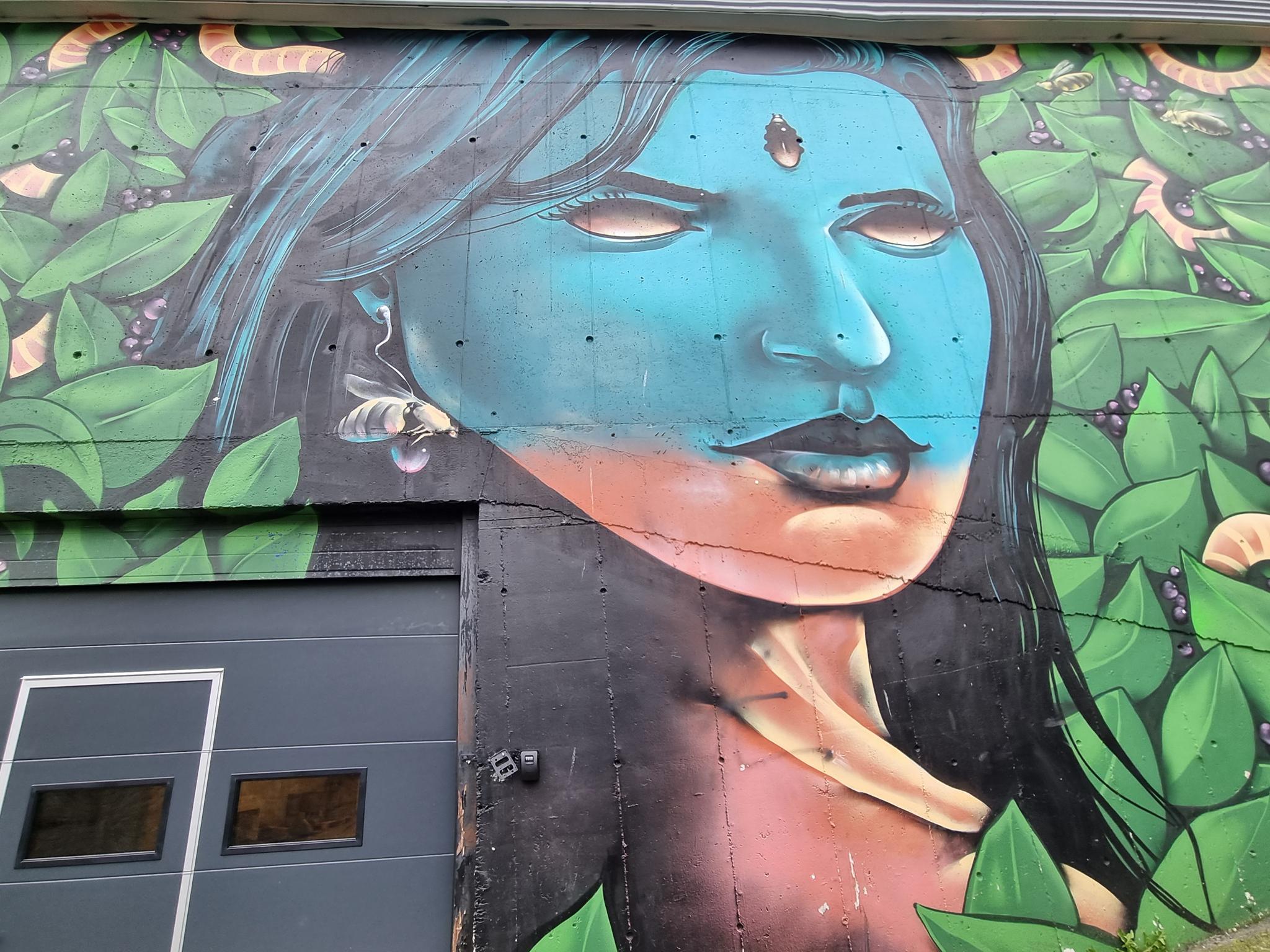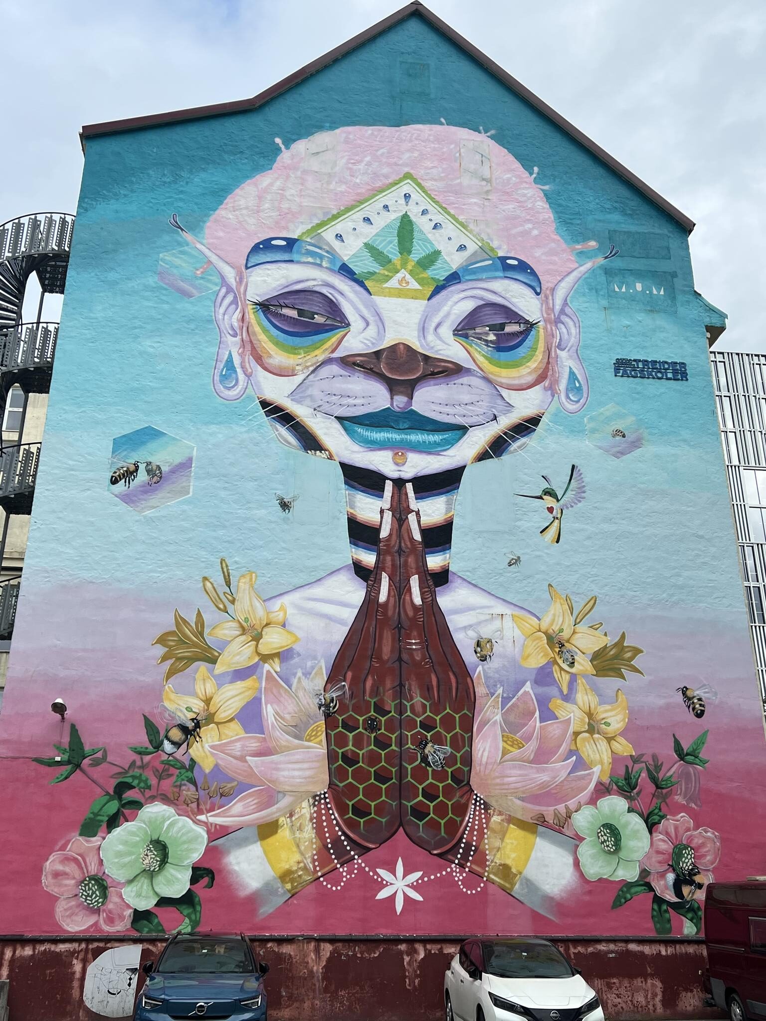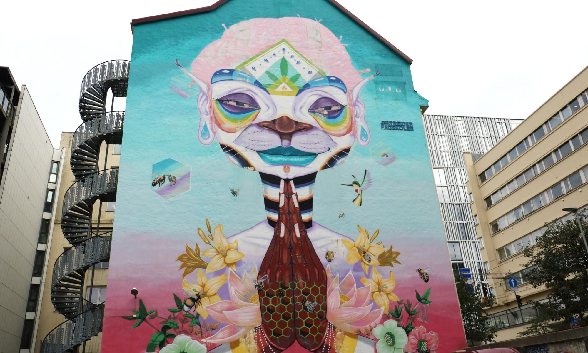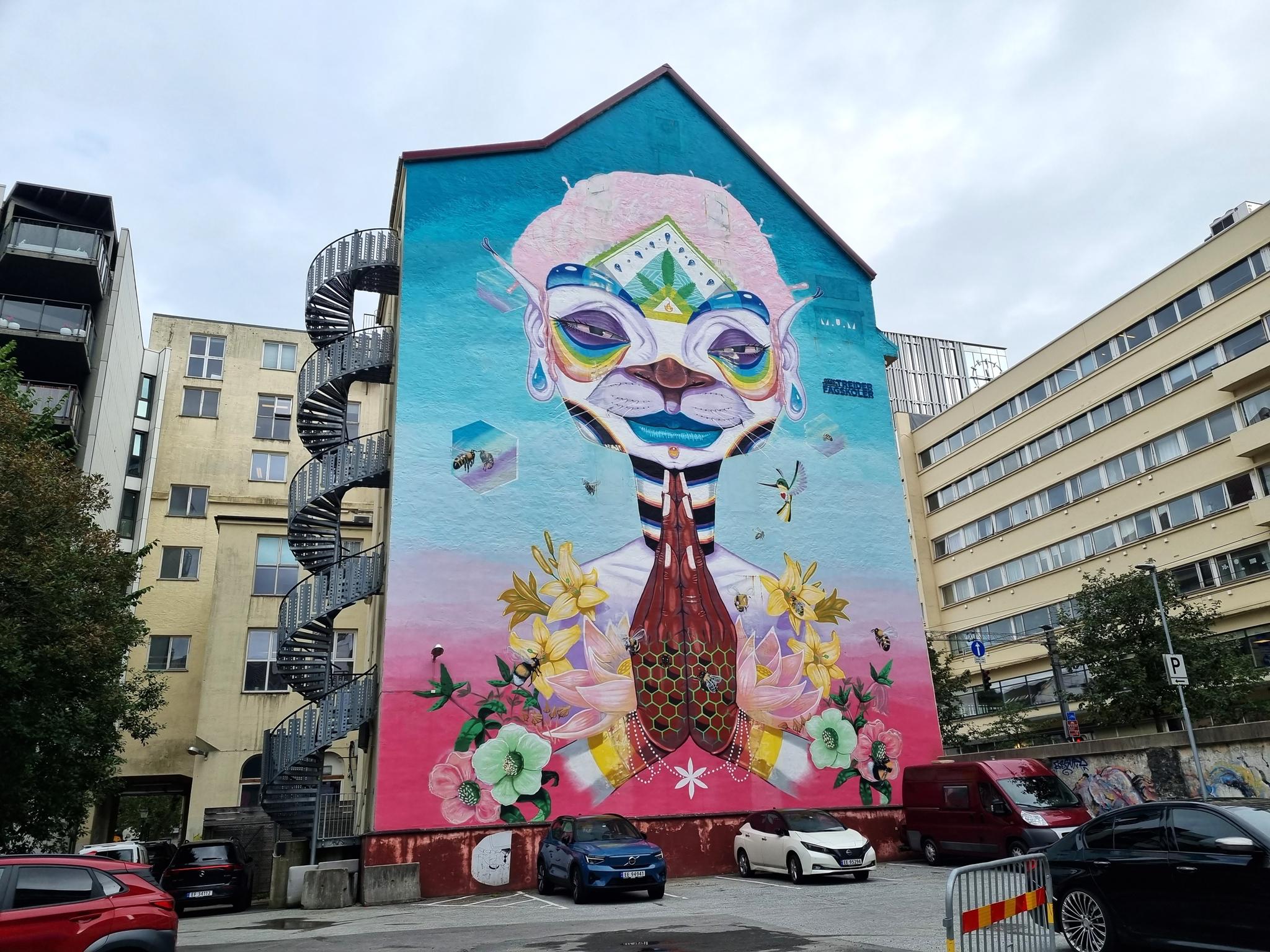 The 24-meter-high mural is located at St. Jakobs plass 9, just outside Bergen’s city center. It covers 400 square meters, spans eight floors and the Norwegian artist M.U.M. was working on it for 17 days to complete it. The image depicts a meditating figure, which, according to the artist, is meant to encourage a more conscious lifestyle and environmental activism. The bees and flowers symbolize nature, and the artwork draws attention to the decline of bee populations due to pesticides.