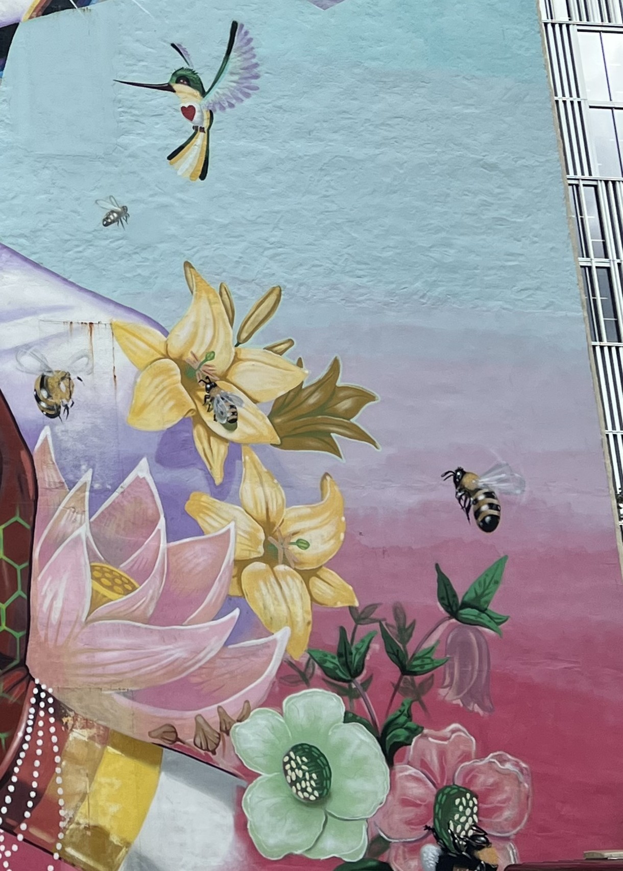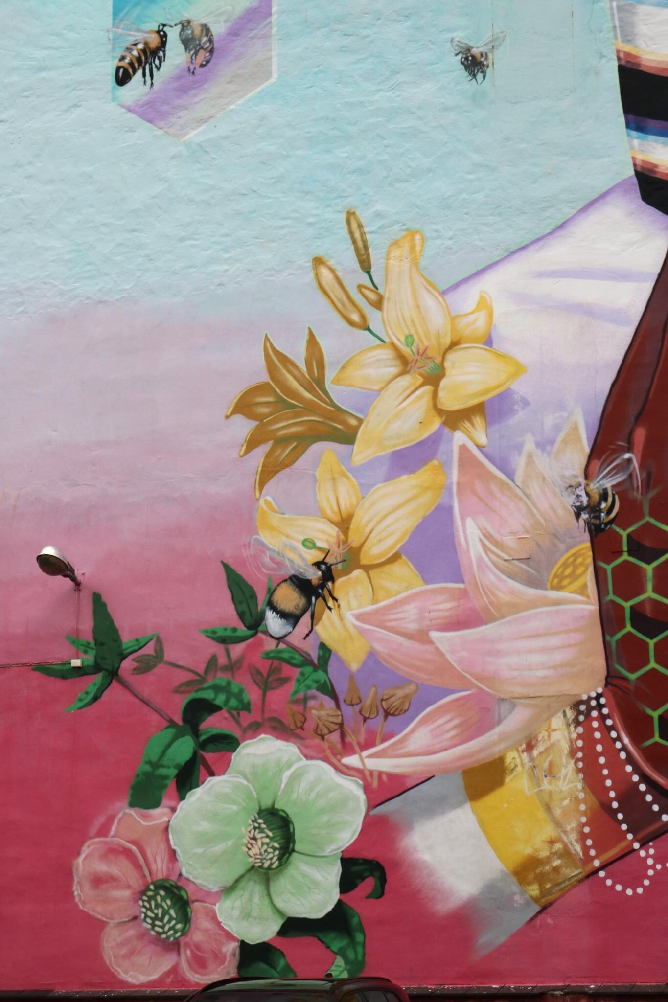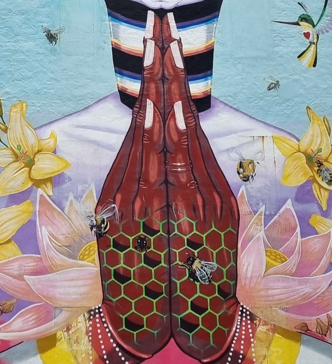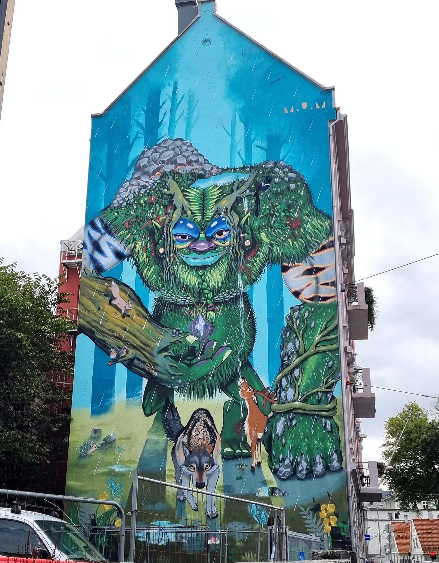 The 24-meter-high mural is located at St. Jakobs plass 9, just outside Bergen’s city center. It covers 400 square meters, spans eight floors and the Norwegian artist M.U.M. was working on it for 17 days to complete it. The image depicts a meditating figure, which, according to the artist, is meant to encourage a more conscious lifestyle and environmental activism. The bees and flowers symbolize nature, and the artwork draws attention to the decline of bee populations due to pesticides.
