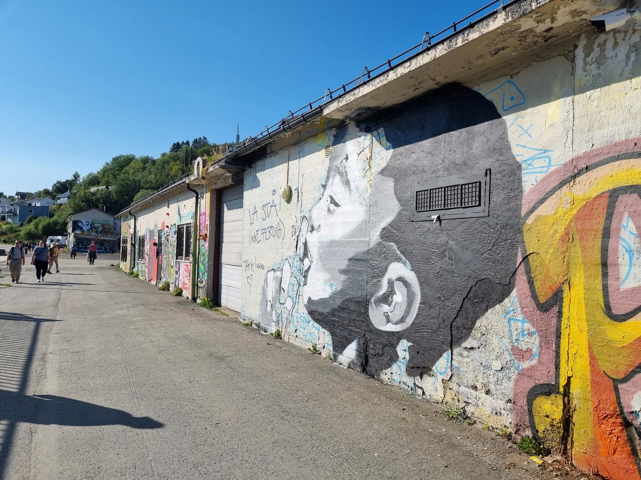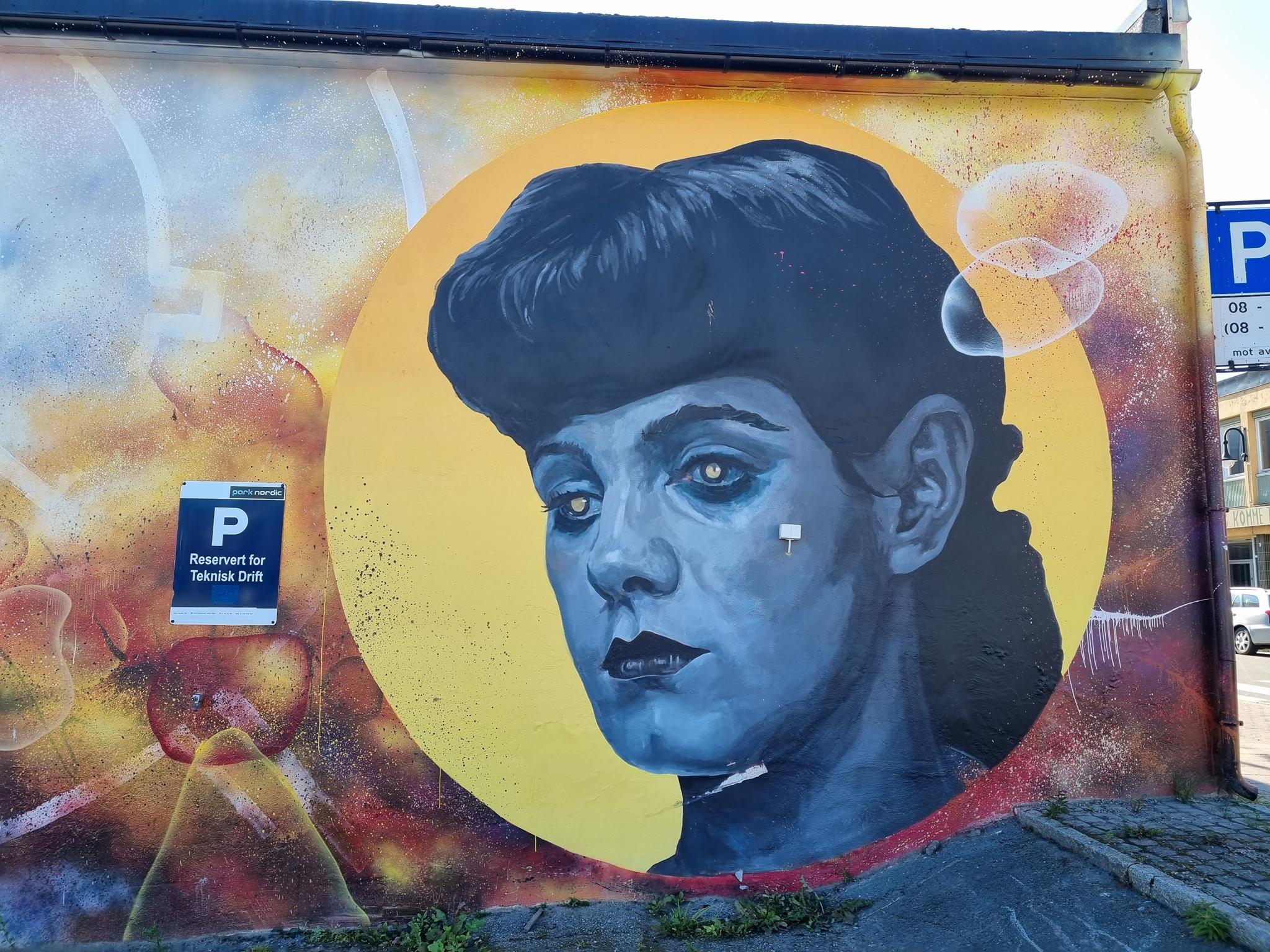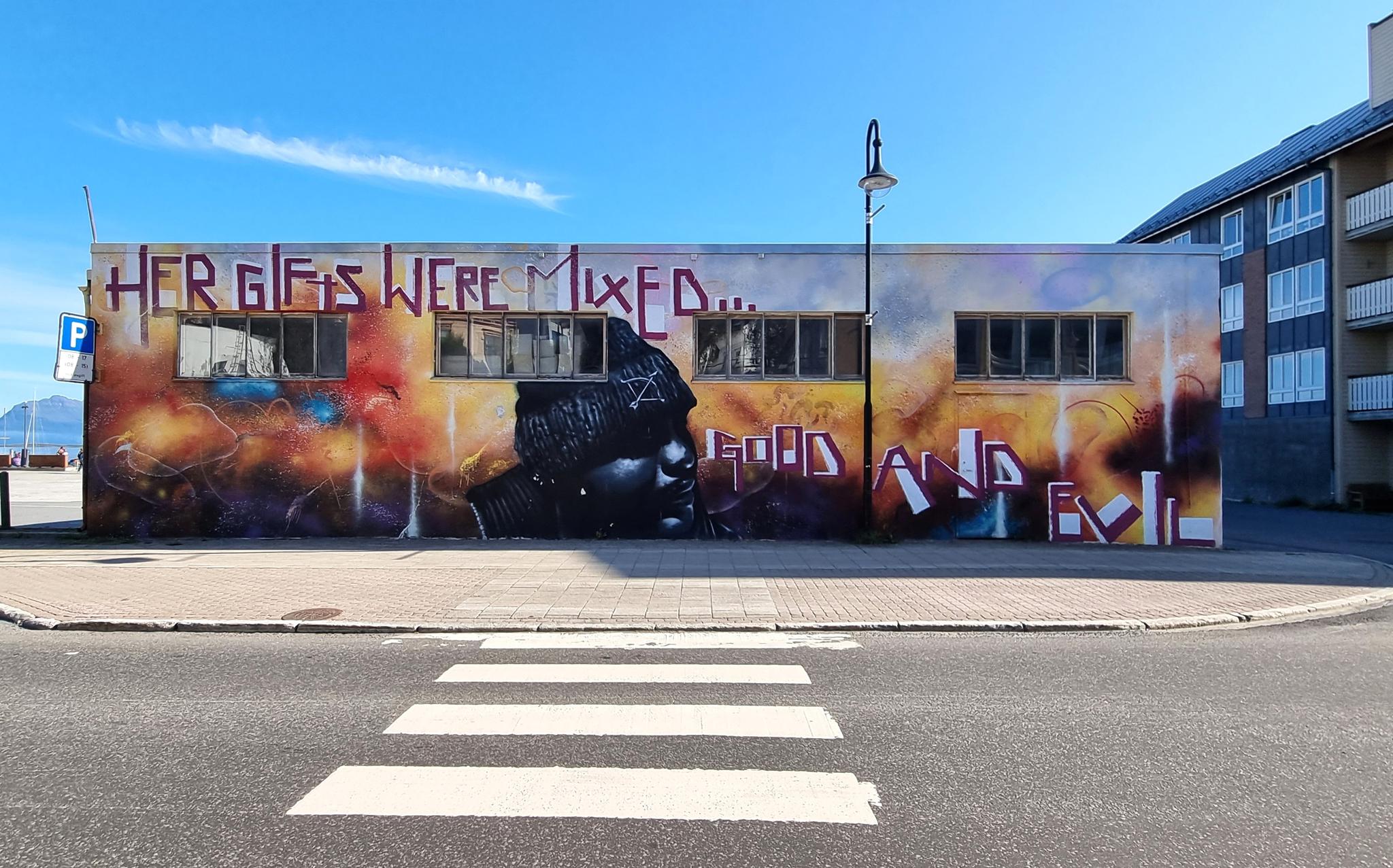 Harstad is a town in the province of Troms in northern Norway with a population of around 21.000. Worth seeing are the Tv-Tårnet observation tower, the Trondenes Center on the history of the Vikings, and the Trondenes Church, the world’s northernmost medieval stone church, built around 1250. It is located directly on the waterfront and is a historical landmark of the region. Not to be forgotten are the Folkeparken, the idyllic fjords, and the natural spectacle of the Northern Lights, which can be seen well from October to March. But the city offers not only colorful skies, but also colorful walls in the streets. Every year, the large music, theater, and art festival FESTSPILLENE I NORD NORGE, also known as the ARCTIC ARTS FESTIVAL, takes place here, and urban artworks by local artists are created for the occasion. The nordic artist group ARCTIC WRITERS are also active in Harstad time by time. Here we have a collection with magnificent creations photographed by graffiti hunter and streetart lover MAZZANTI. Check out her instagram channel, where she regularly presents great pictures from countries all over the world.