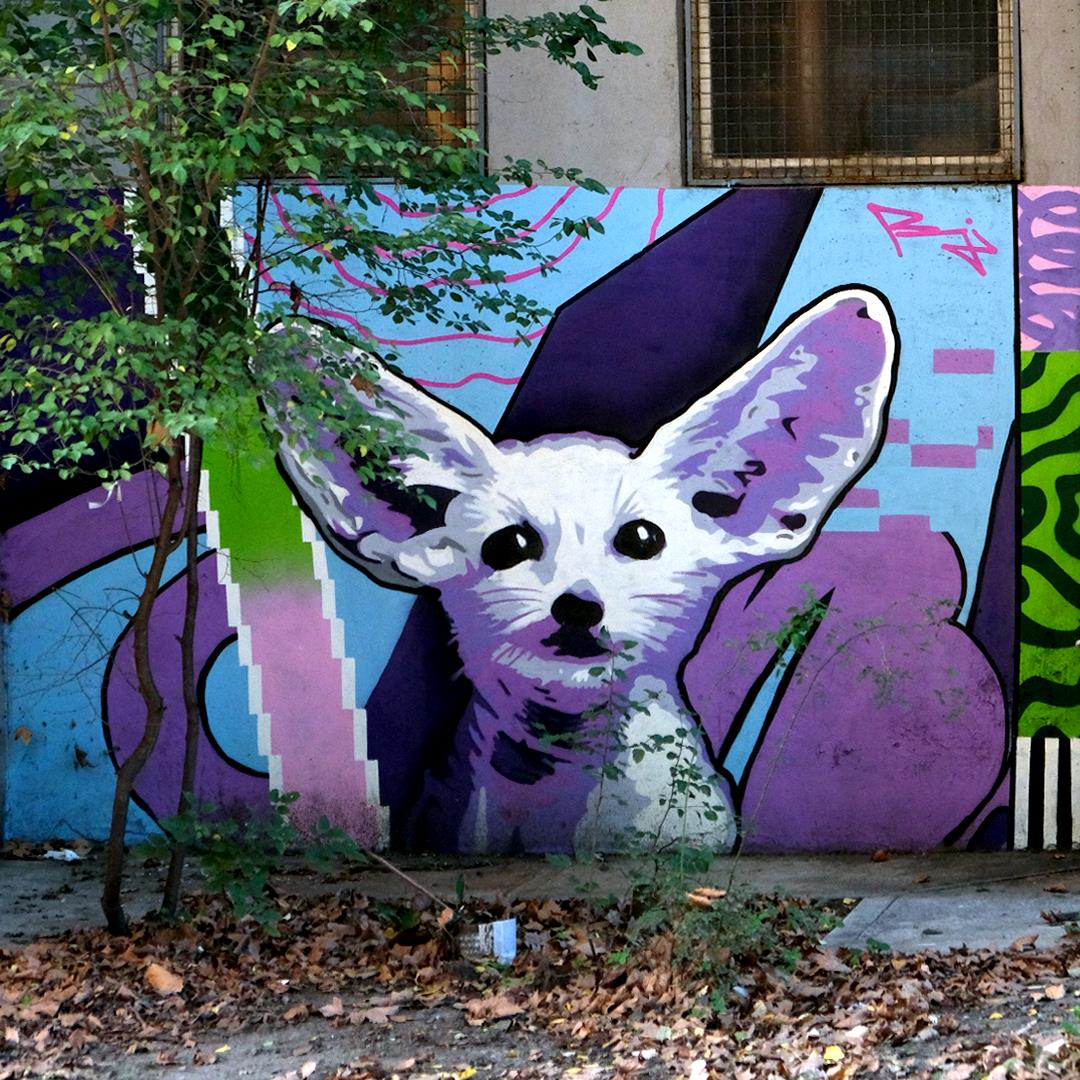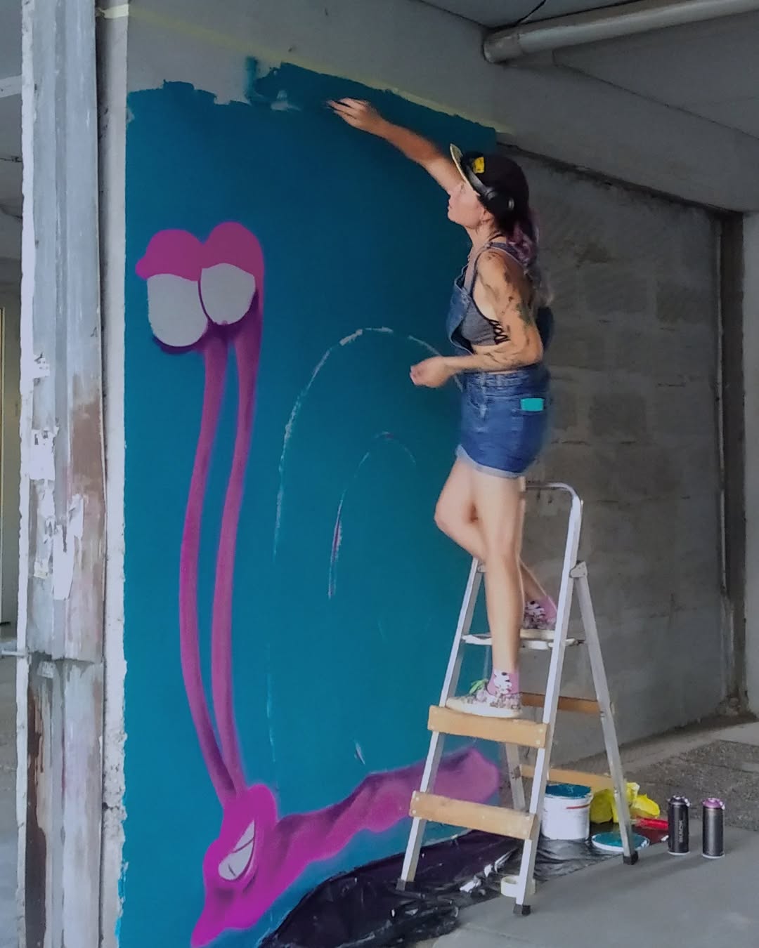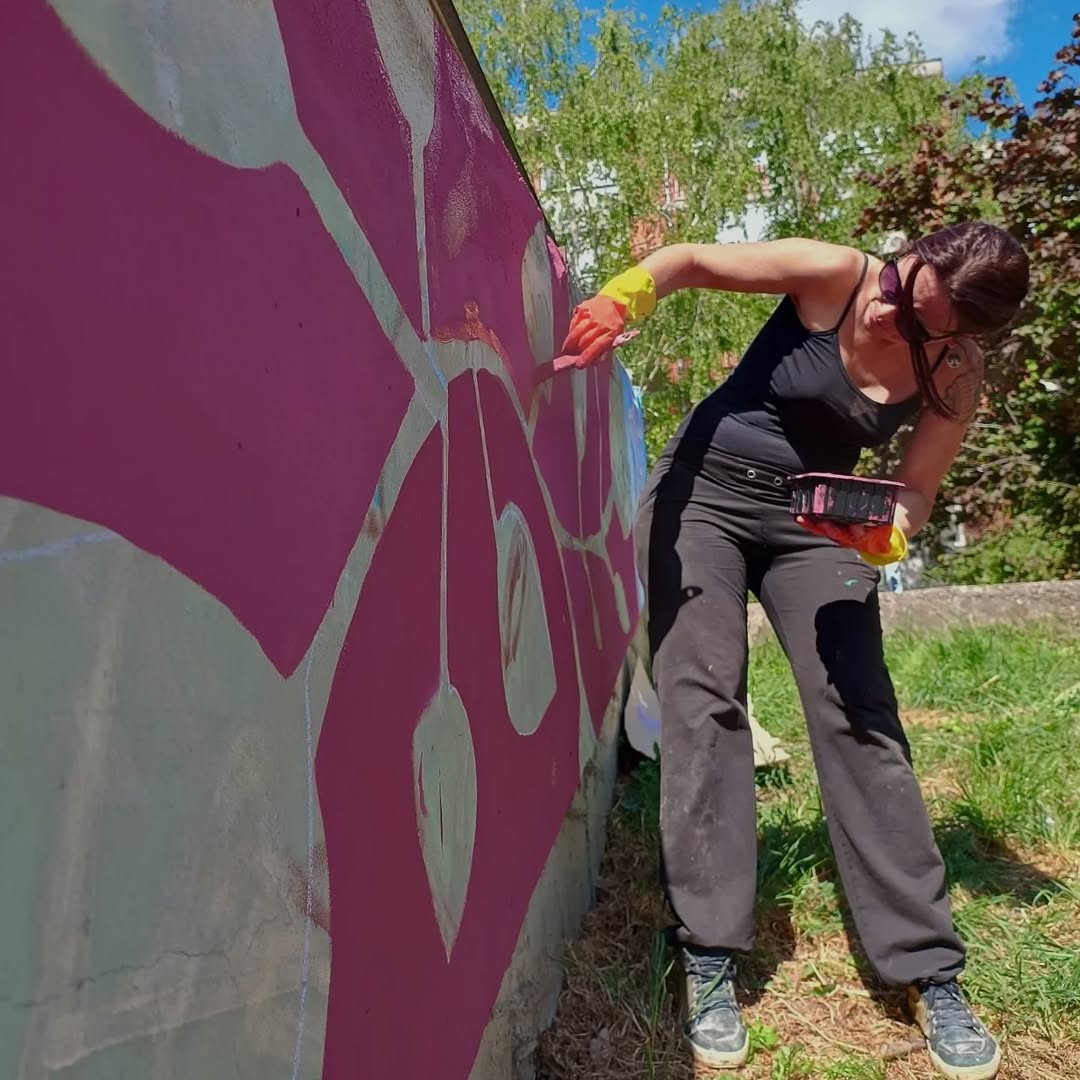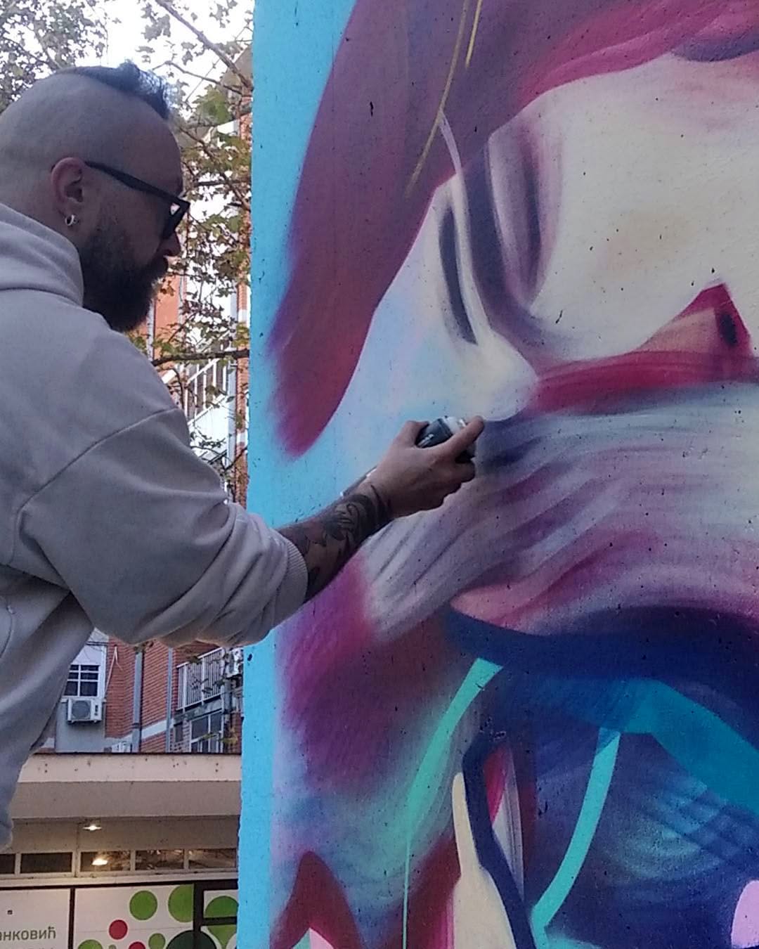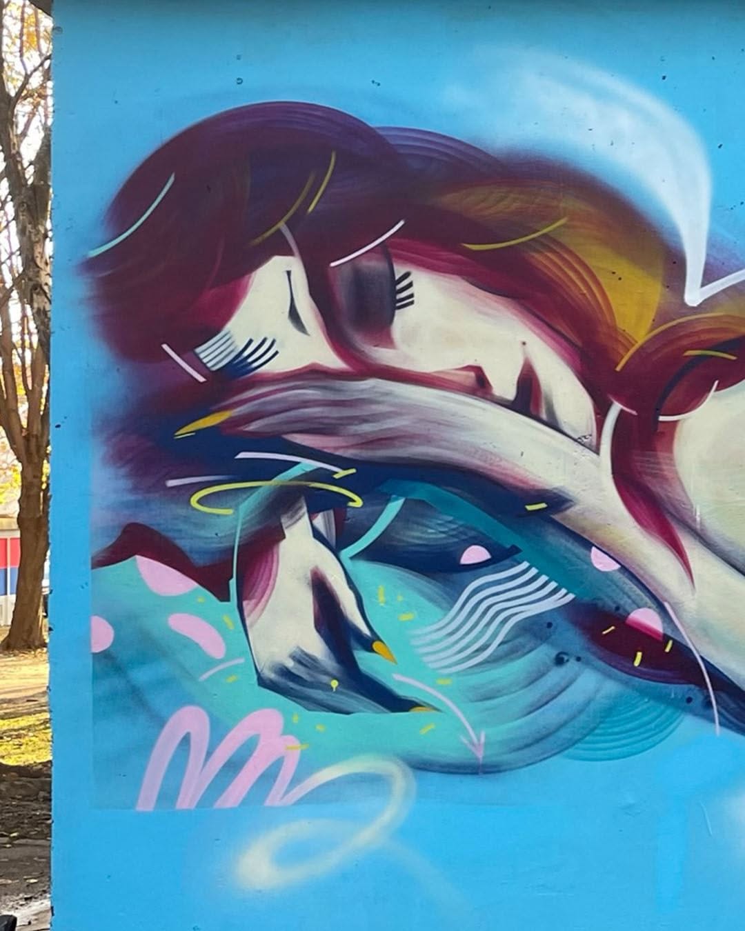 Maria came with her family to live in Novi Sad in 2024, and this piece in Avijaticarska Gallery is the first one that she painted in our city. Besides streetart, she makes dolls, and does tattoos as AEROGRIB – Avijaticarska Gallery