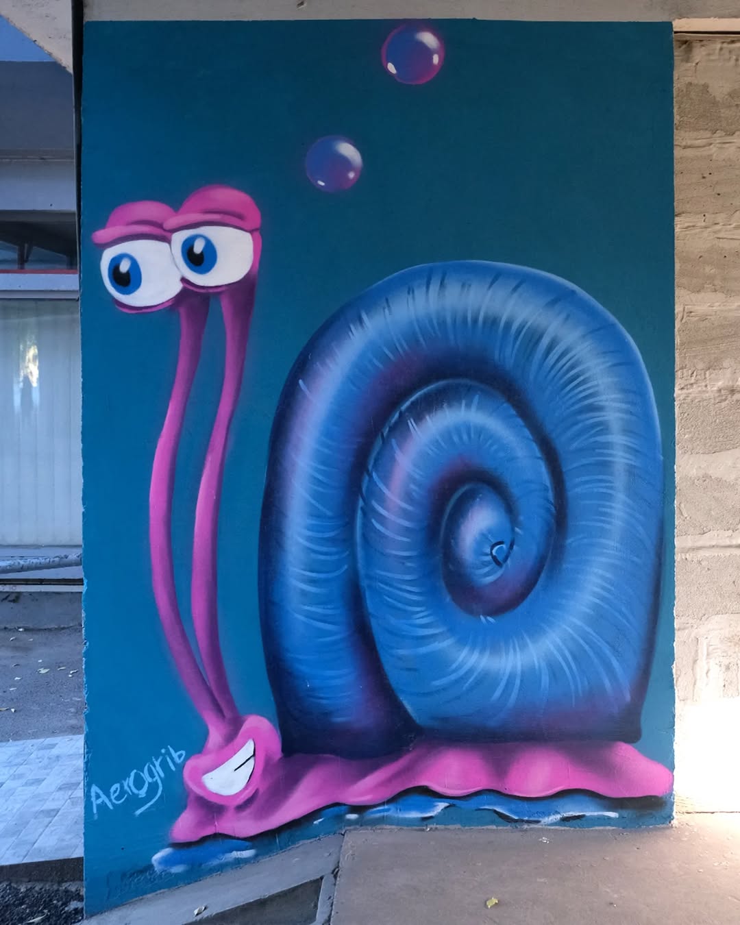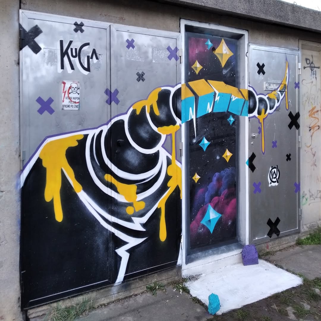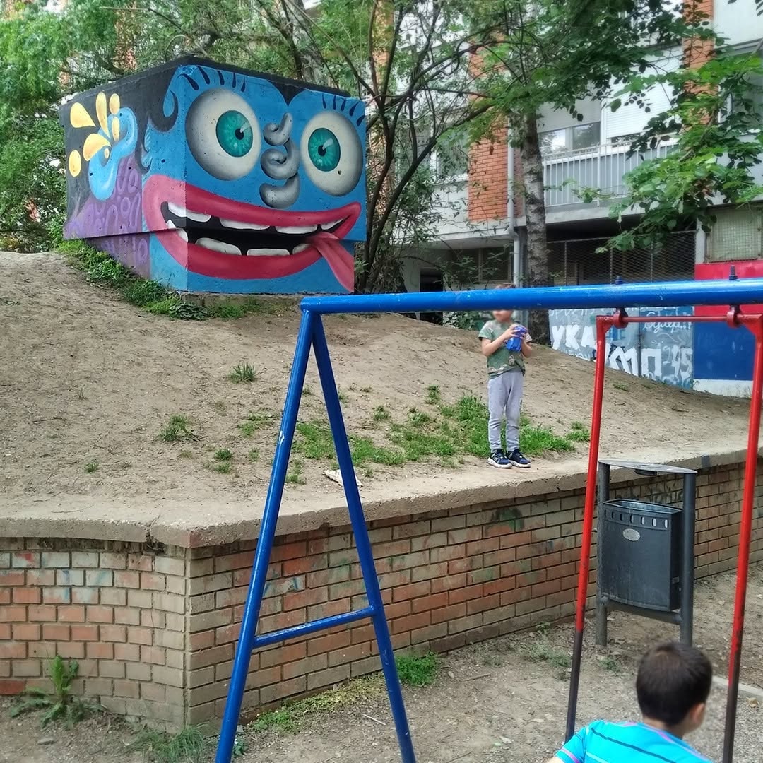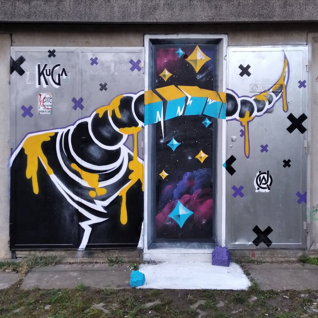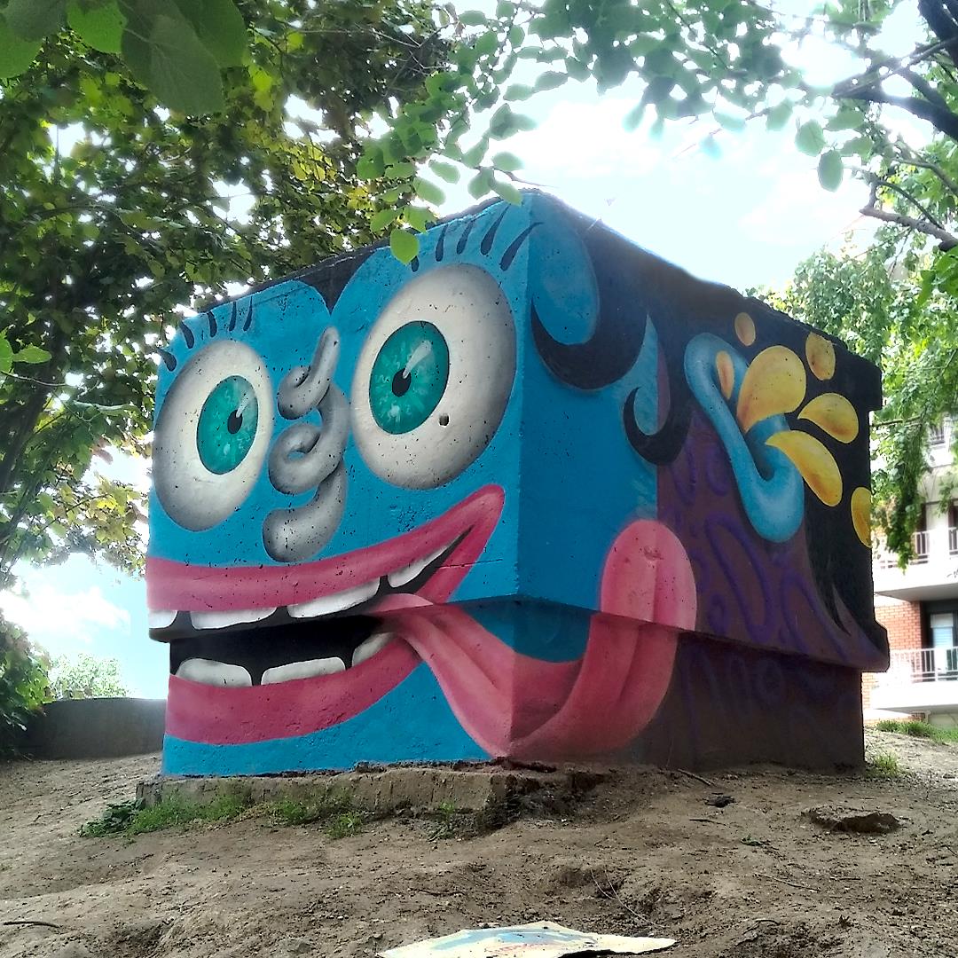 A piece from 2024. Since there’s a playground for children just underneath that atomic shelter, I’ve decided that I should paint something for the kids, so that they have something cool to look at there. Children from the neighbourhood wanted to help me at some point, so I gave them an assignment to paint the background. Since Theo DNK and Gre are a bit older, and they know how to work with spray paint, they painted some more serious parts of the piece. A cool detail is that you can go around the piece, and every angle looks slightly different. – SHPIRA
