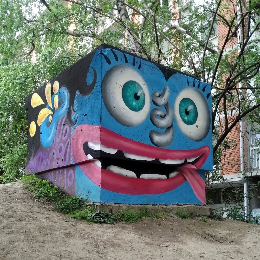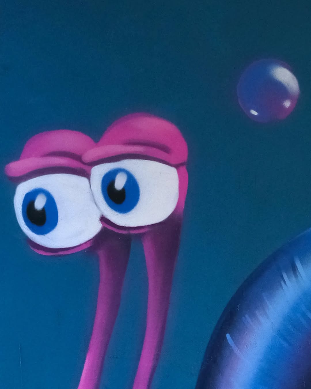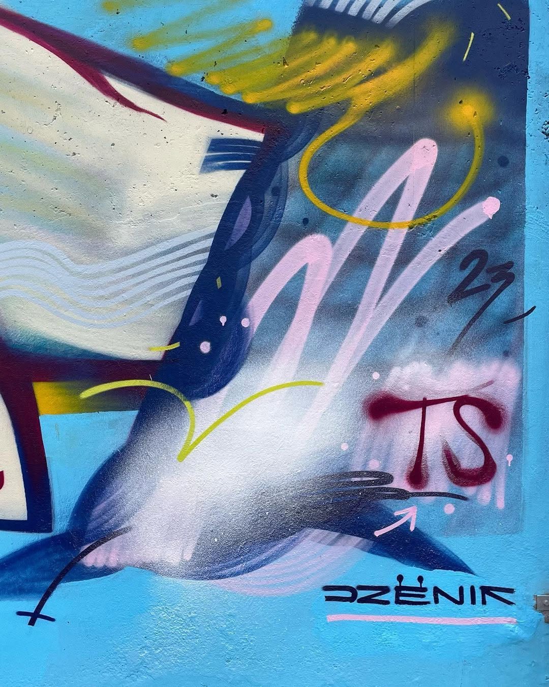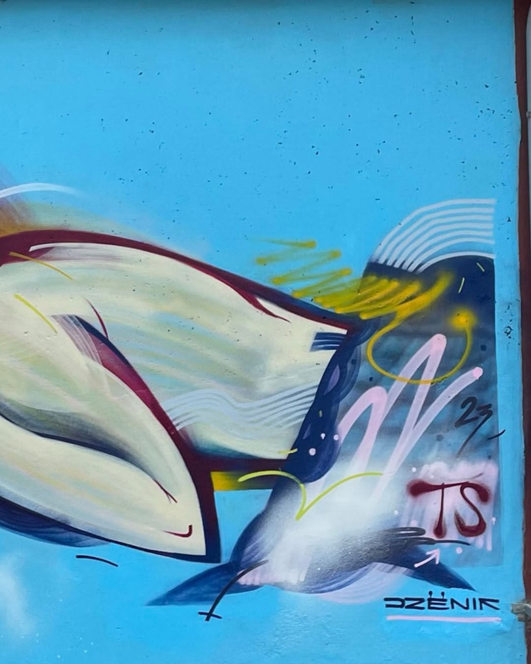 A piece from 2024. Since there’s a playground for children just underneath that atomic shelter, I’ve decided that I should paint something for the kids, so that they have something cool to look at there. Children from the neighbourhood wanted to help me at some point, so I gave them an assignment to paint the background. Since Theo DNK and Gre are a bit older, and they know how to work with spray paint, they painted some more serious parts of the piece. A cool detail is that you can go around the piece, and every angle looks slightly different. – SHPIRA