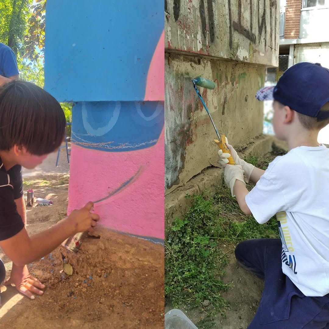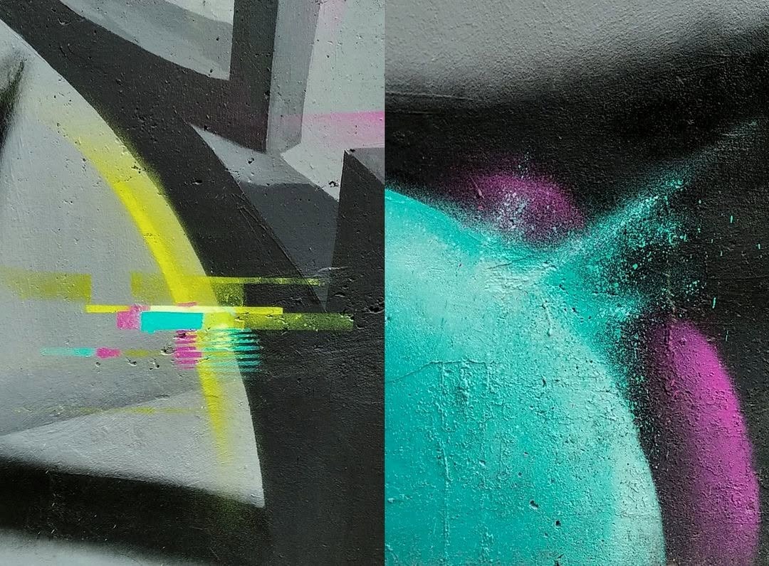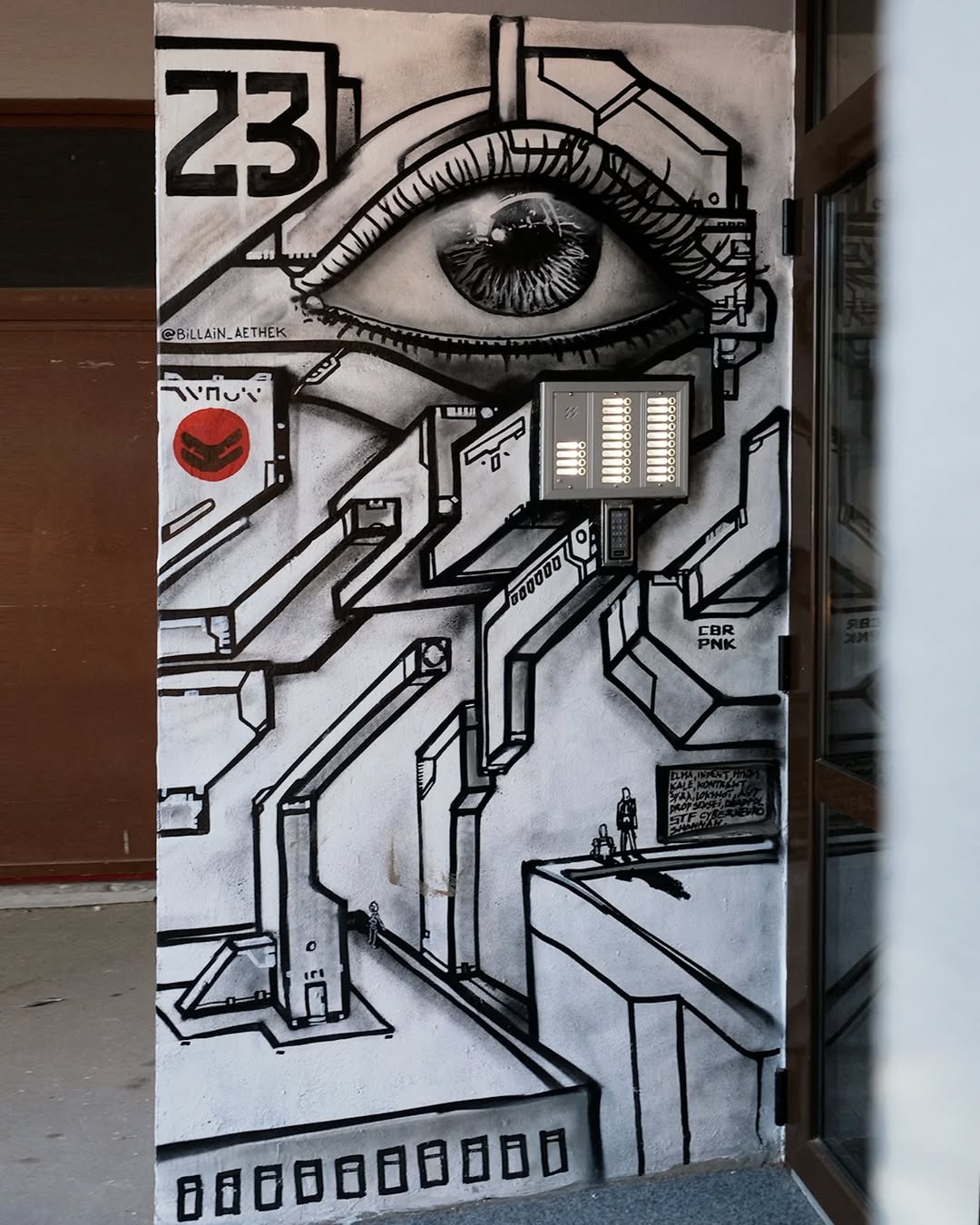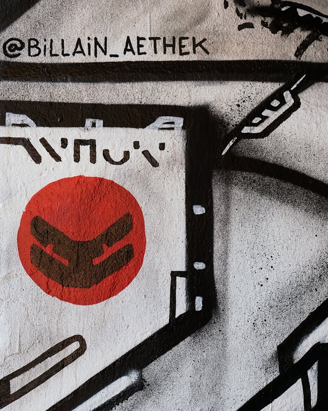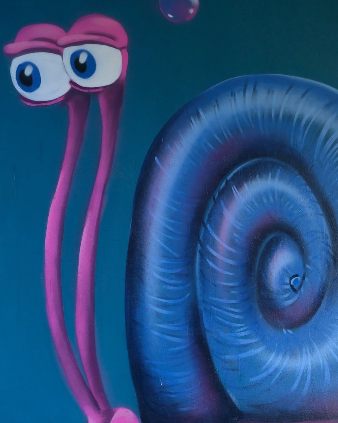 A piece from 2024. Since there’s a playground for children just underneath that atomic shelter, I’ve decided that I should paint something for the kids, so that they have something cool to look at there. Children from the neighbourhood wanted to help me at some point, so I gave them an assignment to paint the background. Since Theo DNK and Gre are a bit older, and they know how to work with spray paint, they painted some more serious parts of the piece. A cool detail is that you can go around the piece, and every angle looks slightly different. – SHPIRA