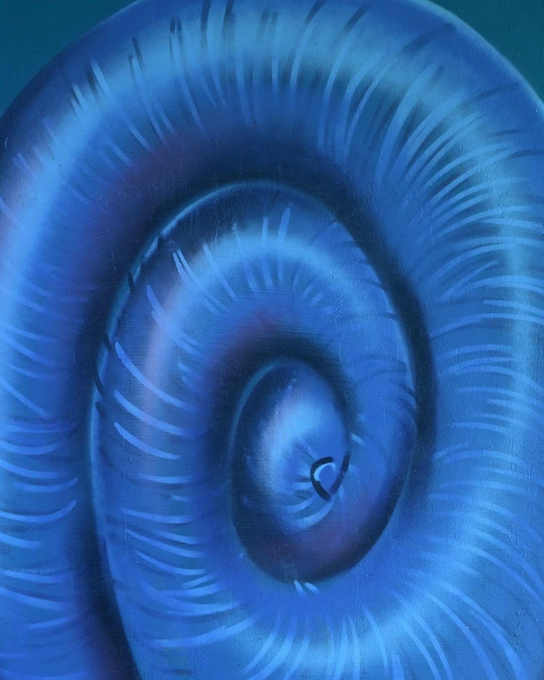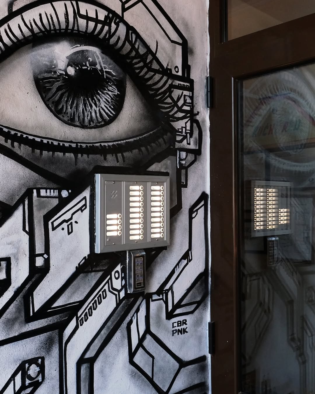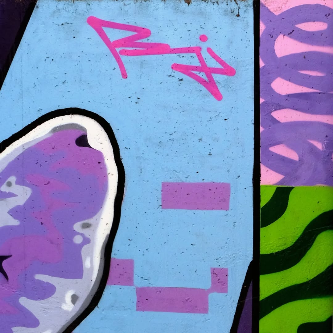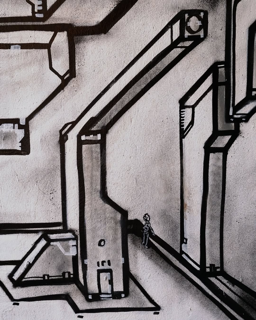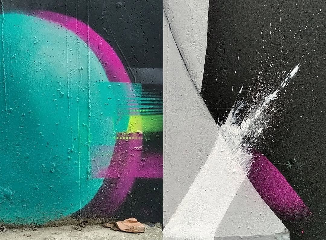 A piece from 2024. Since there’s a playground for children just underneath that atomic shelter, I’ve decided that I should paint something for the kids, so that they have something cool to look at there. Children from the neighbourhood wanted to help me at some point, so I gave them an assignment to paint the background. Since Theo DNK and Gre are a bit older, and they know how to work with spray paint, they painted some more serious parts of the piece. A cool detail is that you can go around the piece, and every angle looks slightly different. – SHPIRA