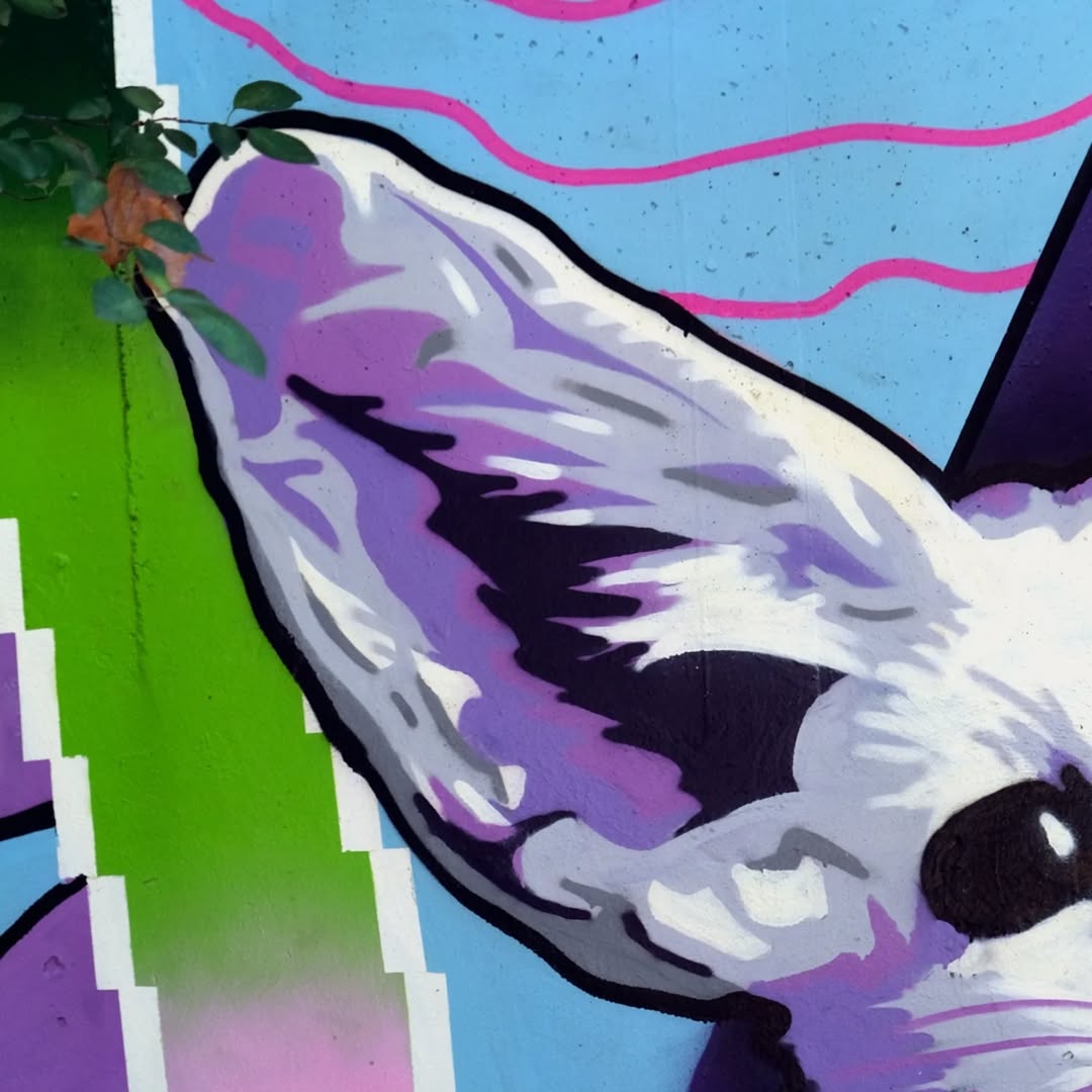A colorful desert fox from Qatar peeking from a dark urban pocket, transforming pedestrian views and block patterns while questioning the connection between distant landscapes and the urban environment. – Avijaticarska Gallery