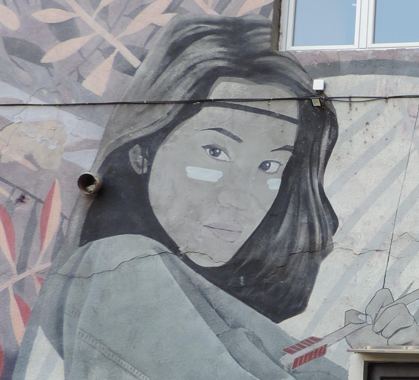 This mural with the title „Hiawata’s Girlfriend“ was created by ARTEZ in July 2016. It is somewhat hidden on the north side of the main building of the old brewery and is most easily reached via the north entrance. Next to the mural you will also find another smaller portrait painting. Also take a look at the countless other artworks via the main page to the old brewery.