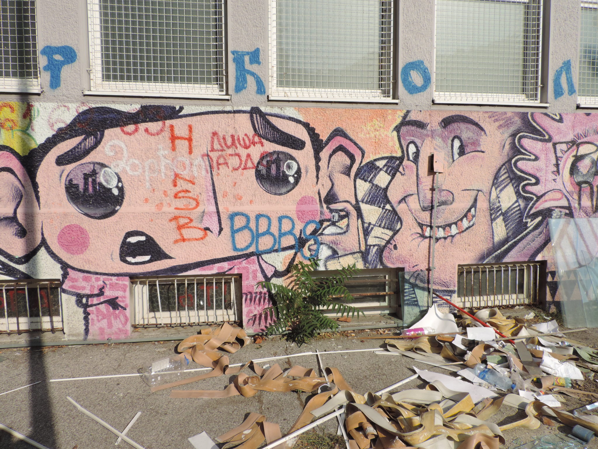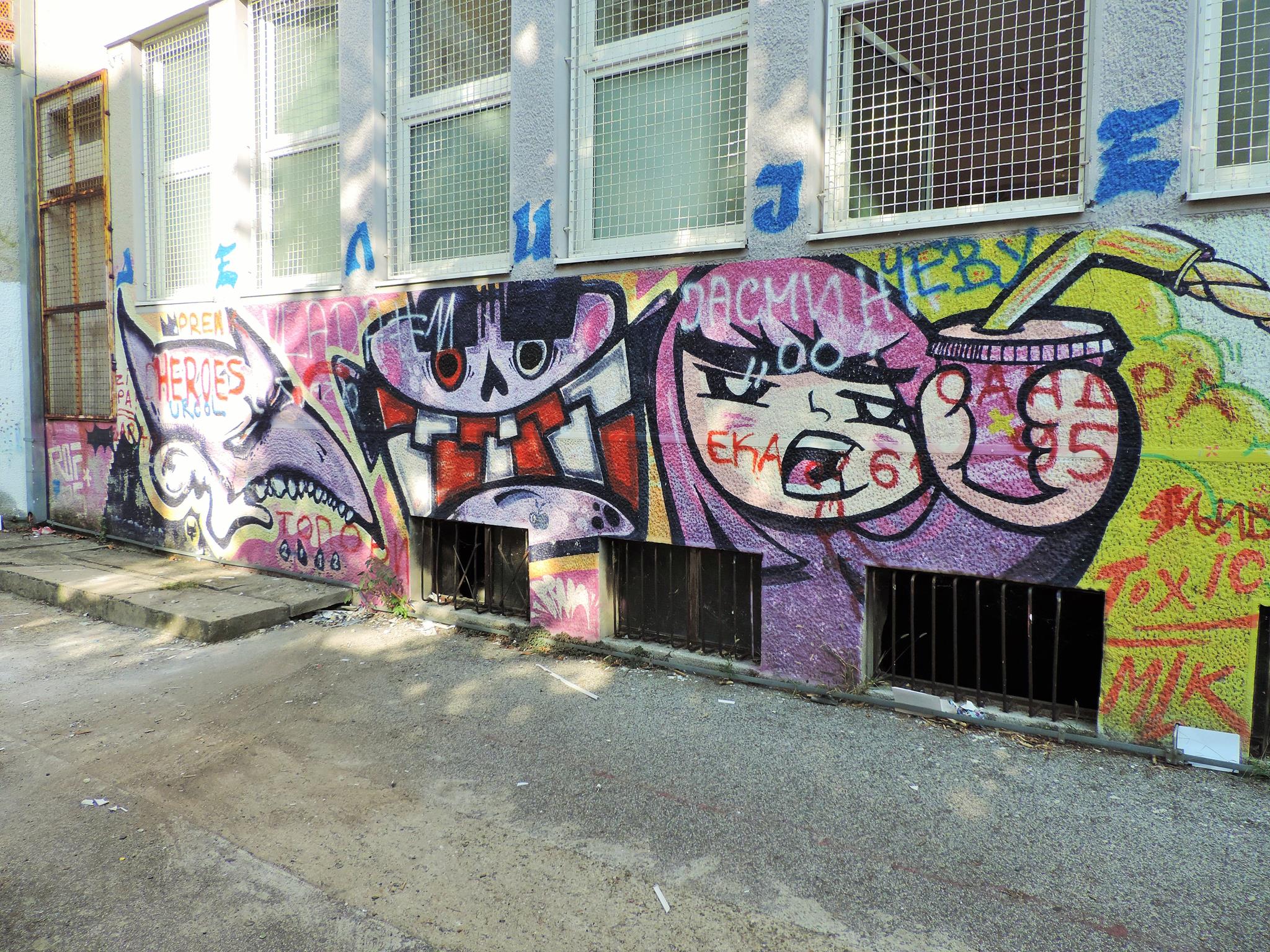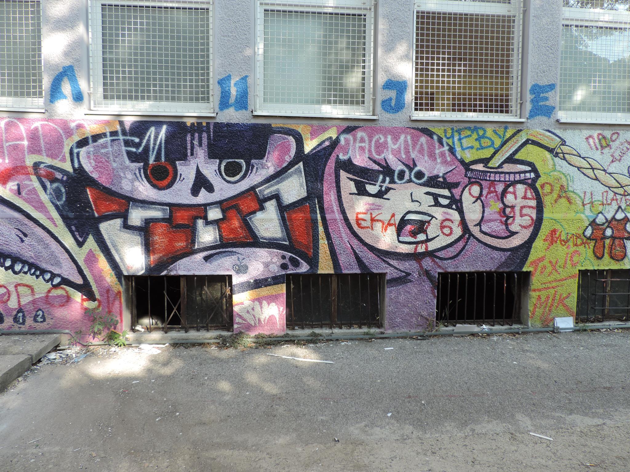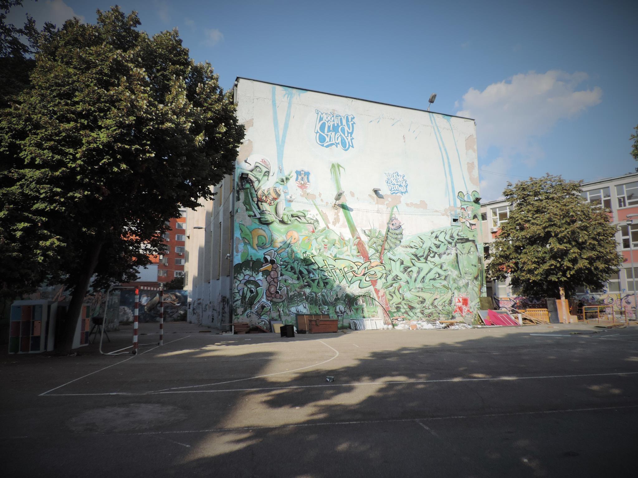 In 2011 from August 26th till 28th the walls of the Eleventh Belgrade High School or Sports High School were completely and magnificently redesigned at a MEETING OF STYLE event over three days with a creative festival programm, and it’s amazing that you can still see these works of art almost 13 years later. But it is probably coming to an end, or rather the school is being renovated and redesigned. We were still lucky enough to be allowed onto the grounds, but at that point everything was being sarnished. The question is whether the walls will be left as they are. Or you could also make a new jam… 😉