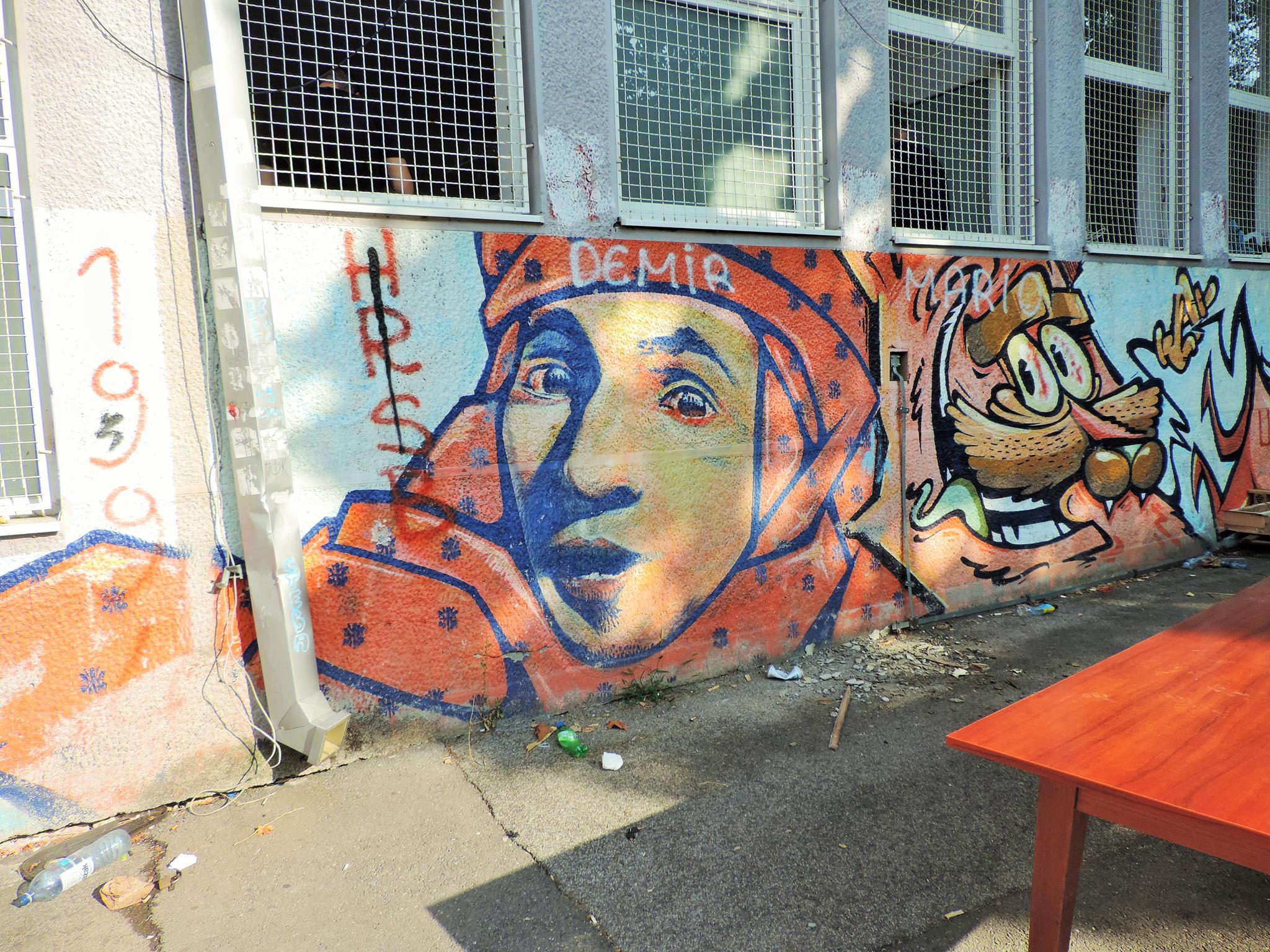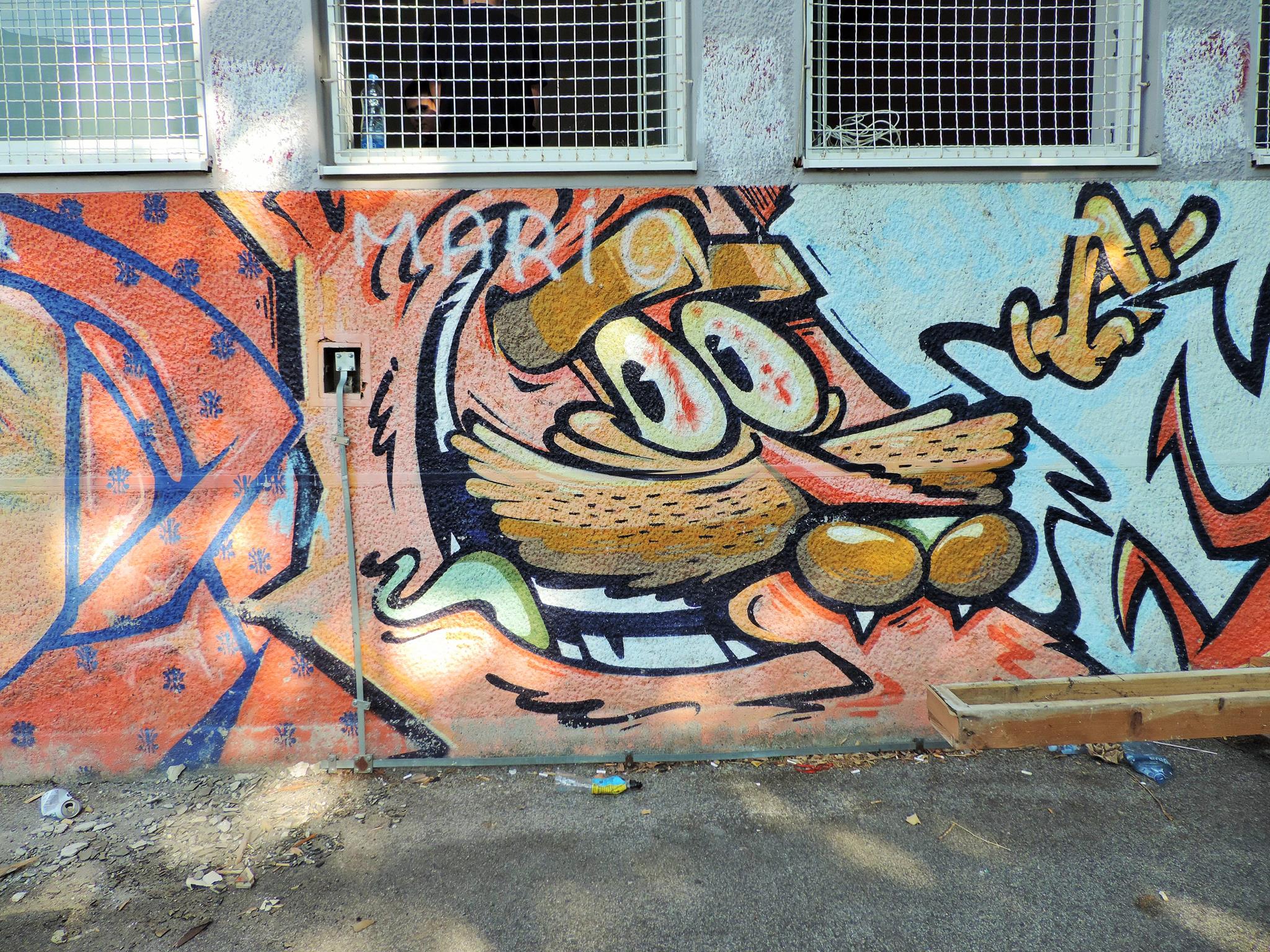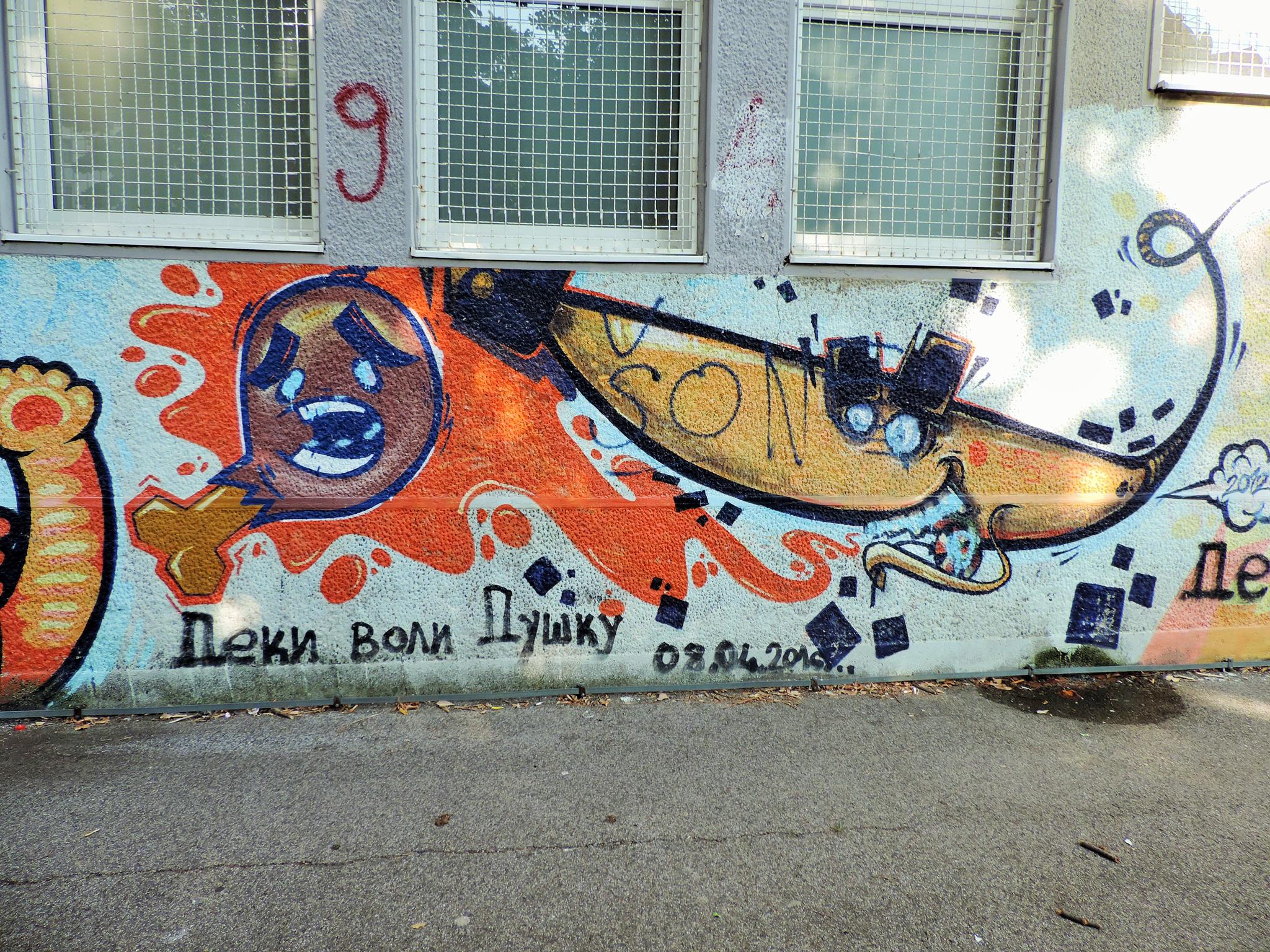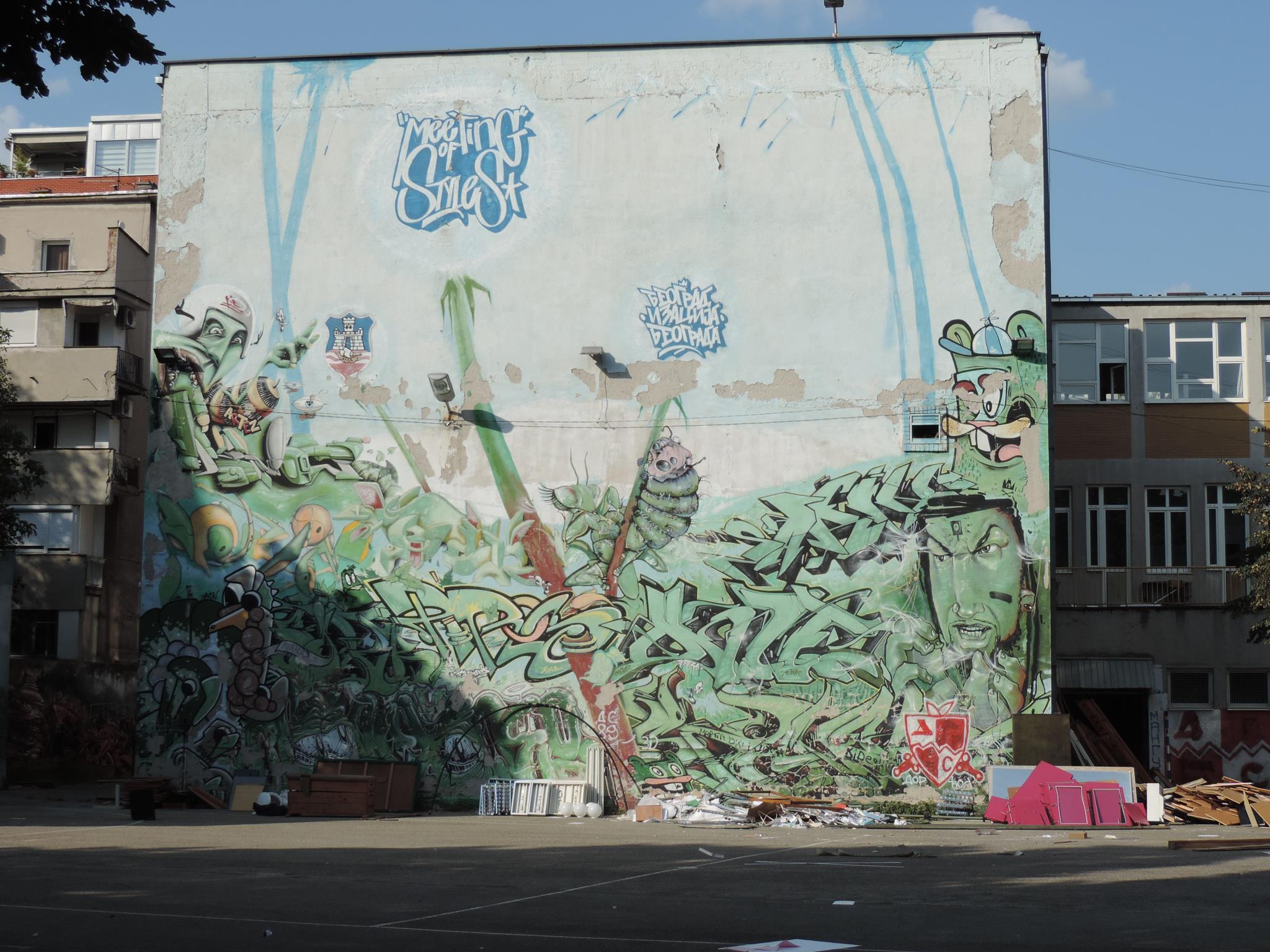 In 2011 from August 26th till 28th the walls of the Eleventh Belgrade High School or Sports High School were completely and magnificently redesigned at a MEETING OF STYLE event over three days with a creative festival programm, and it’s amazing that you can still see these works of art almost 13 years later. But it is probably coming to an end, or rather the school is being renovated and redesigned. We were still lucky enough to be allowed onto the grounds, but at that point everything was being sarnished. The question is whether the walls will be left as they are. Or you could also make a new jam… 😉