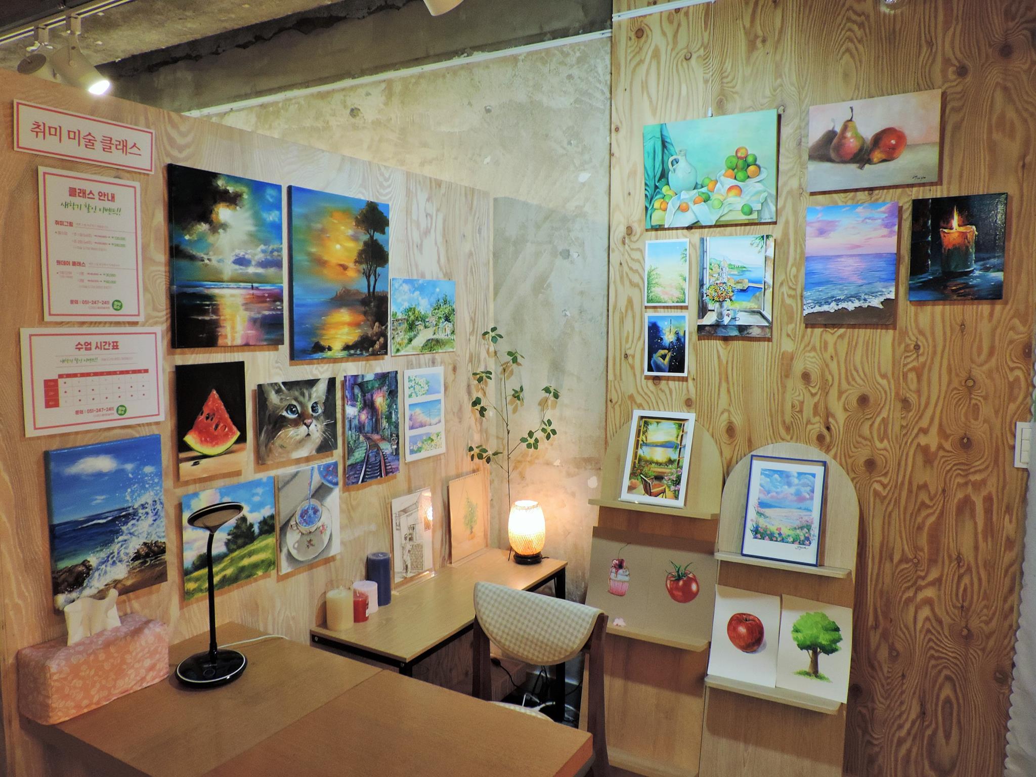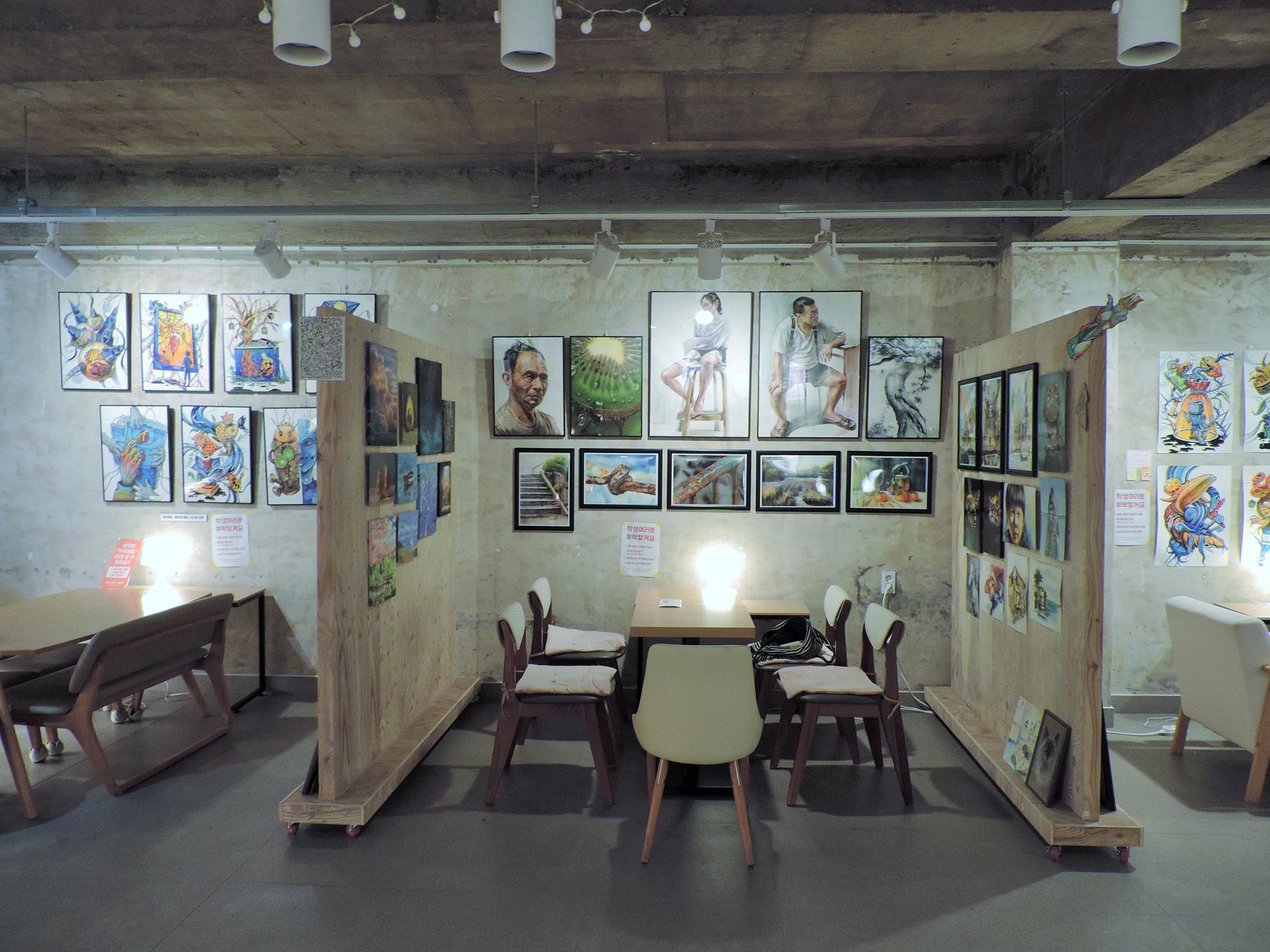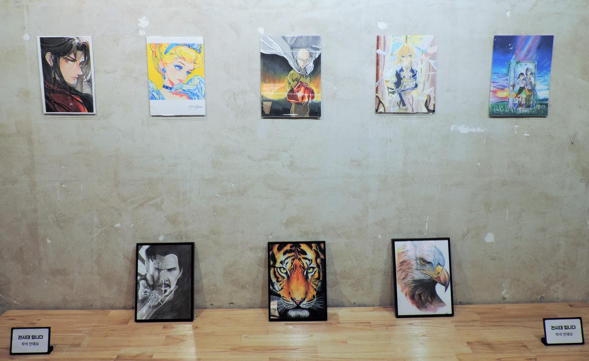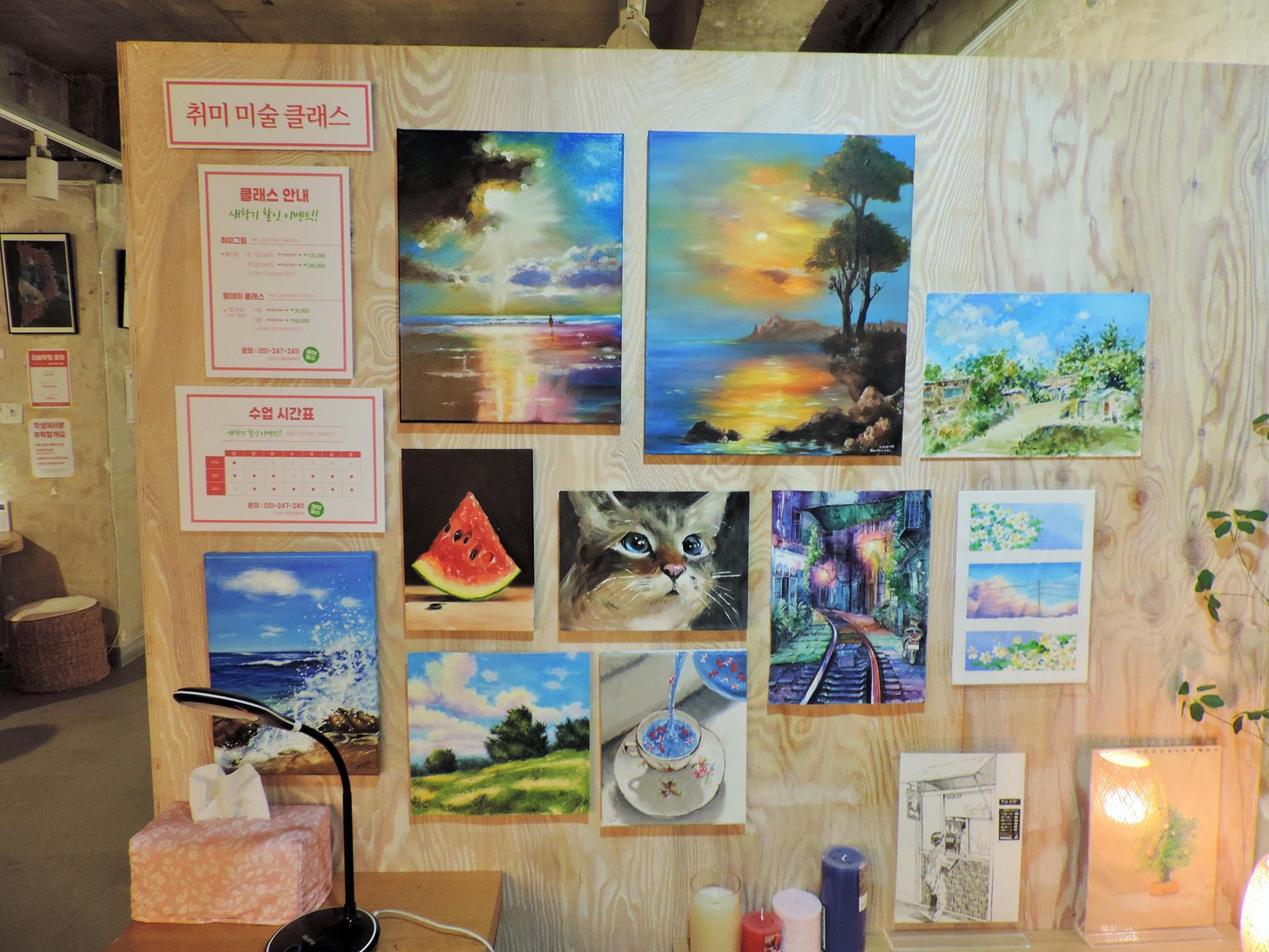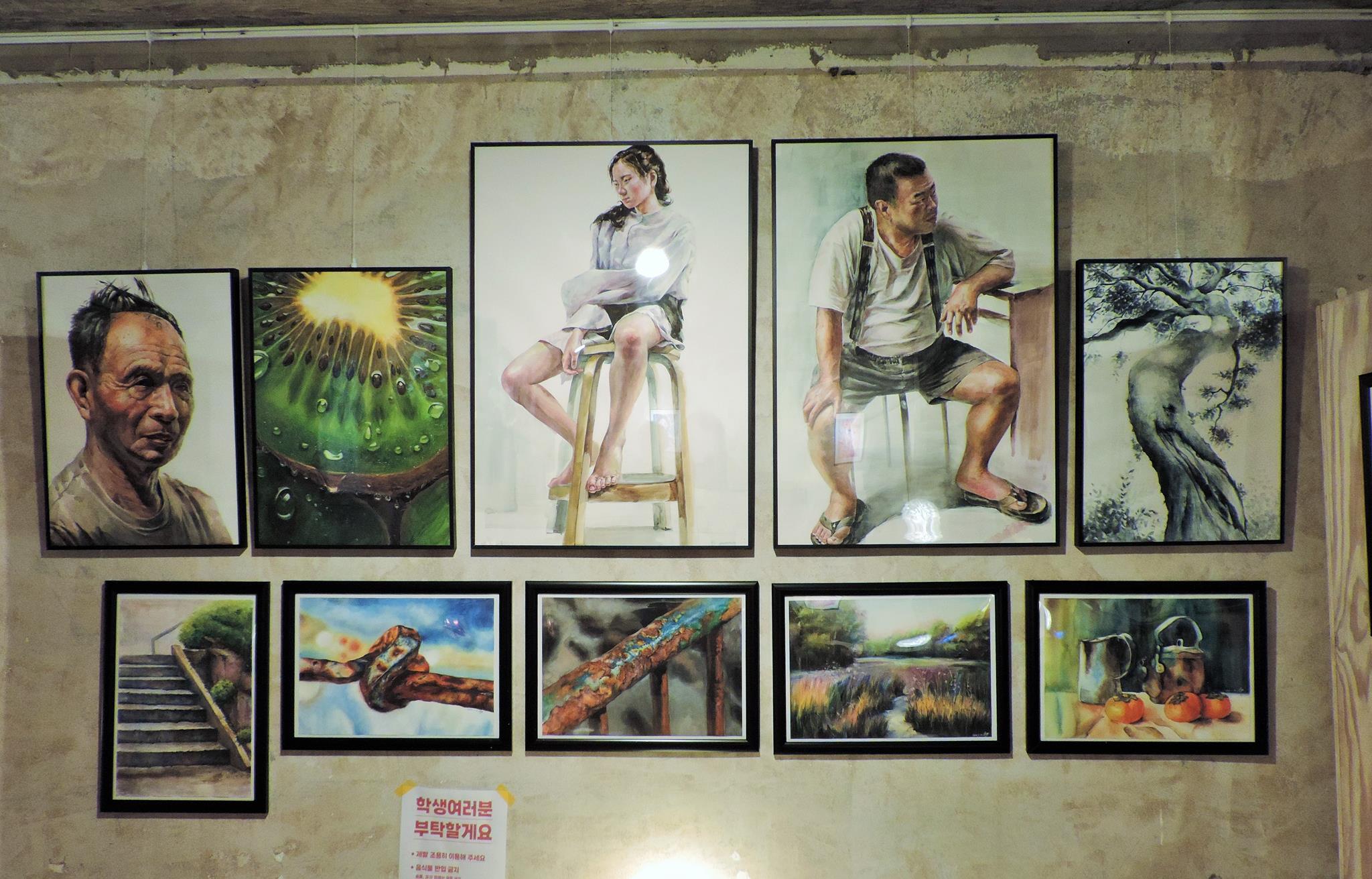 Yes, we have here art education and art exhibition at one place. And during the time a lot of artworks got created. We present them on our walls to show what kind of art you can do. There are portraits of people, also animals, abstract paintings, comic heroes or manga drawings. Everybody is welcome and when you are in Busan come by and have a look at our creative space.