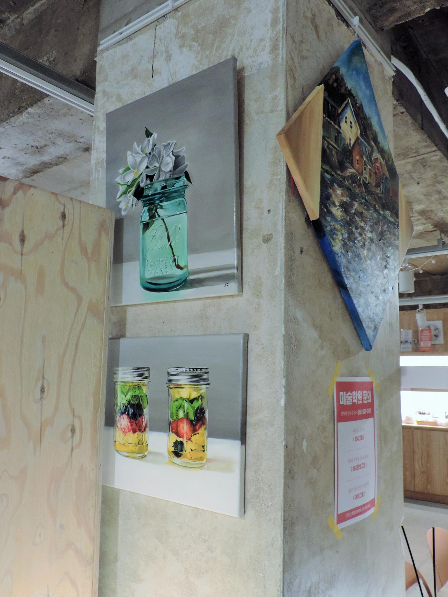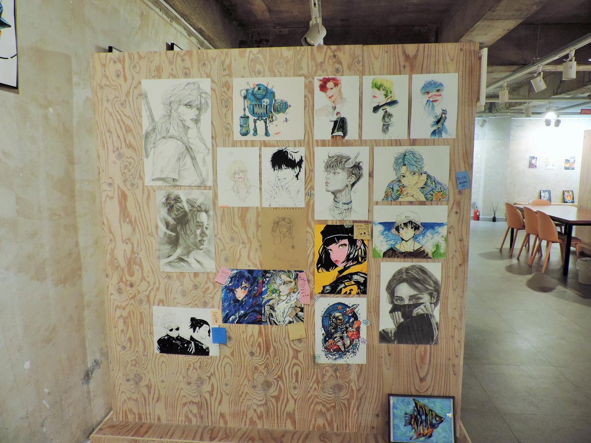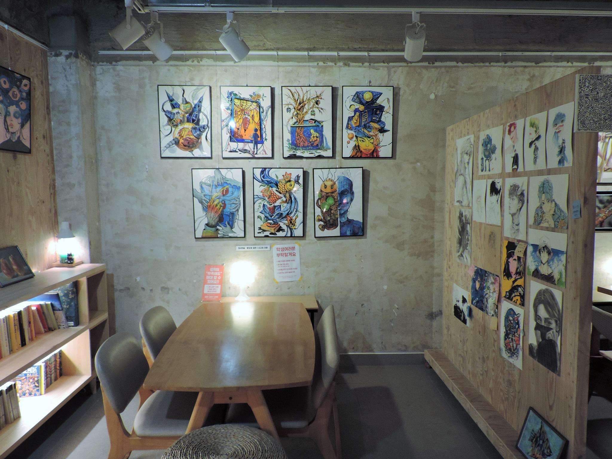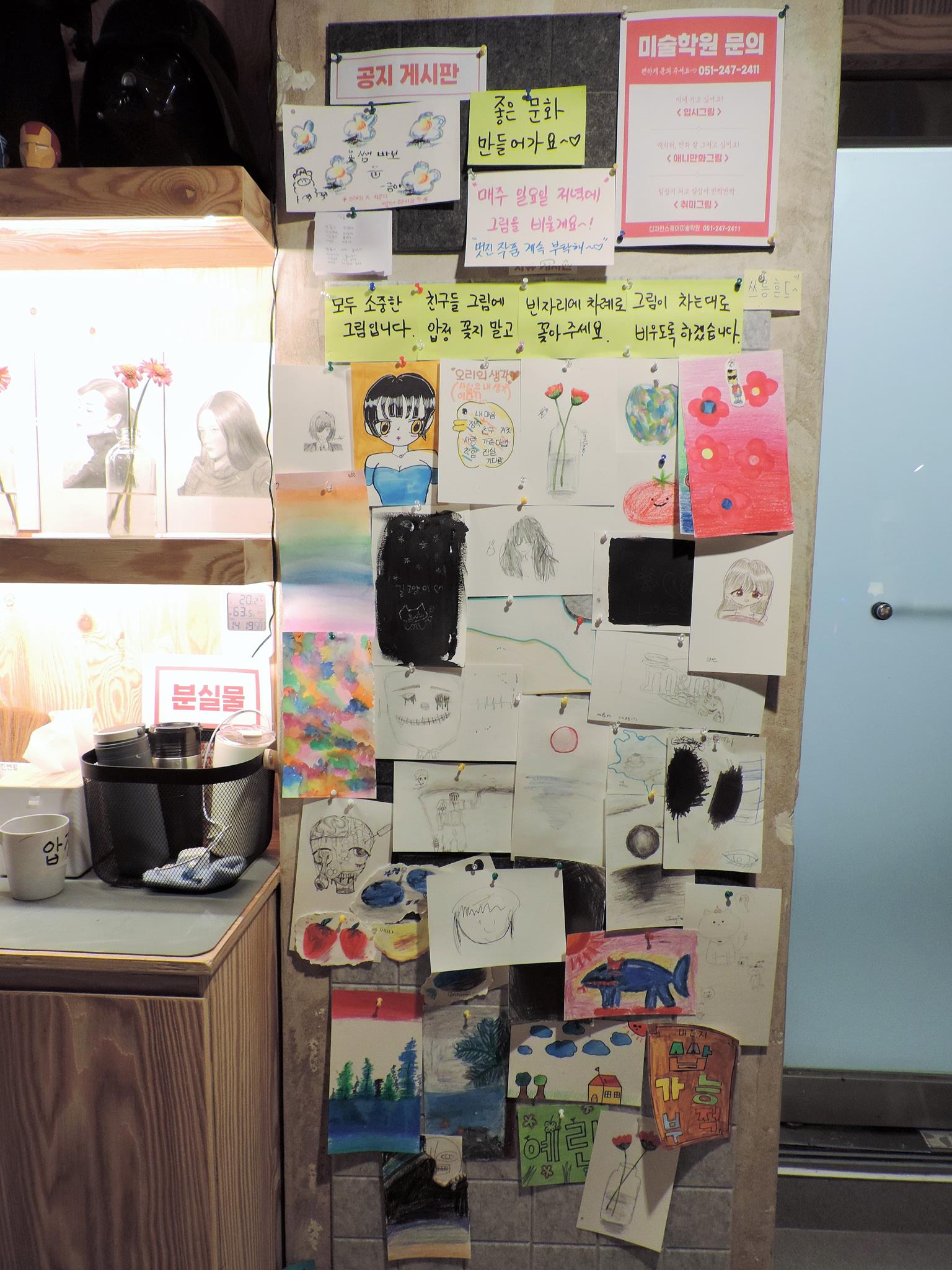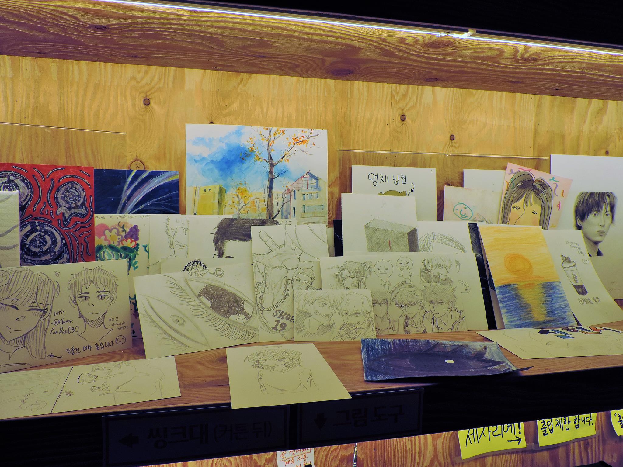 Yes, we have here art education and art exhibition at one place. And during the time a lot of artworks got created. We present them on our walls to show what kind of art you can do. There are portraits of people, also animals, abstract paintings, comic heroes or manga drawings. Everybody is welcome and when you are in Busan come by and have a look at our creative space.