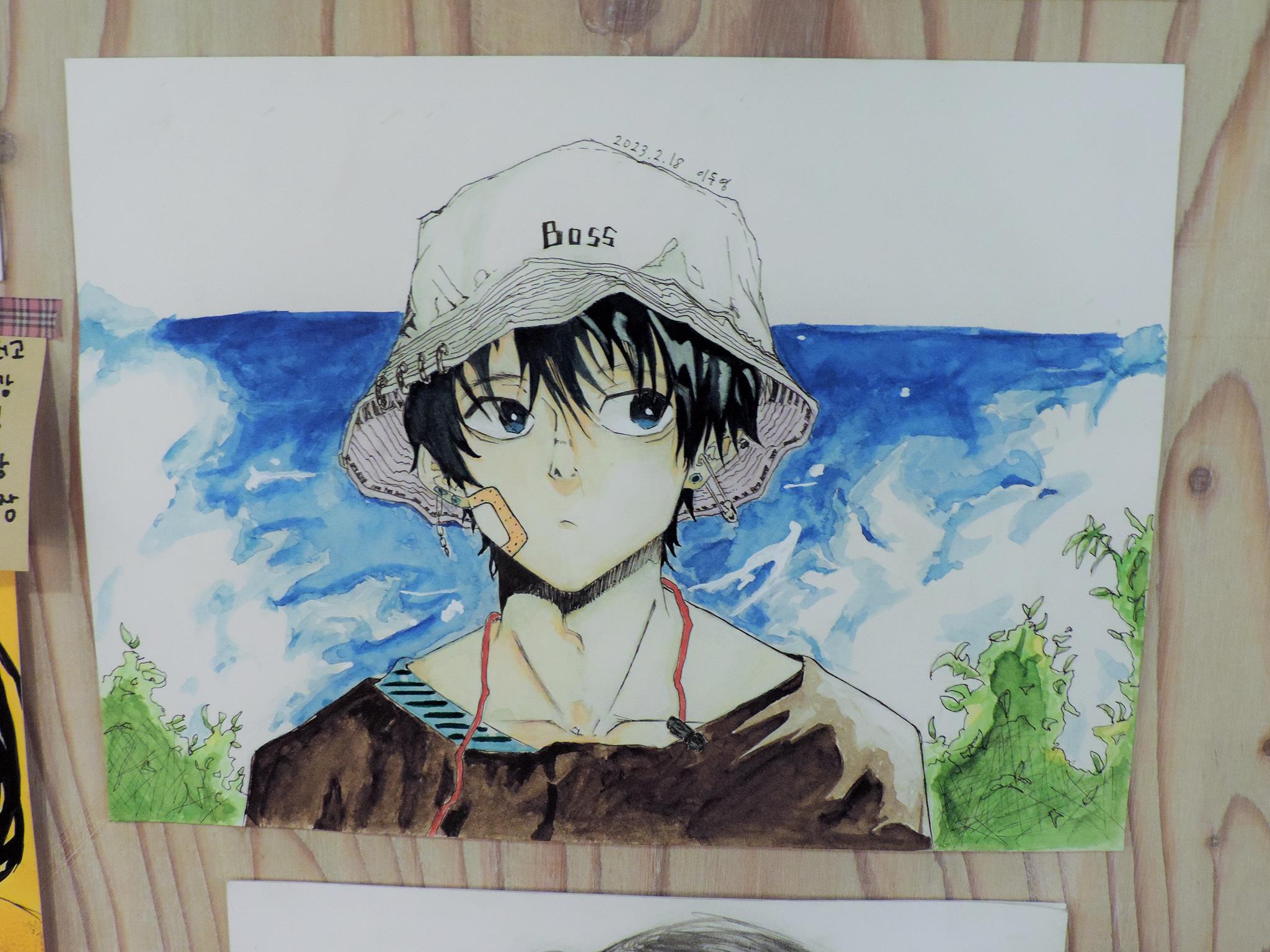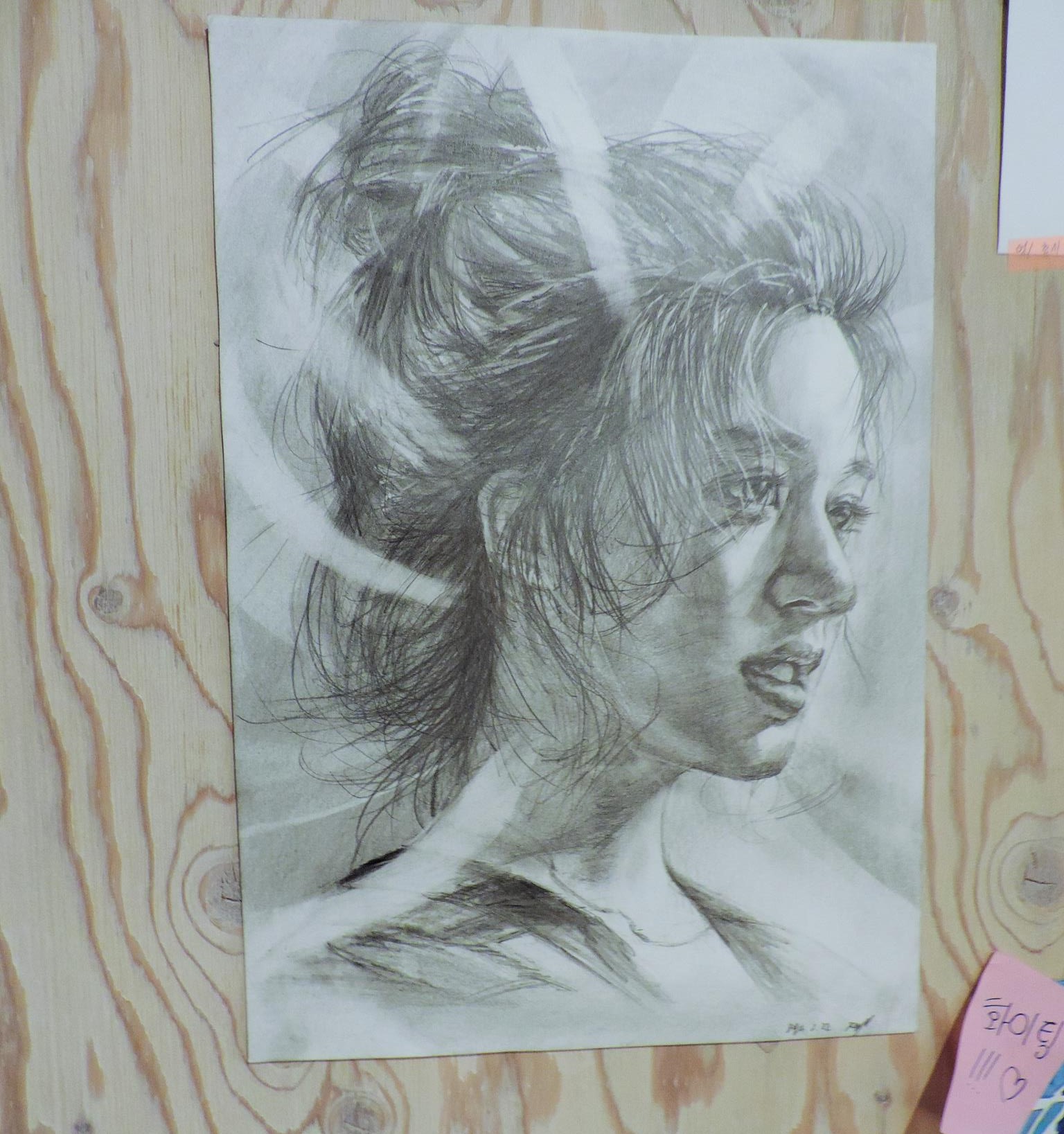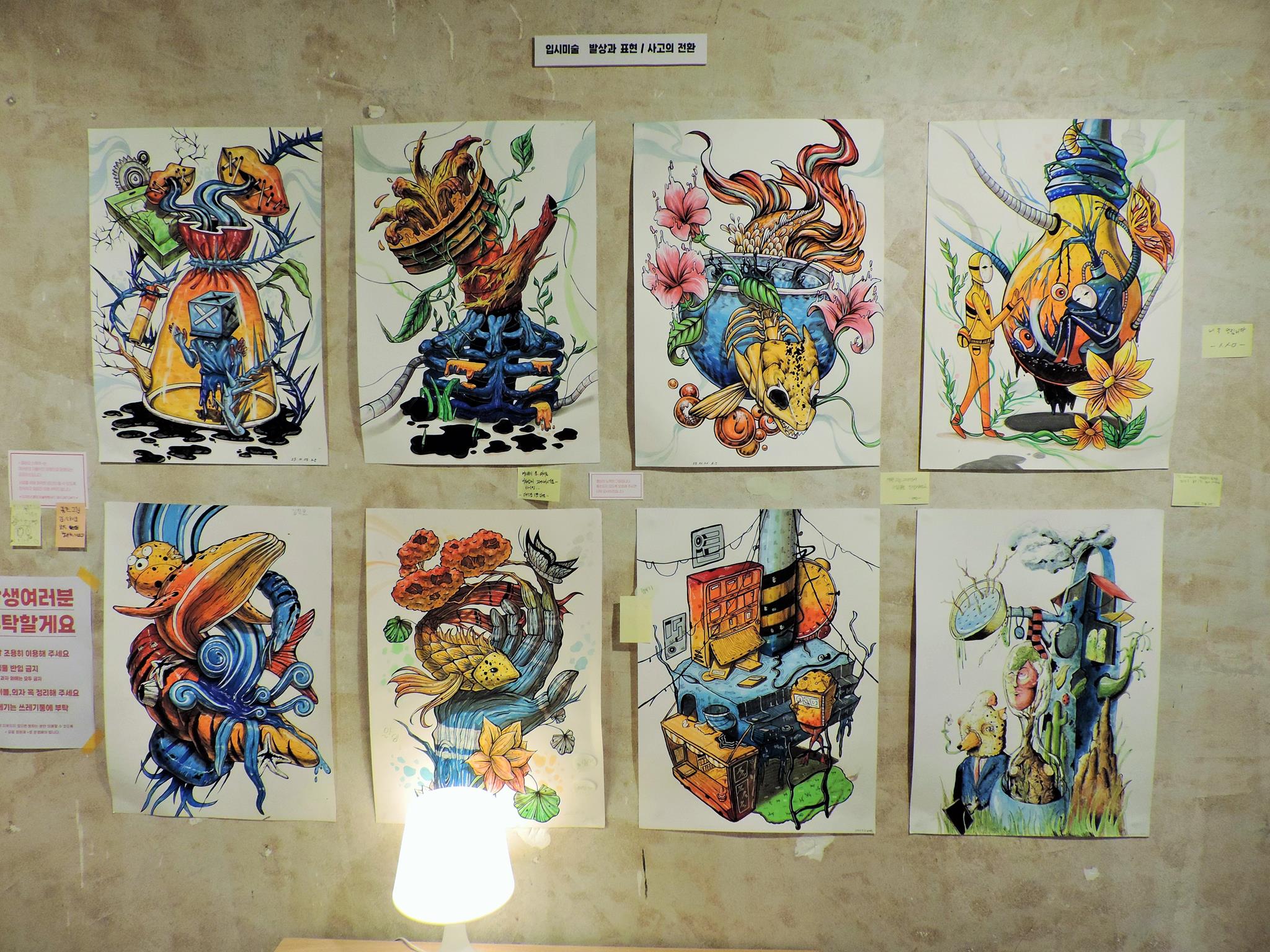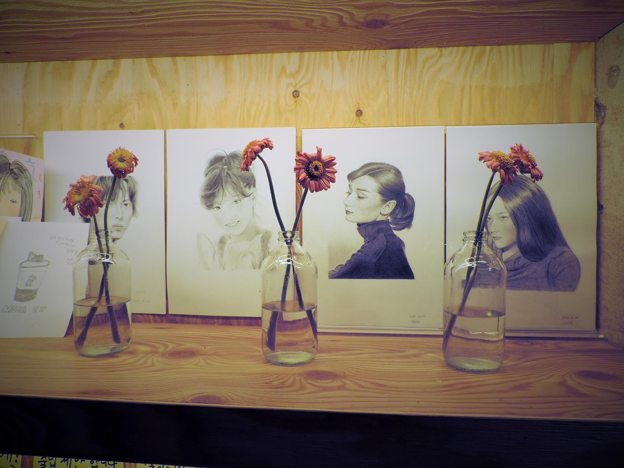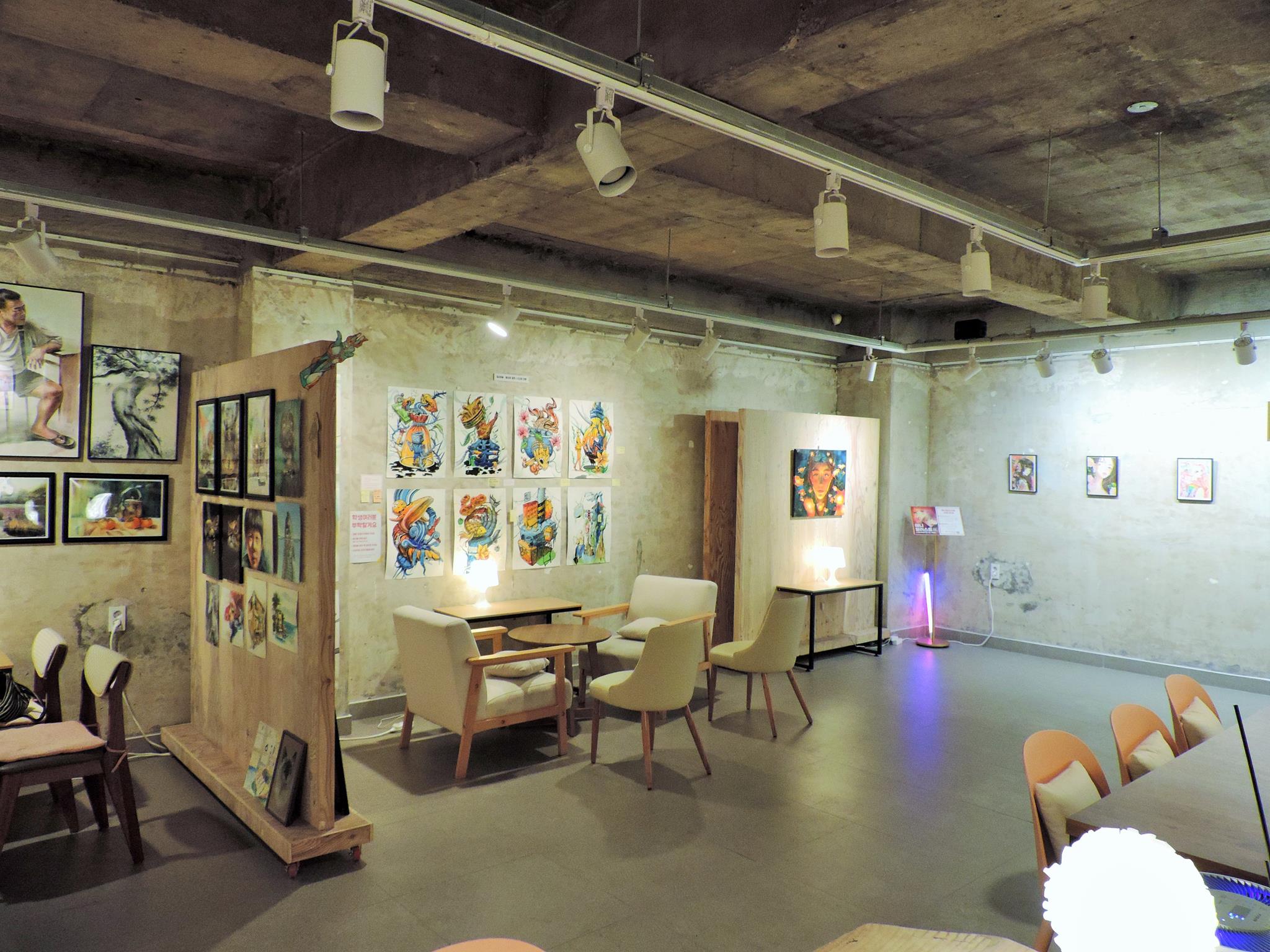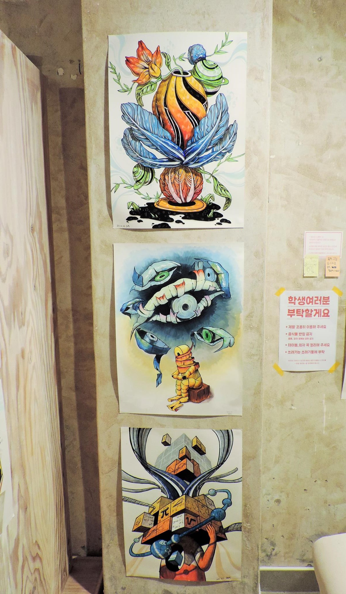 Yes, we have here art education and art exhibition at one place. And during the time a lot of artworks got created. We present them on our walls to show what kind of art you can do. There are portraits of people, also animals, abstract paintings, comic heroes or manga drawings. Everybody is welcome and when you are in Busan come by and have a look at our creative space.