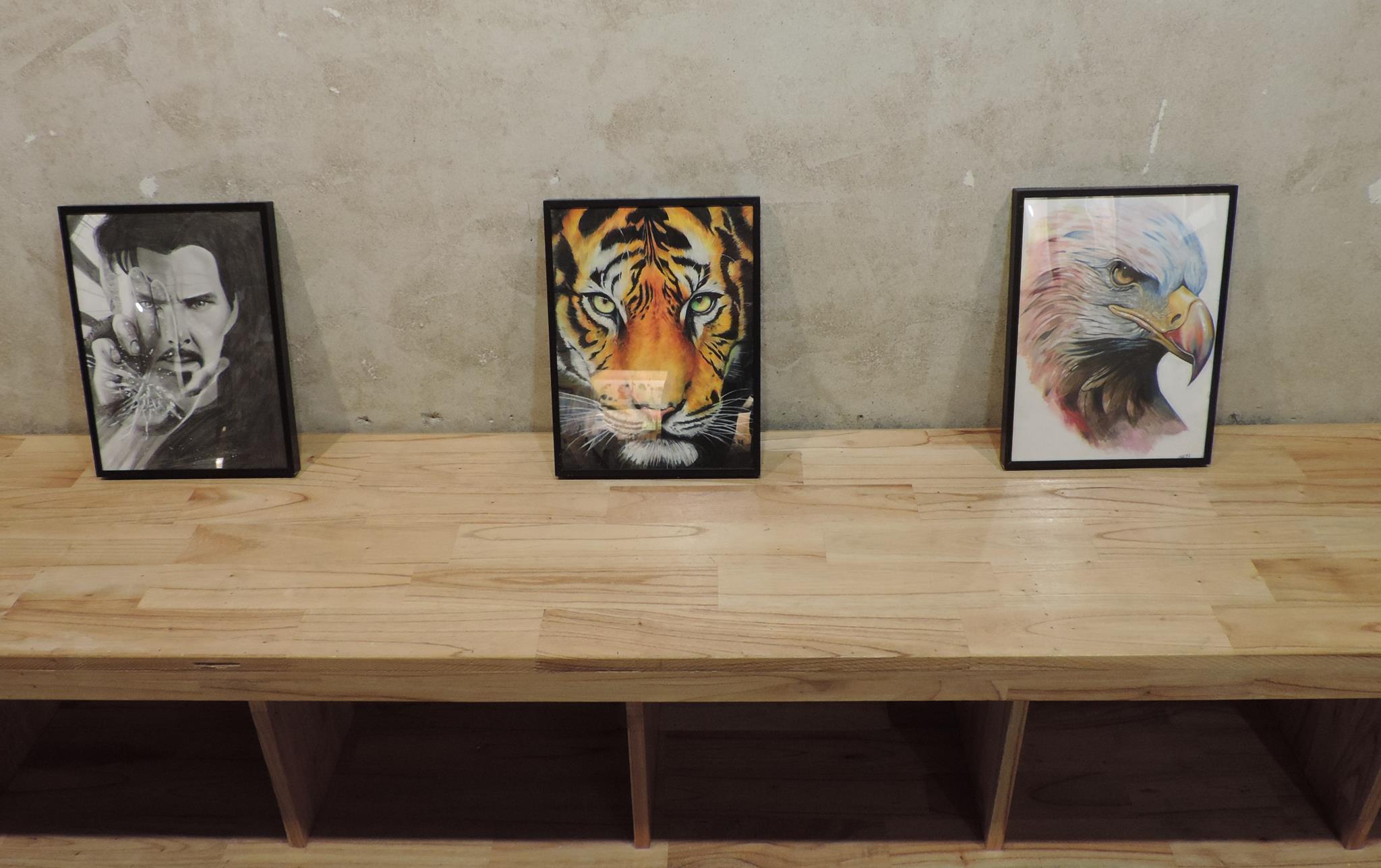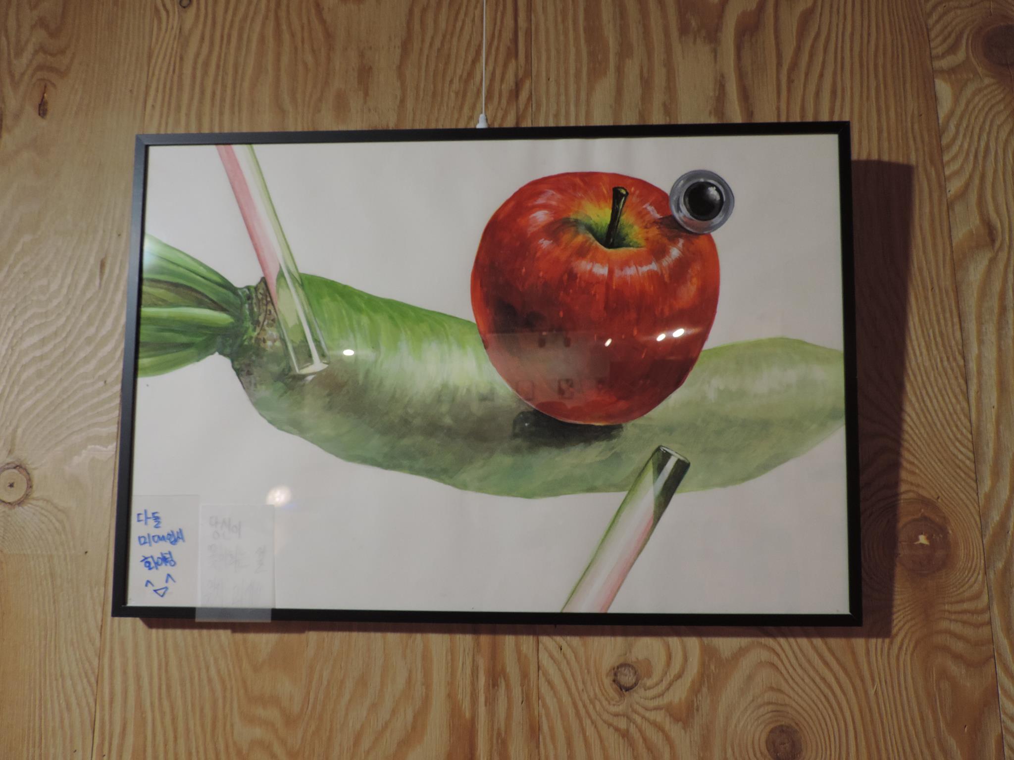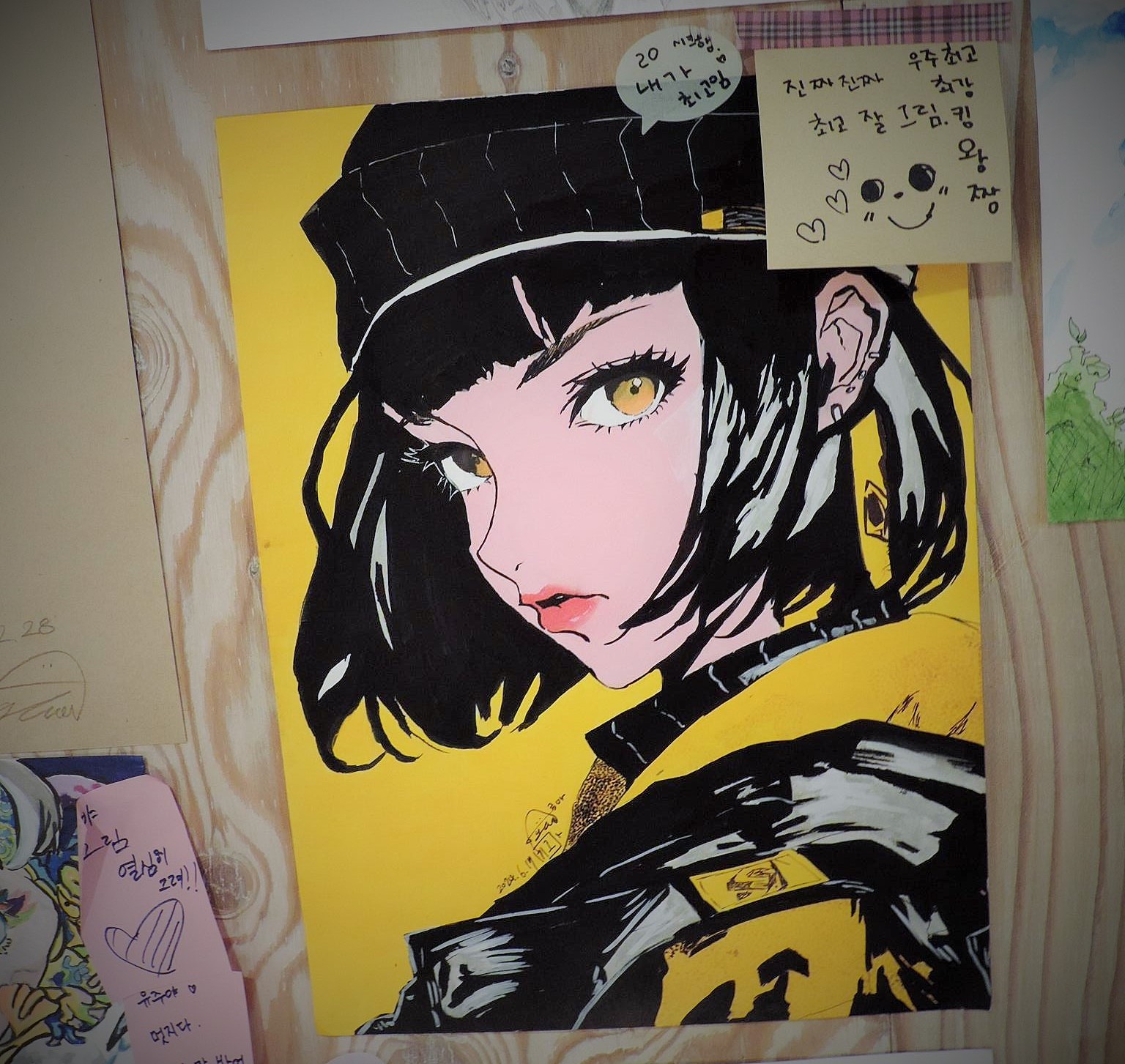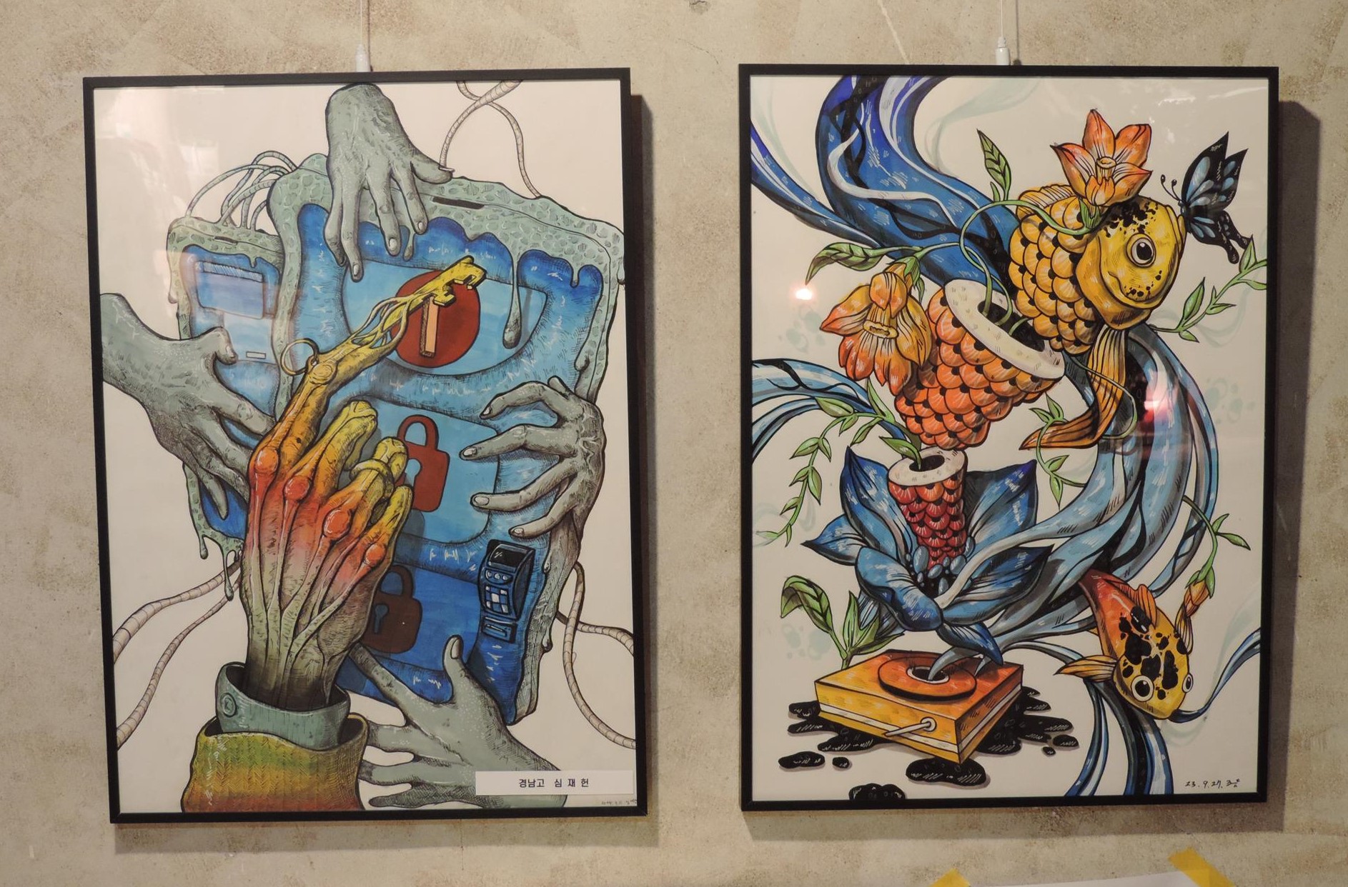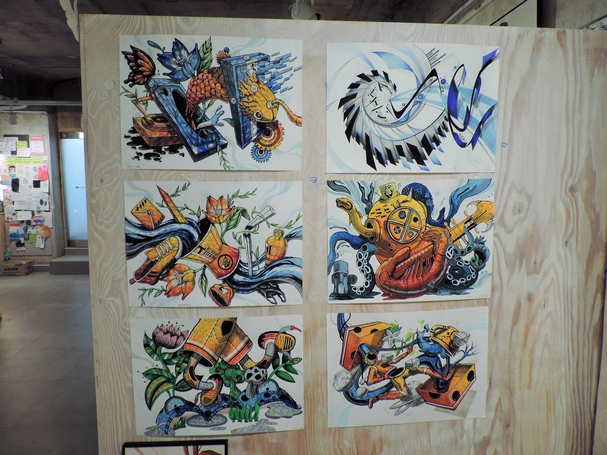 Yes, we have here art education and art exhibition at one place. And during the time a lot of artworks got created. We present them on our walls to show what kind of art you can do. There are portraits of people, also animals, abstract paintings, comic heroes or manga drawings. Everybody is welcome and when you are in Busan come by and have a look at our creative space.