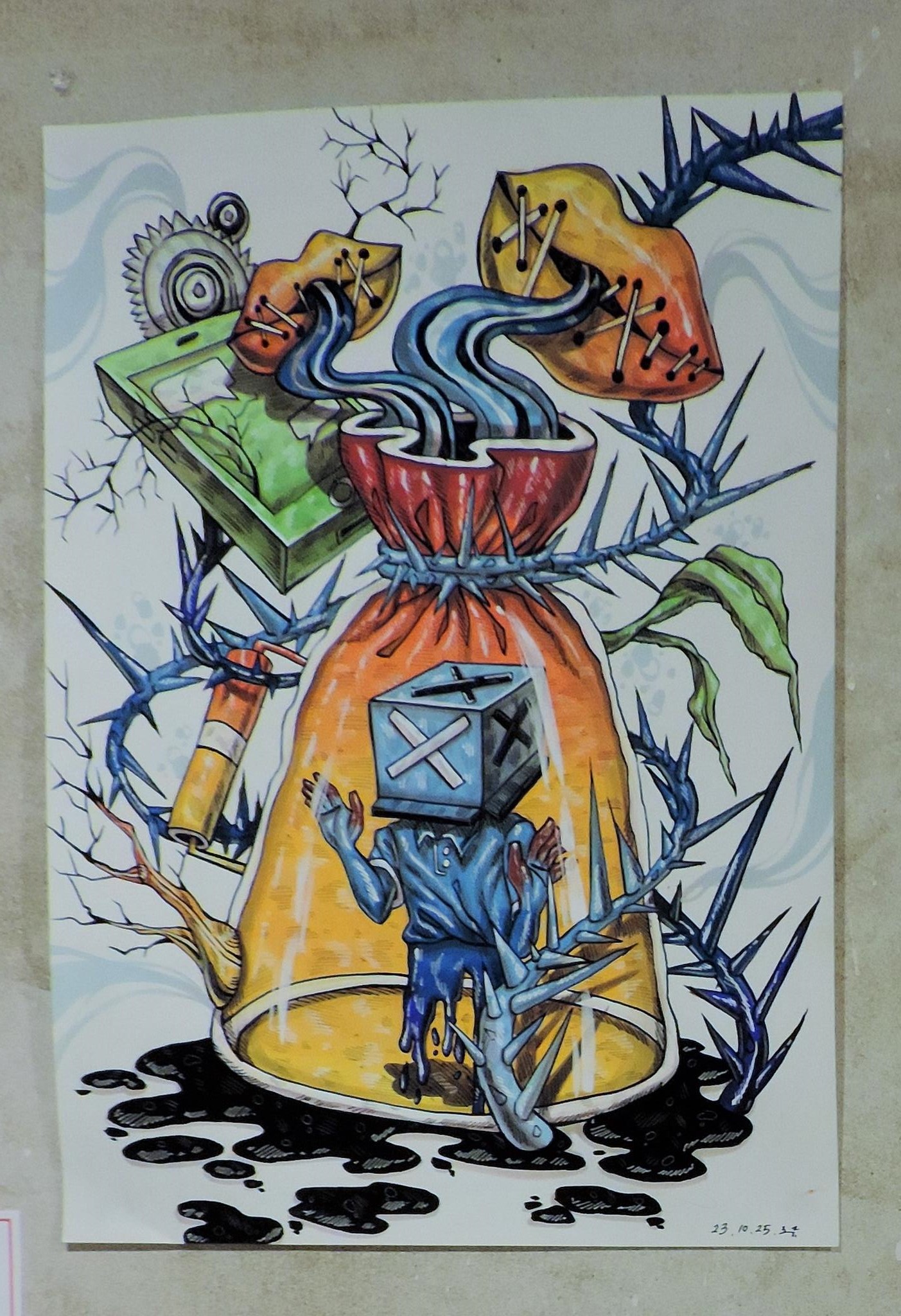 That’s great! So also children or people who don’t have so much money to buy their own colors, pencils and brushes, they can come here and you provide everything. Also this space here. Before you said time by time you also have exhibitions here. So these shown artworks all got drawn here?