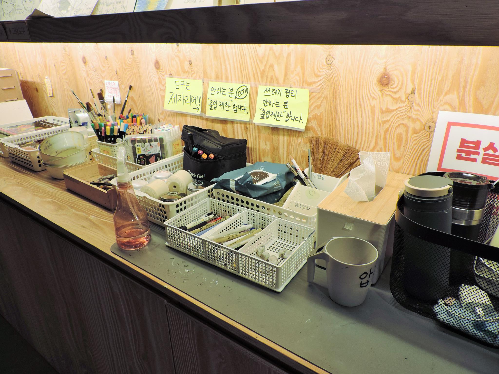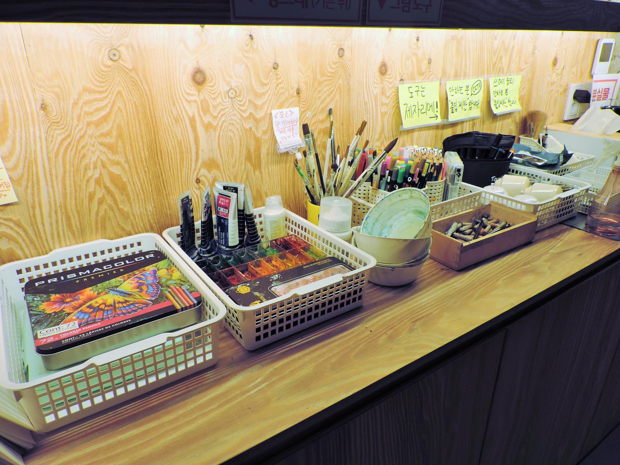 We have everything here and provide it for the visitors. We support all the equipment. There in the back you can see the tools and colors. So we have colored pencils or watercolor and other needed things. And we support all of that for free so that everybody who comes here can use them.
