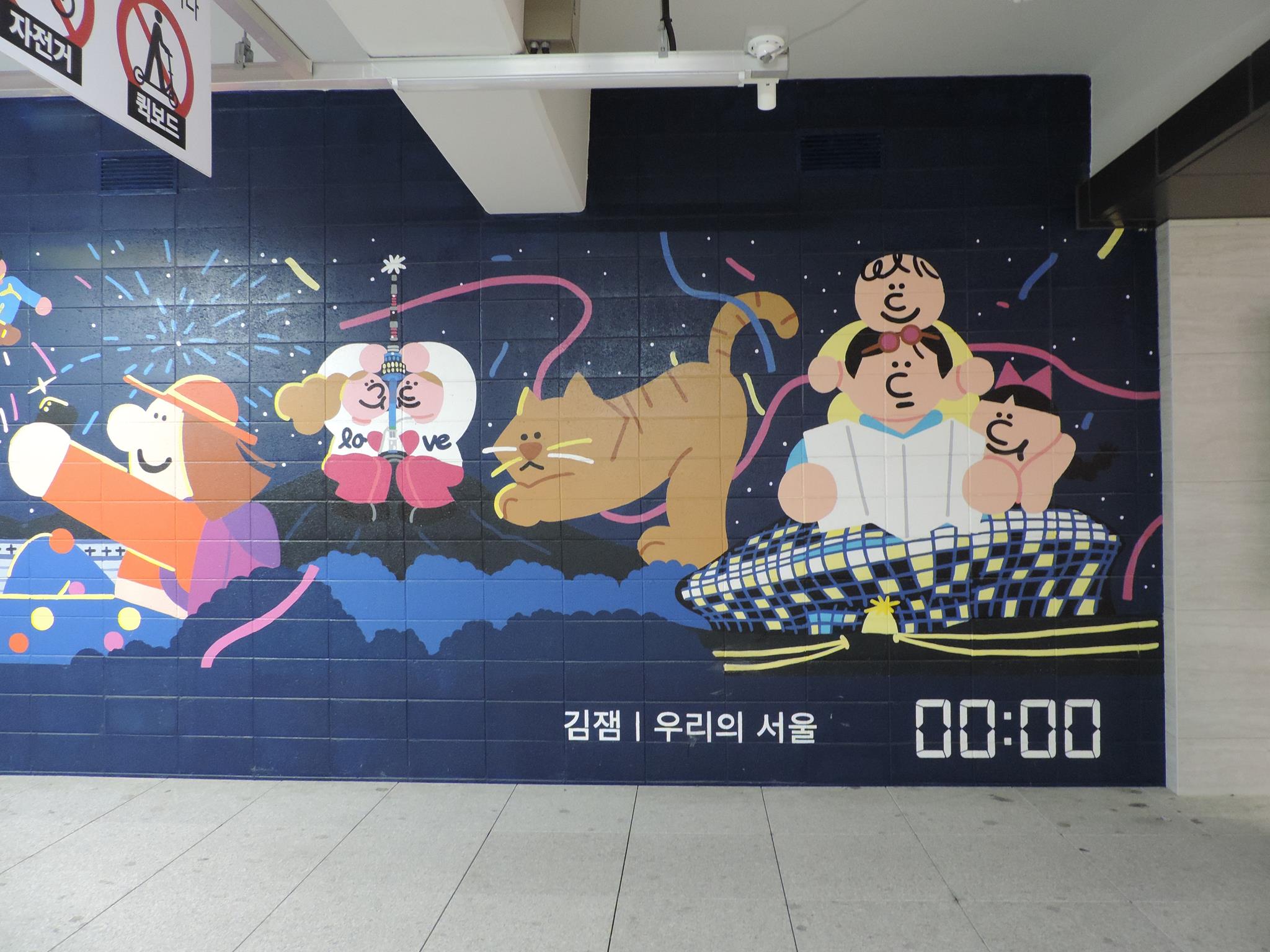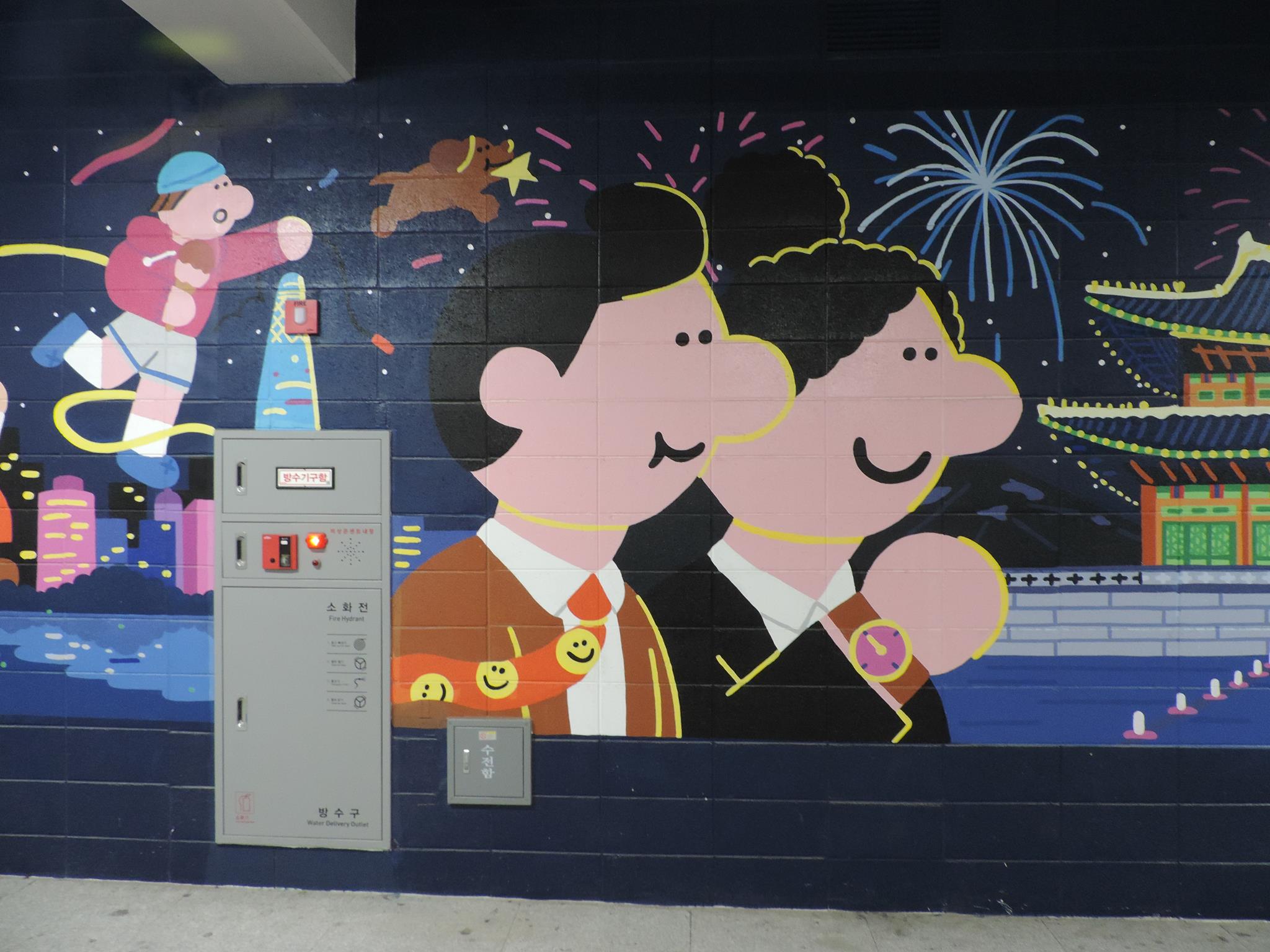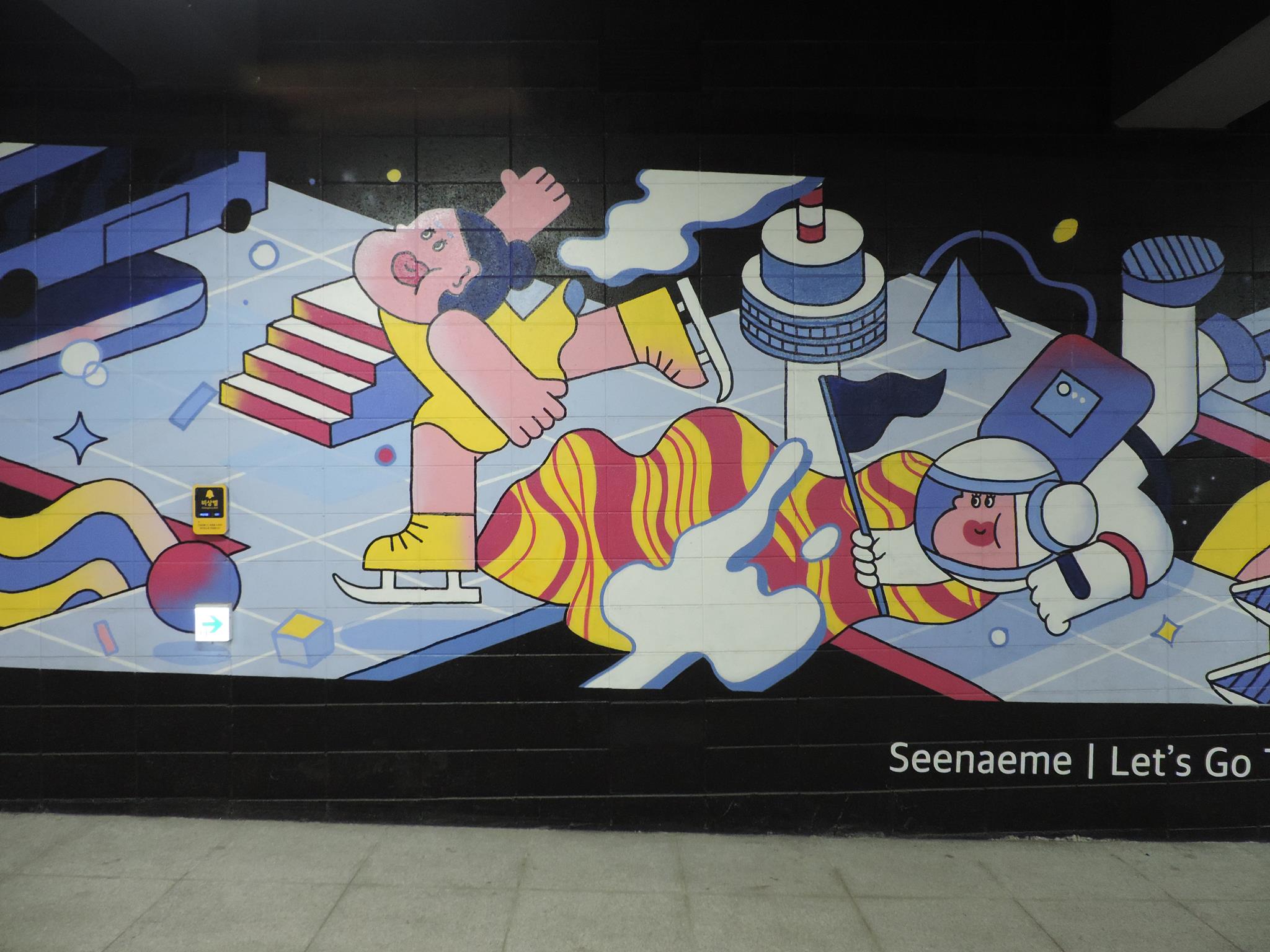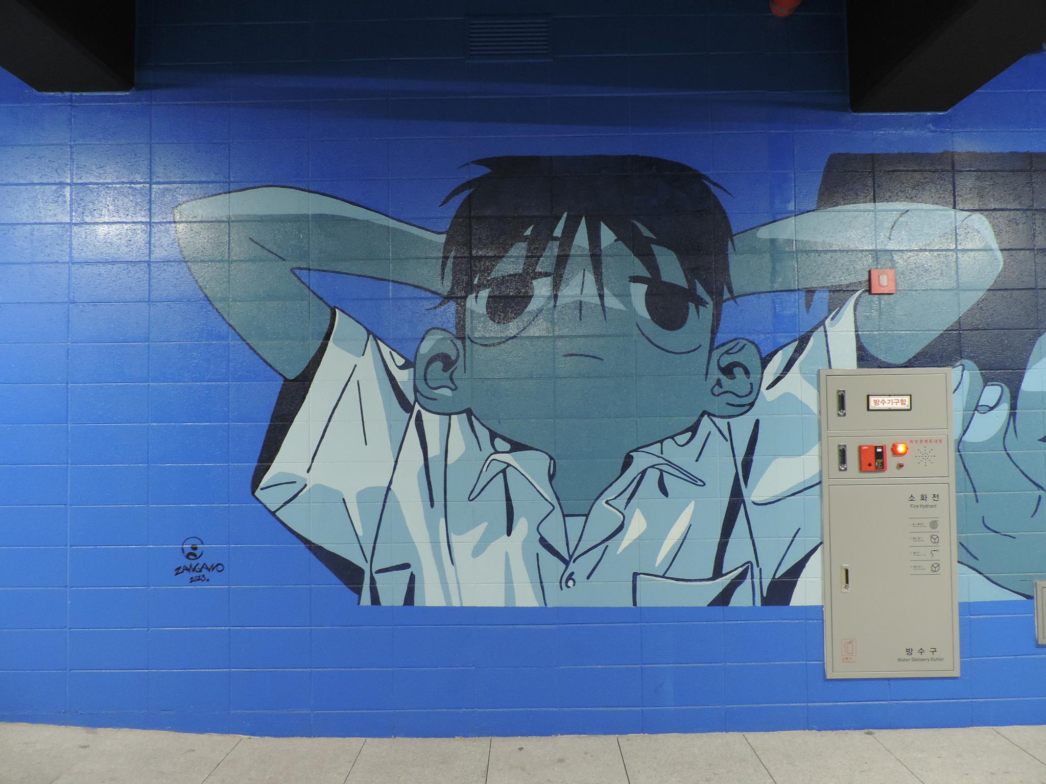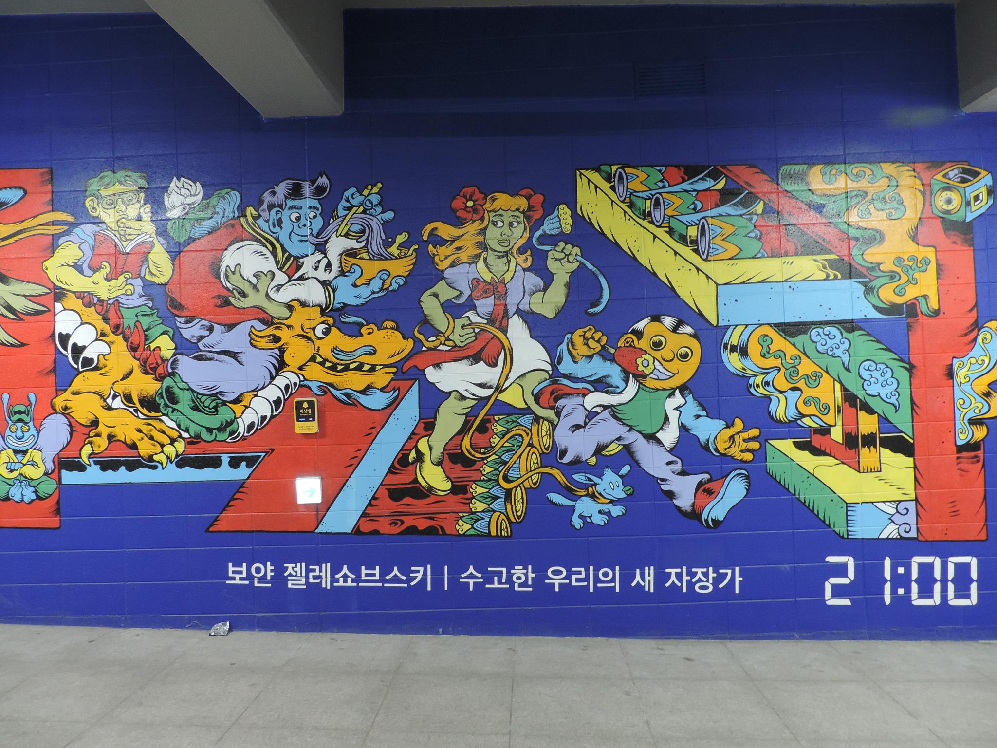 Each artist has interpreted the hour in their own style, resulting in a wide variety of techniques, from graffiti to comics to manga and abstraction. The passage has become an extensive underground gallery that provides a good insight into the Korean streetart scene. While you’re there, you should also stop by the tourist office, which is highly recommended. The staff can provide lots of information about streetart locations around and other tips. When you reach the end of the tunnel, assuming you started in the south, another masterpiece by Spanish artist LALONE awaits you in the northern foyer, featuring Picasso motifs to mark the city partnership between Seoul and Malaga.