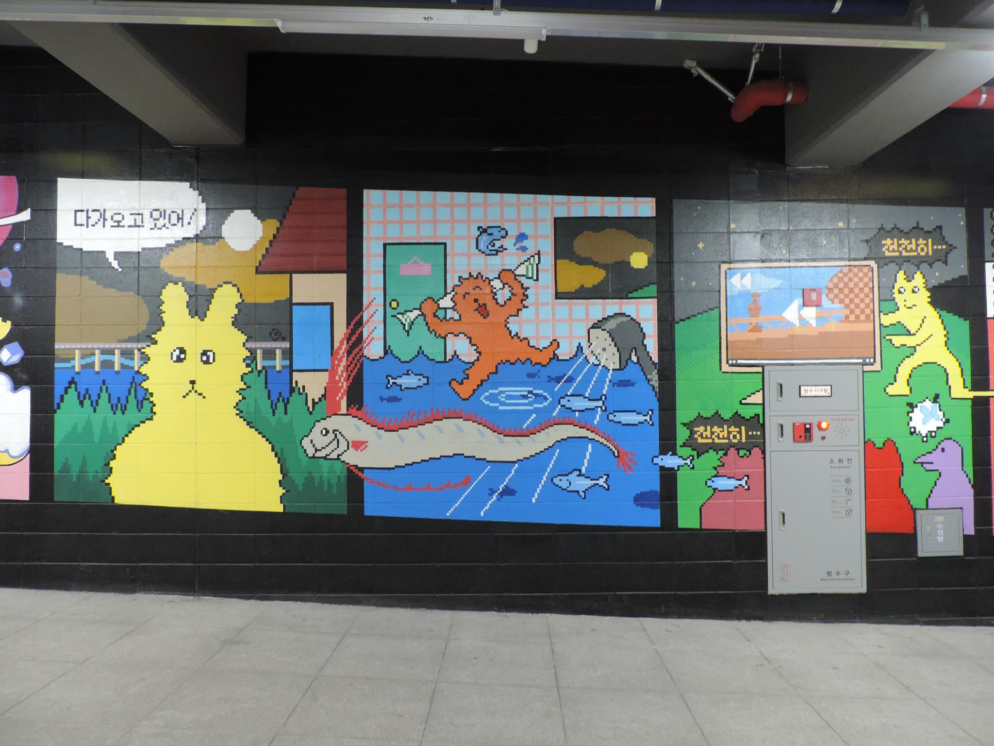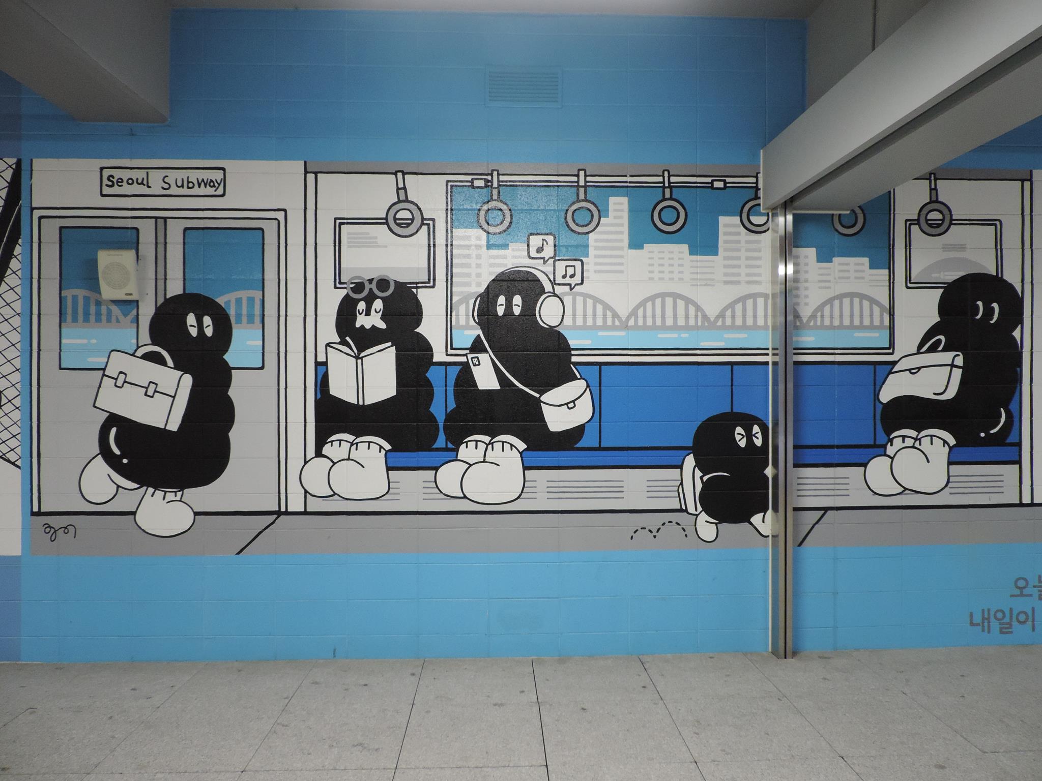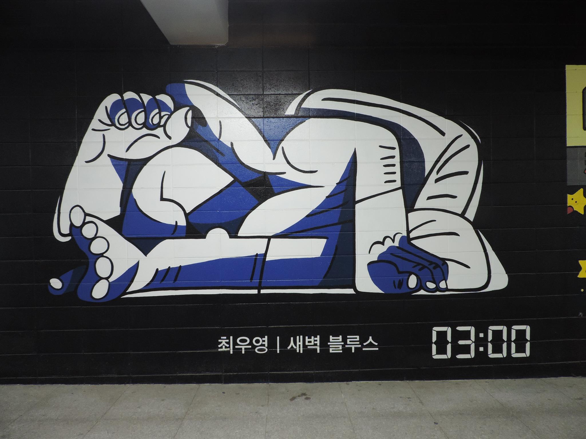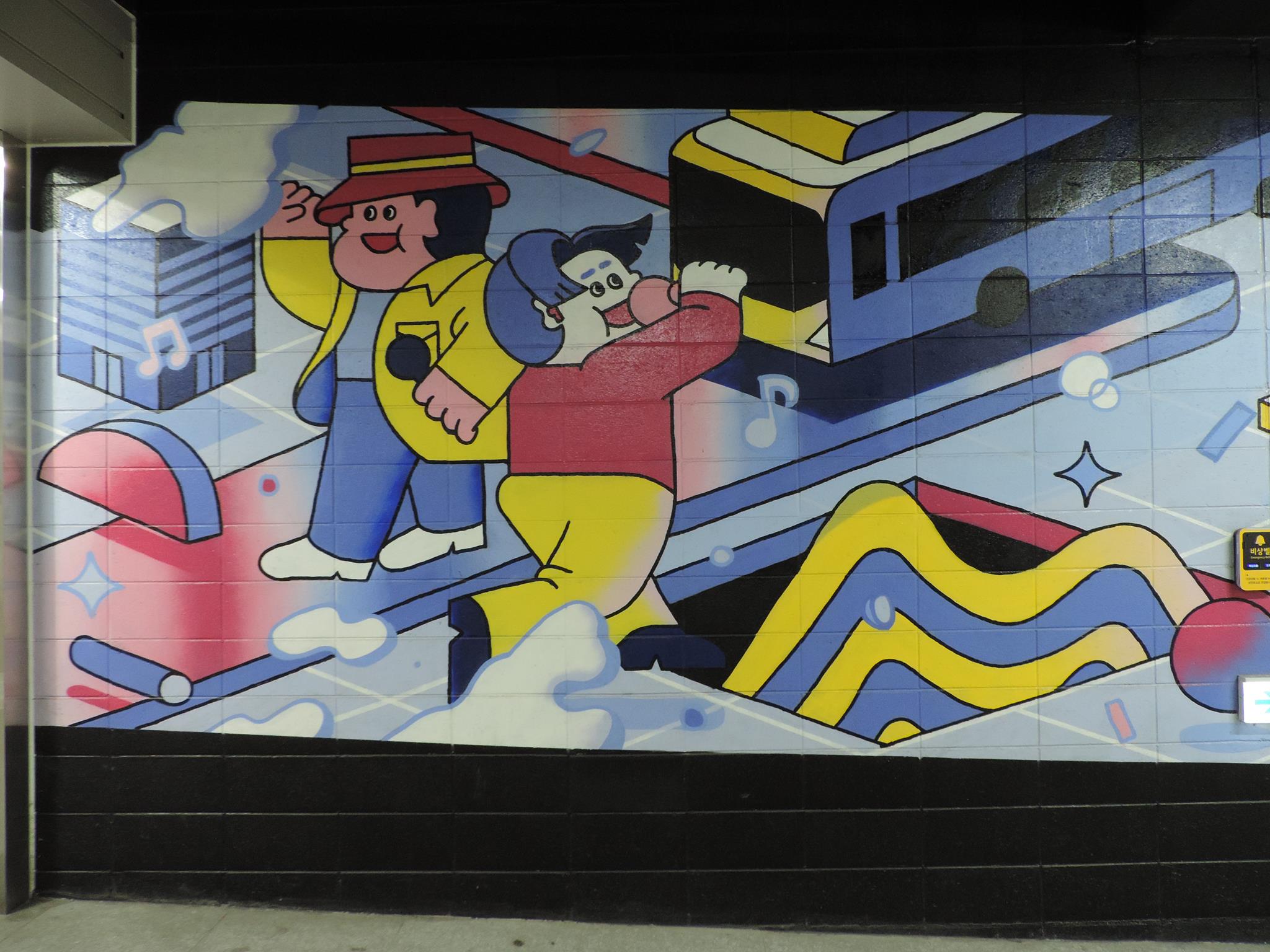 Each artist has interpreted the hour in their own style, resulting in a wide variety of techniques, from graffiti to comics to manga and abstraction. The passage has become an extensive underground gallery that provides a good insight into the Korean streetart scene. While you’re there, you should also stop by the tourist office, which is highly recommended. The staff can provide lots of information about streetart locations around and other tips. When you reach the end of the tunnel, assuming you started in the south, another masterpiece by Spanish artist LALONE awaits you in the northern foyer, featuring Picasso motifs to mark the city partnership between Seoul and Malaga.
