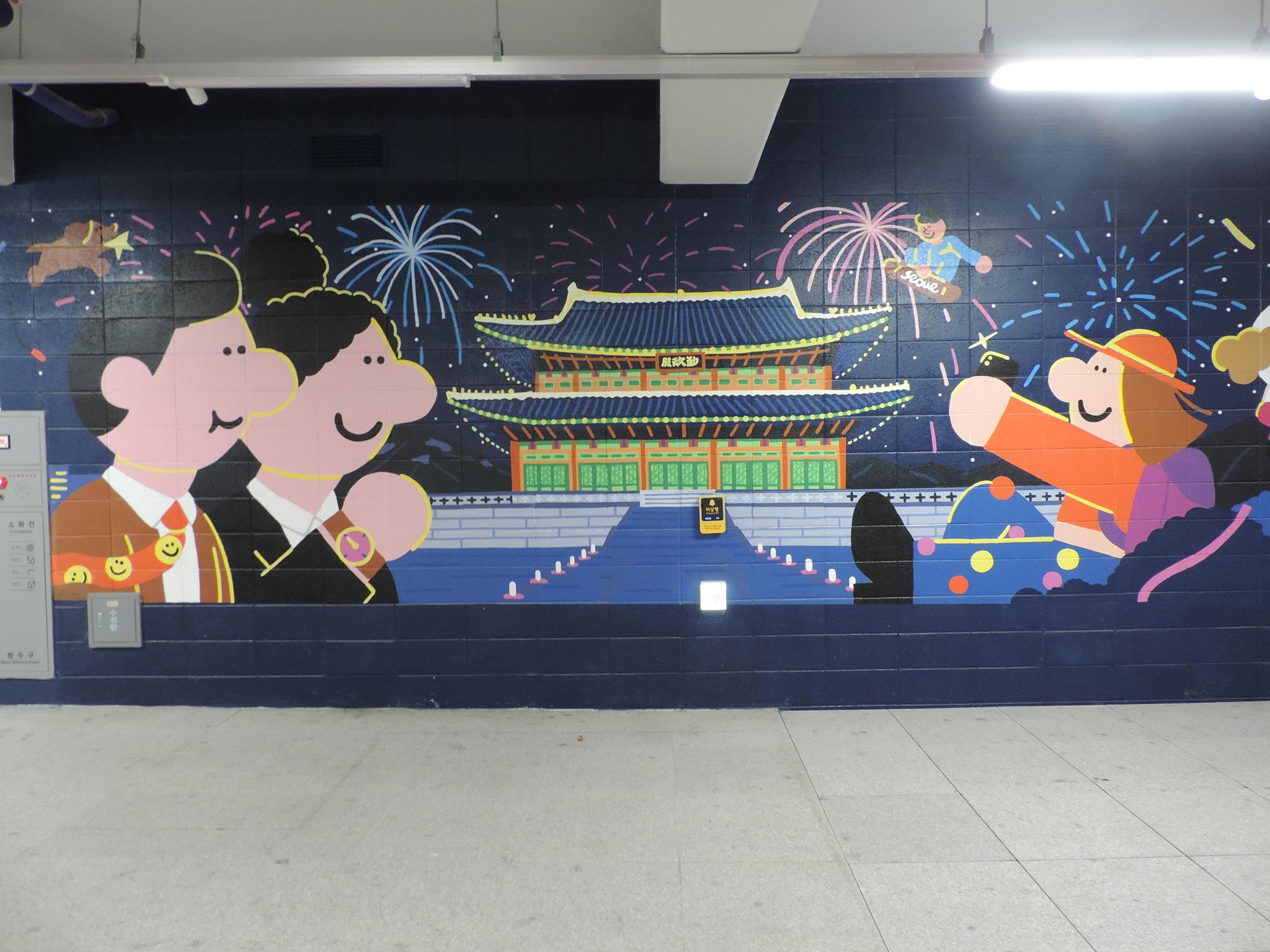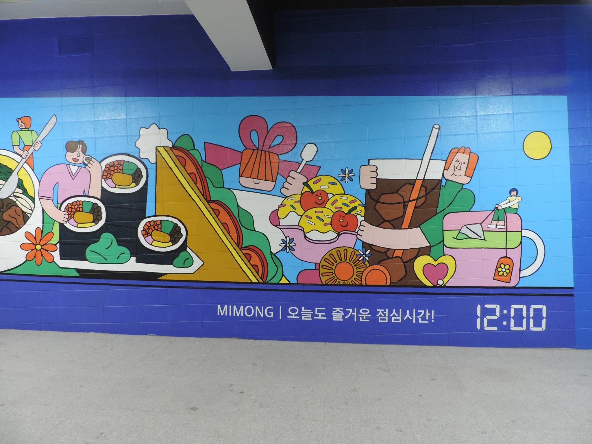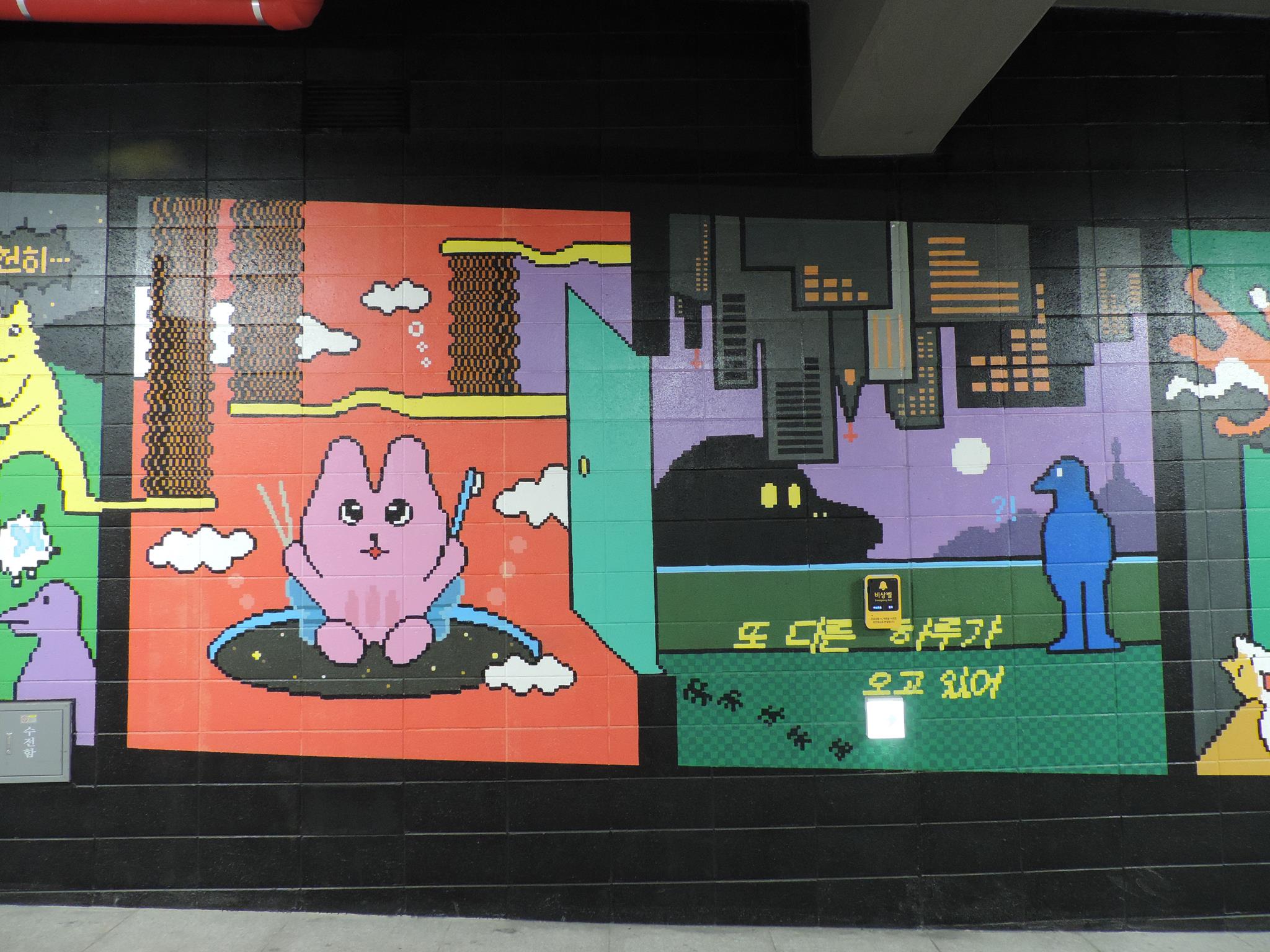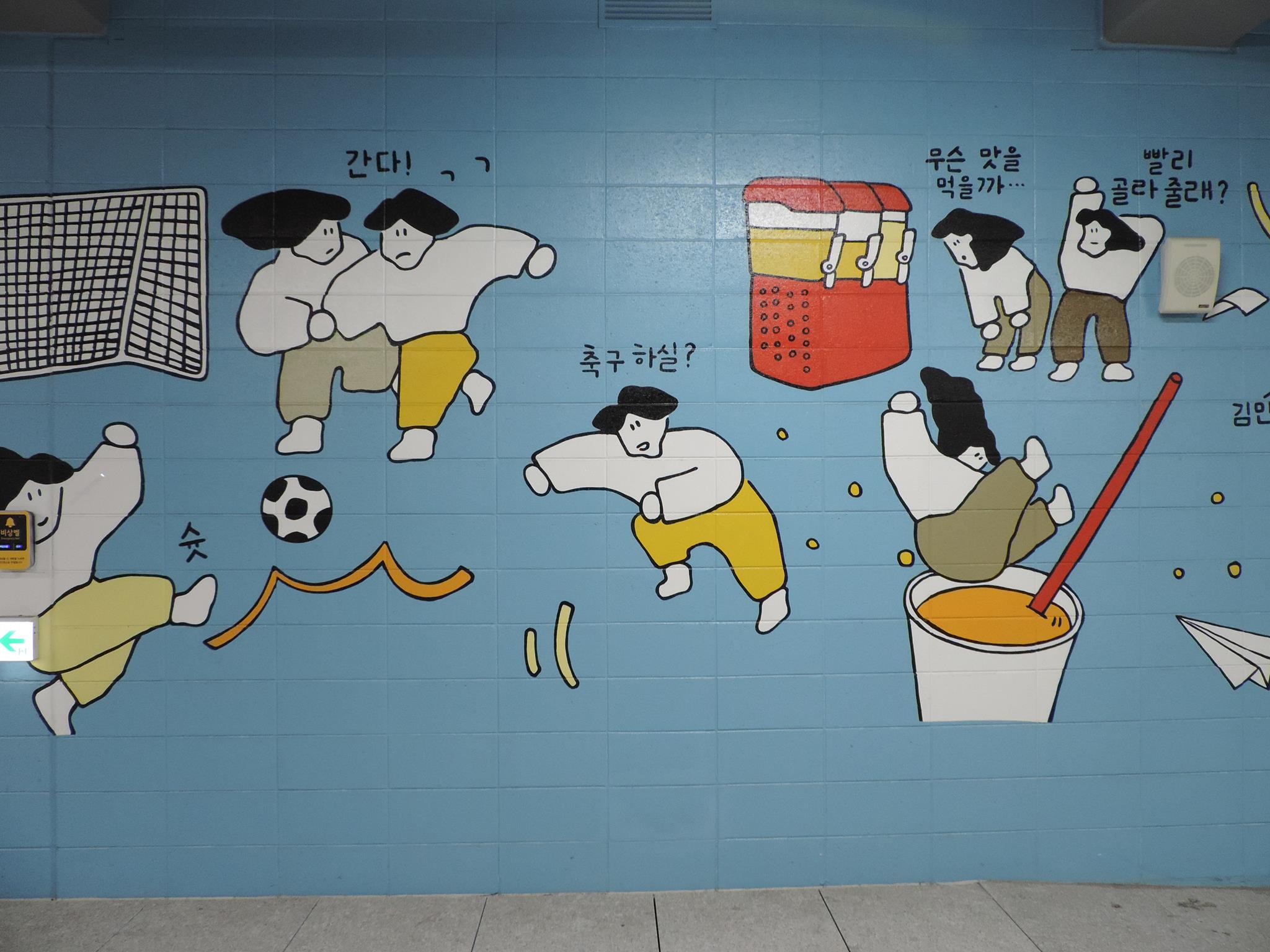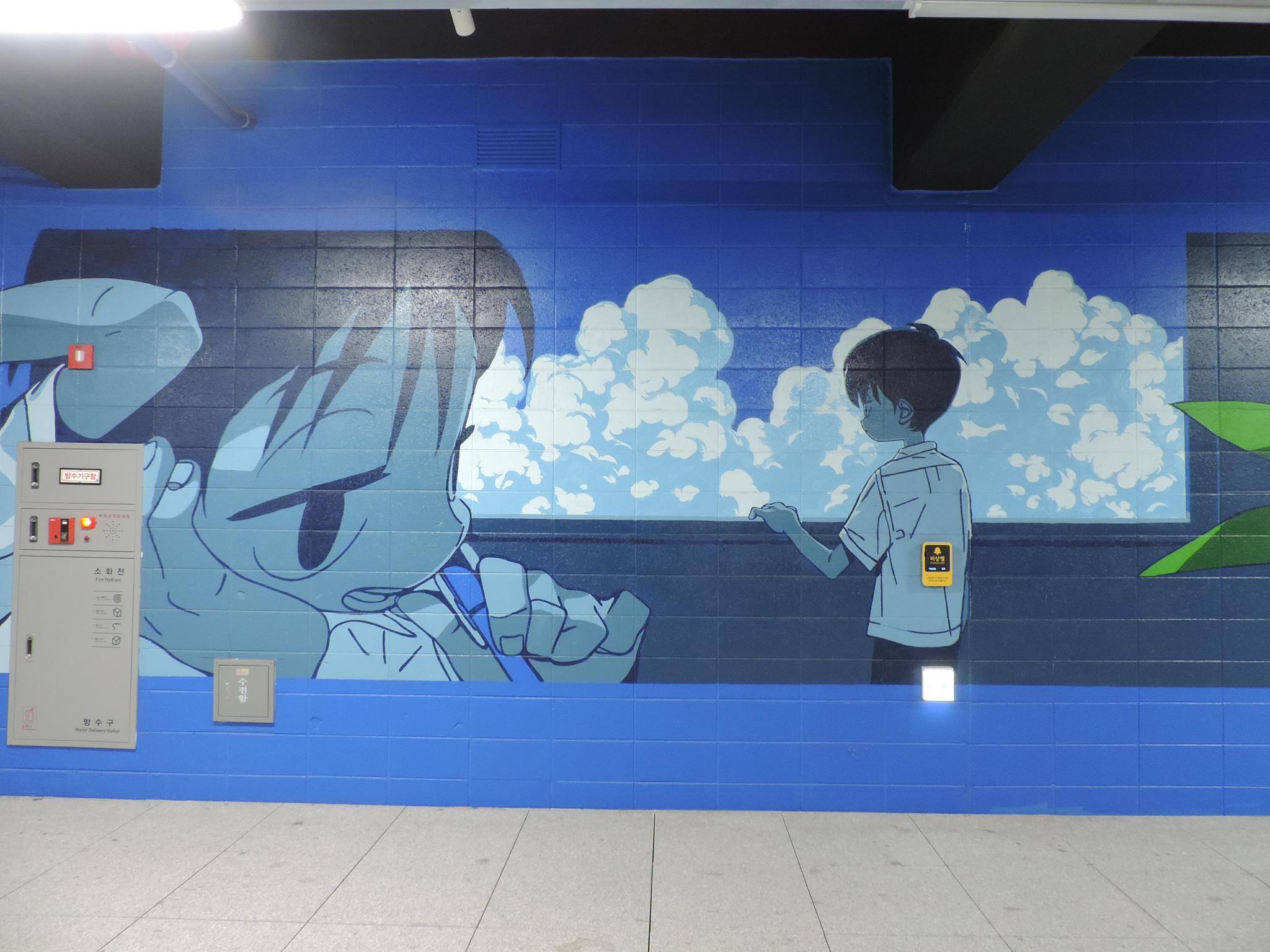 Each artist has interpreted the hour in their own style, resulting in a wide variety of techniques, from graffiti to comics to manga and abstraction. The passage has become an extensive underground gallery that provides a good insight into the Korean streetart scene. While you’re there, you should also stop by the tourist office, which is highly recommended. The staff can provide lots of information about streetart locations around and other tips. When you reach the end of the tunnel, assuming you started in the south, another masterpiece by Spanish artist LALONE awaits you in the northern foyer, featuring Picasso motifs to mark the city partnership between Seoul and Malaga.
