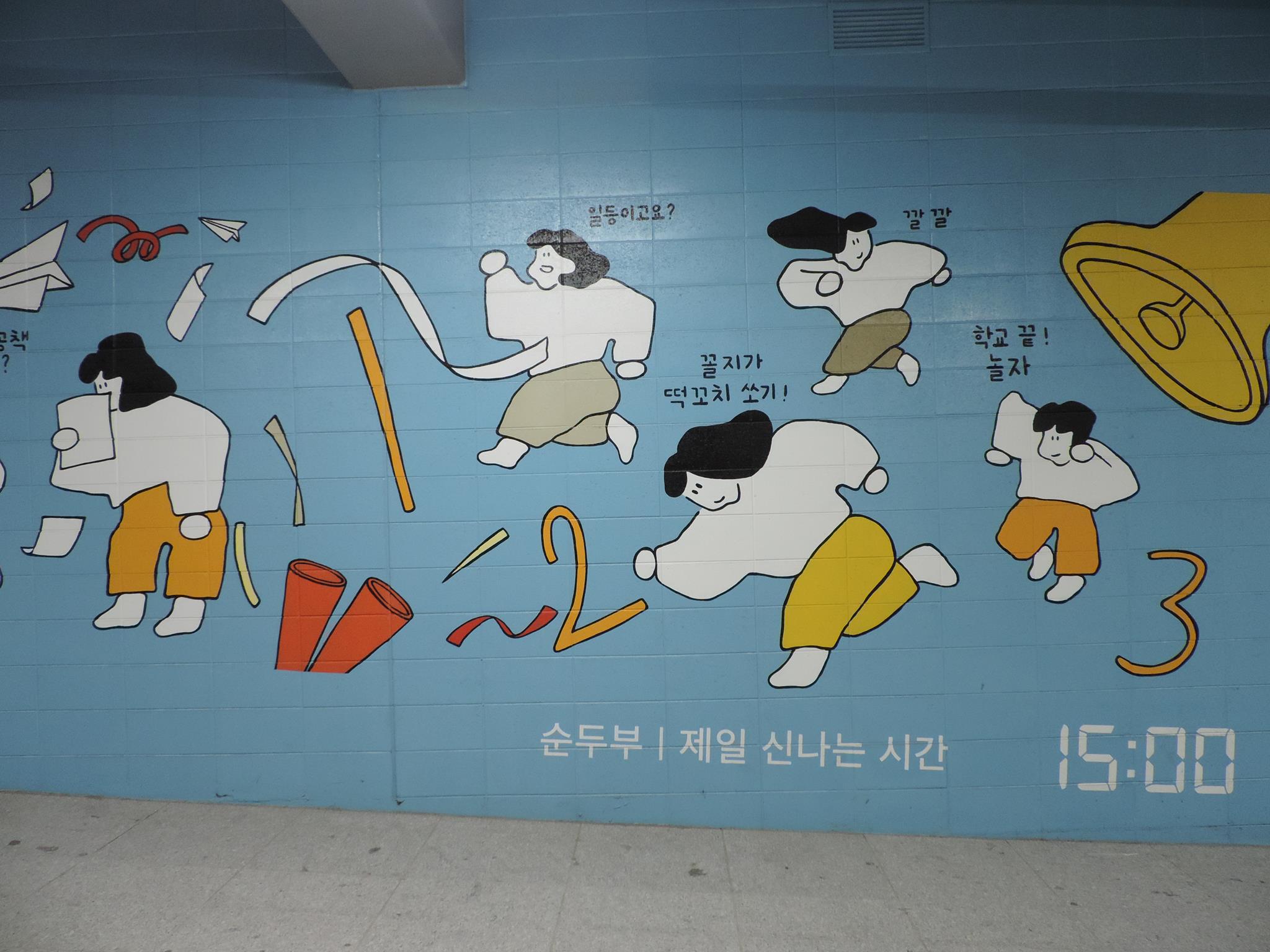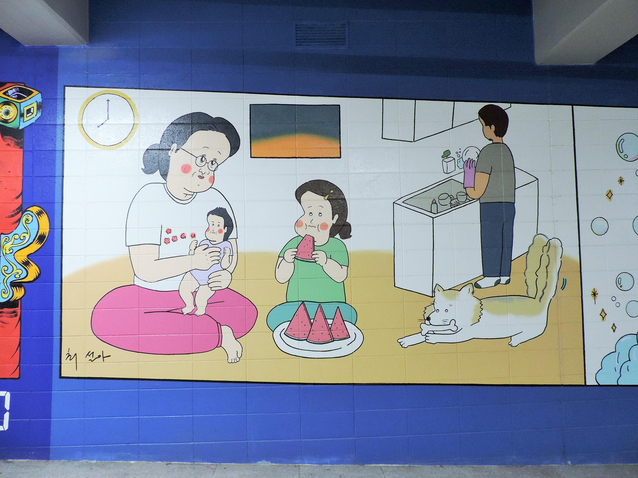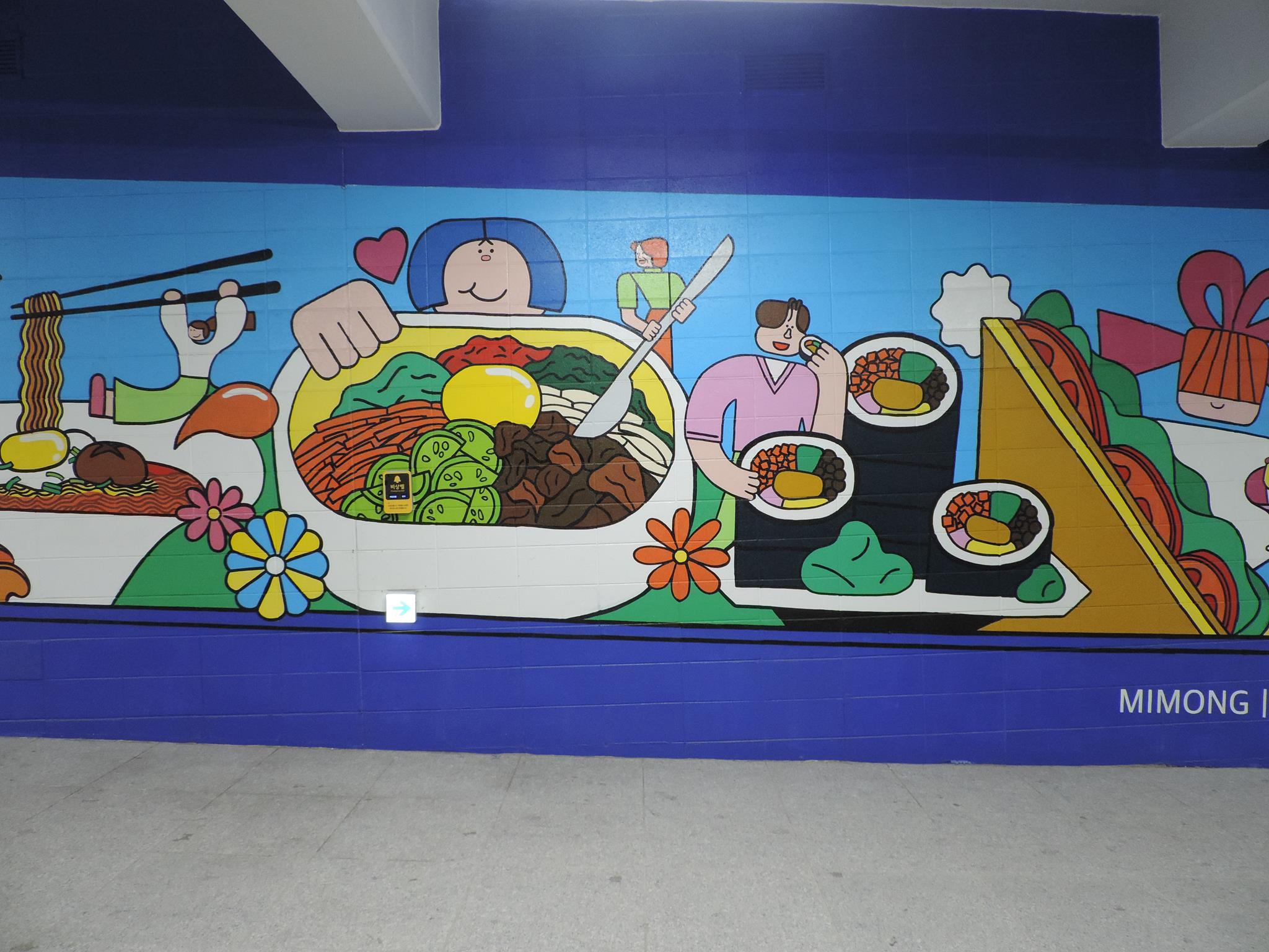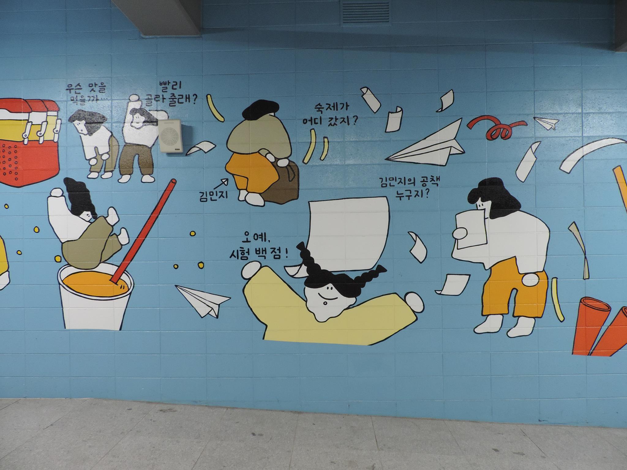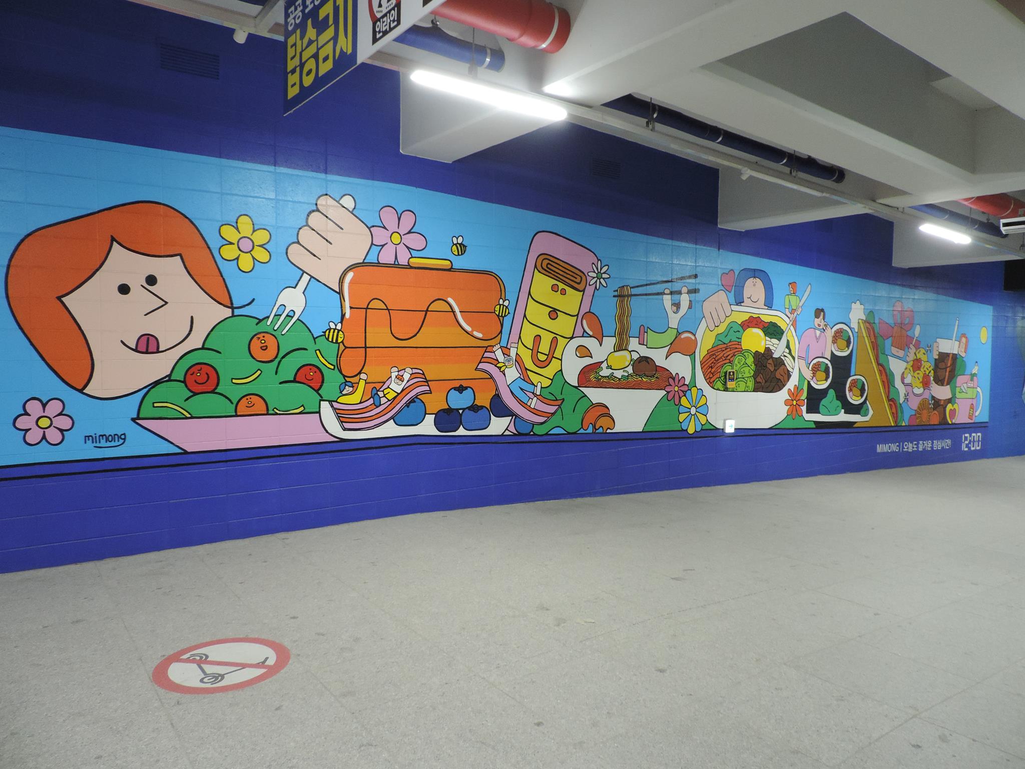 Each artist has interpreted the hour in their own style, resulting in a wide variety of techniques, from graffiti to comics to manga and abstraction. The passage has become an extensive underground gallery that provides a good insight into the Korean streetart scene. While you’re there, you should also stop by the tourist office, which is highly recommended. The staff can provide lots of information about streetart locations around and other tips. When you reach the end of the tunnel, assuming you started in the south, another masterpiece by Spanish artist LALONE awaits you in the northern foyer, featuring Picasso motifs to mark the city partnership between Seoul and Malaga.