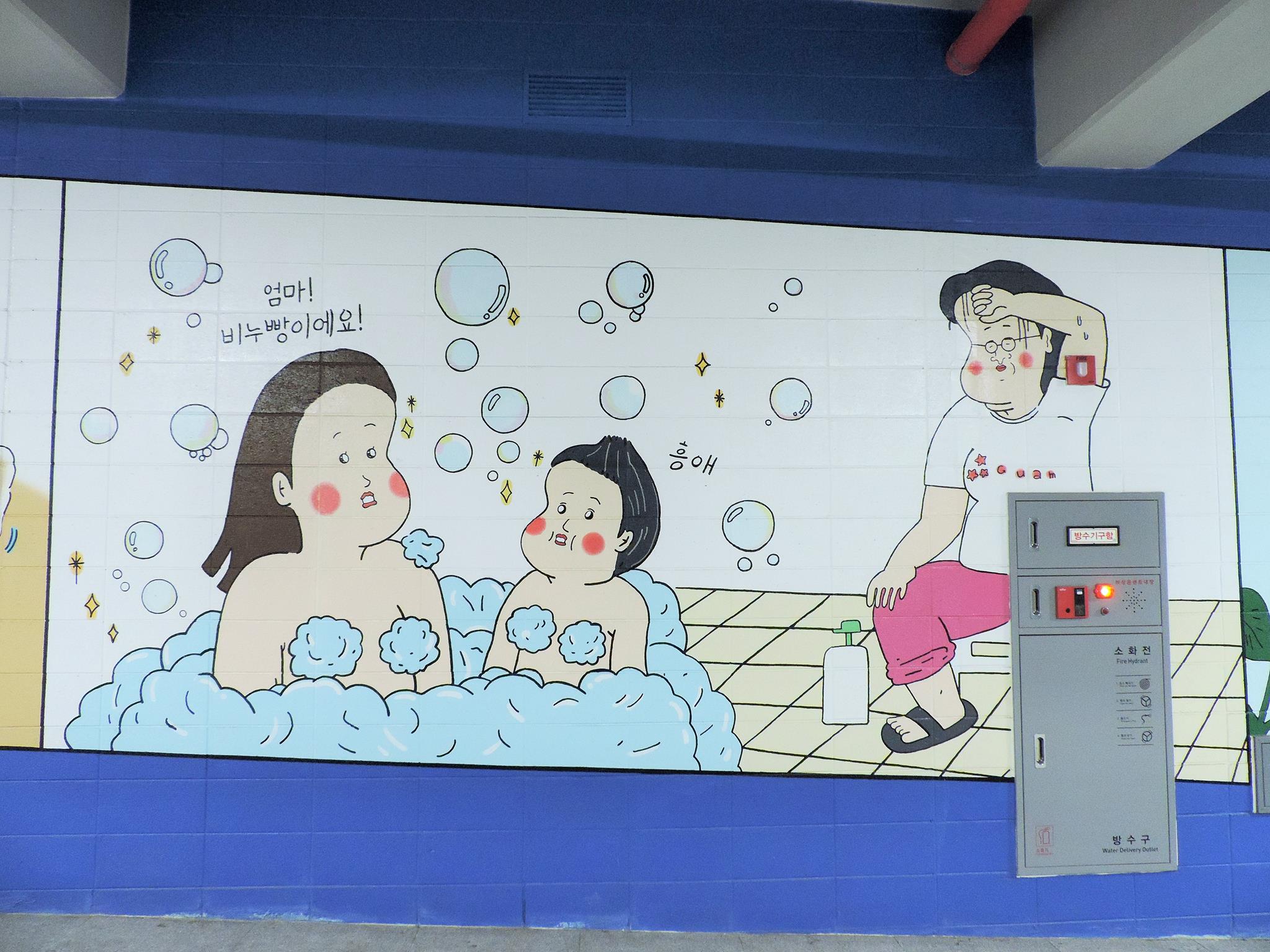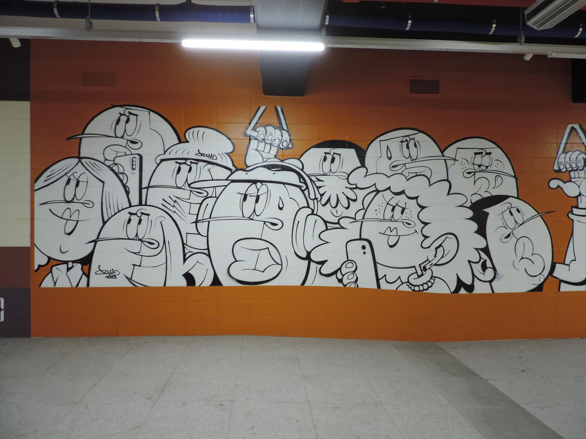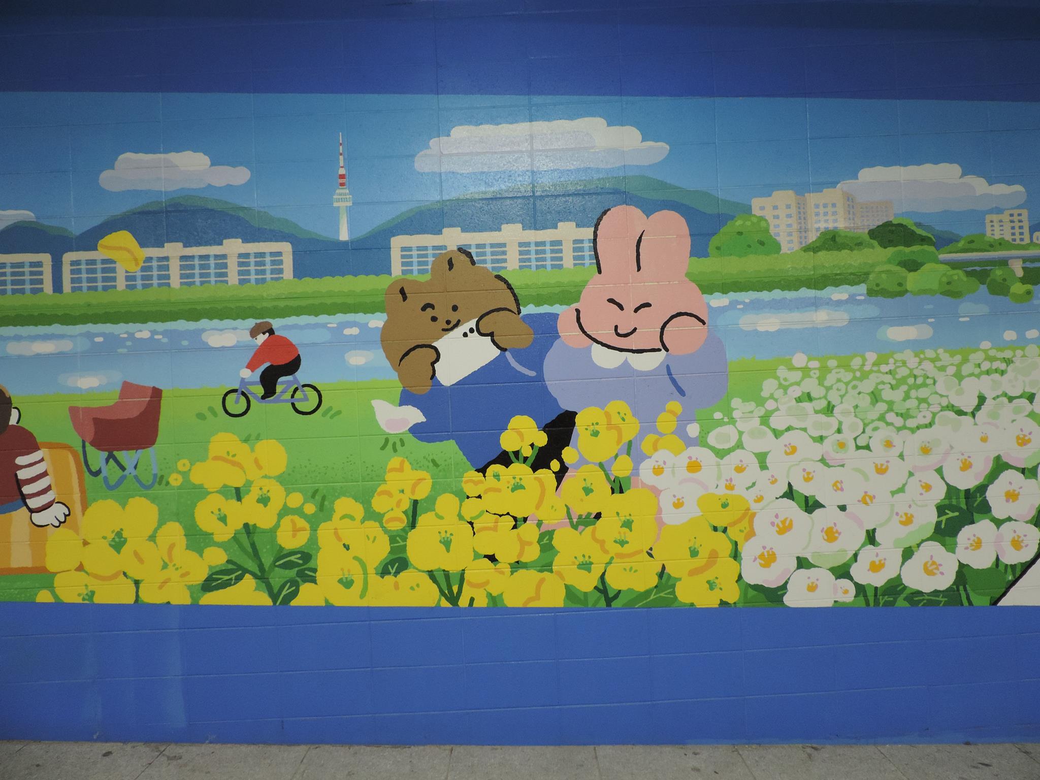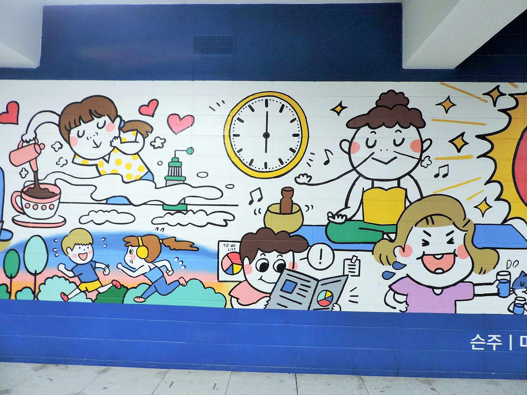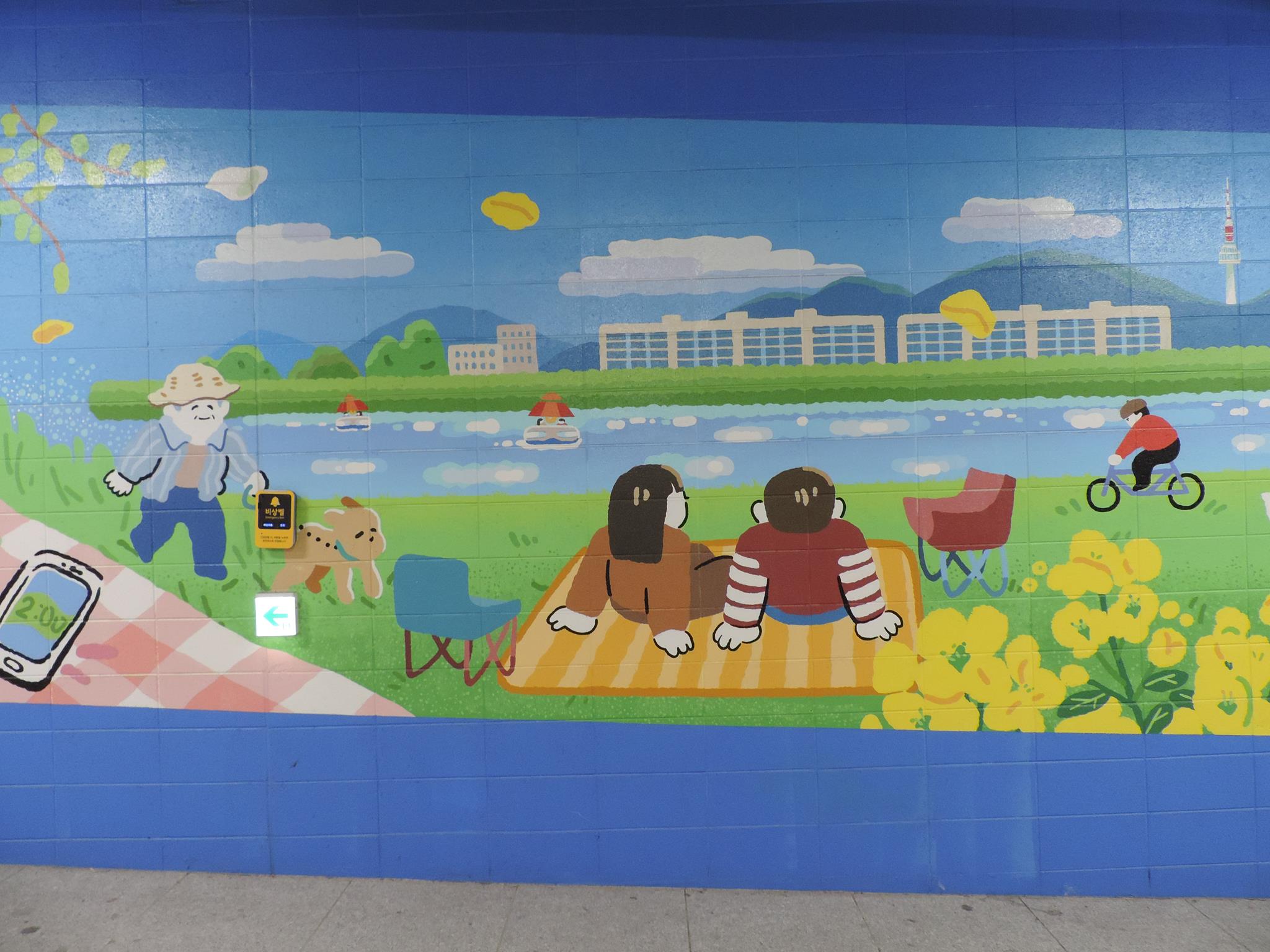 Each artist has interpreted the hour in their own style, resulting in a wide variety of techniques, from graffiti to comics to manga and abstraction. The passage has become an extensive underground gallery that provides a good insight into the Korean streetart scene. While you’re there, you should also stop by the tourist office, which is highly recommended. The staff can provide lots of information about streetart locations around and other tips. When you reach the end of the tunnel, assuming you started in the south, another masterpiece by Spanish artist LALONE awaits you in the northern foyer, featuring Picasso motifs to mark the city partnership between Seoul and Malaga.