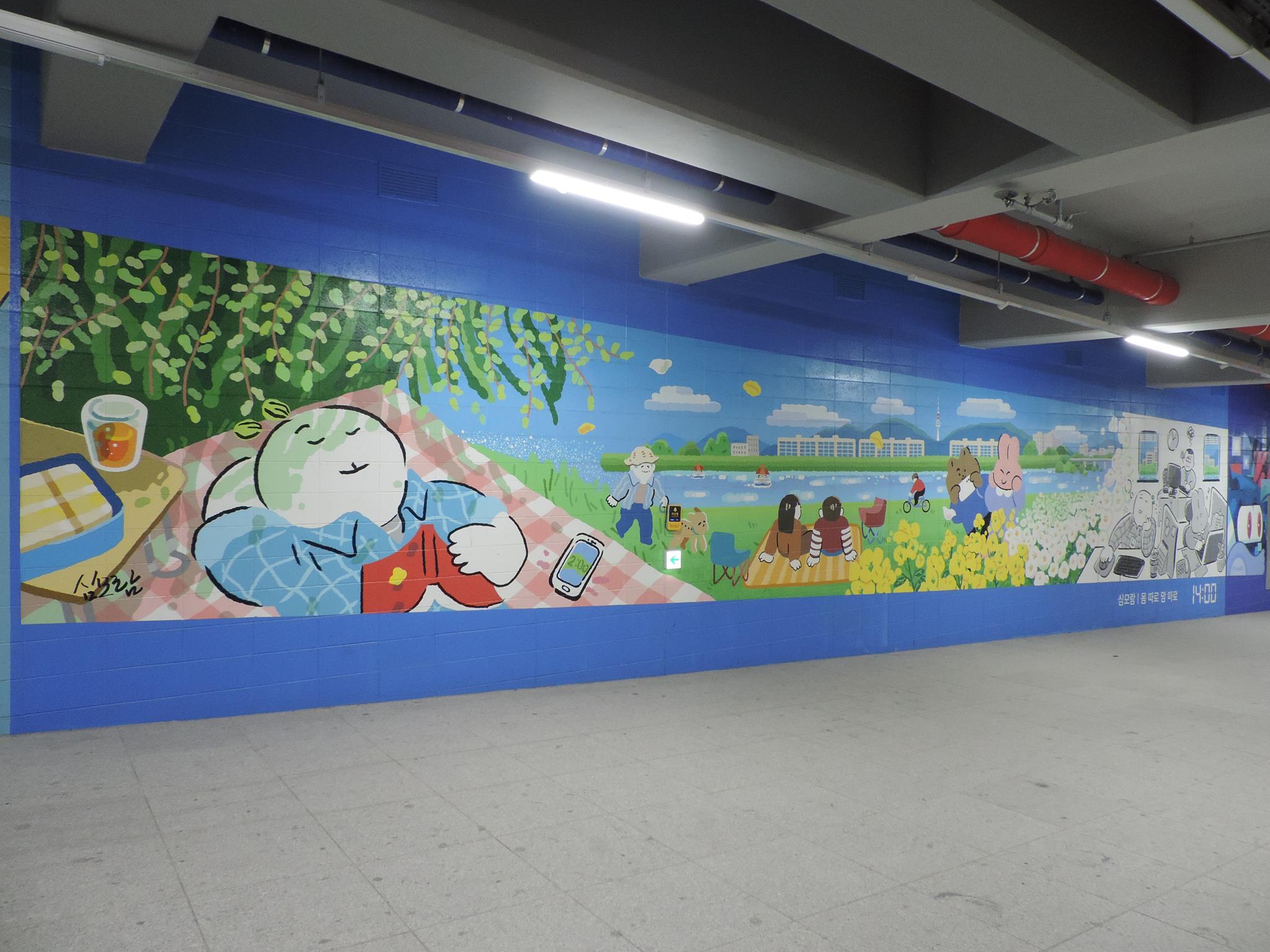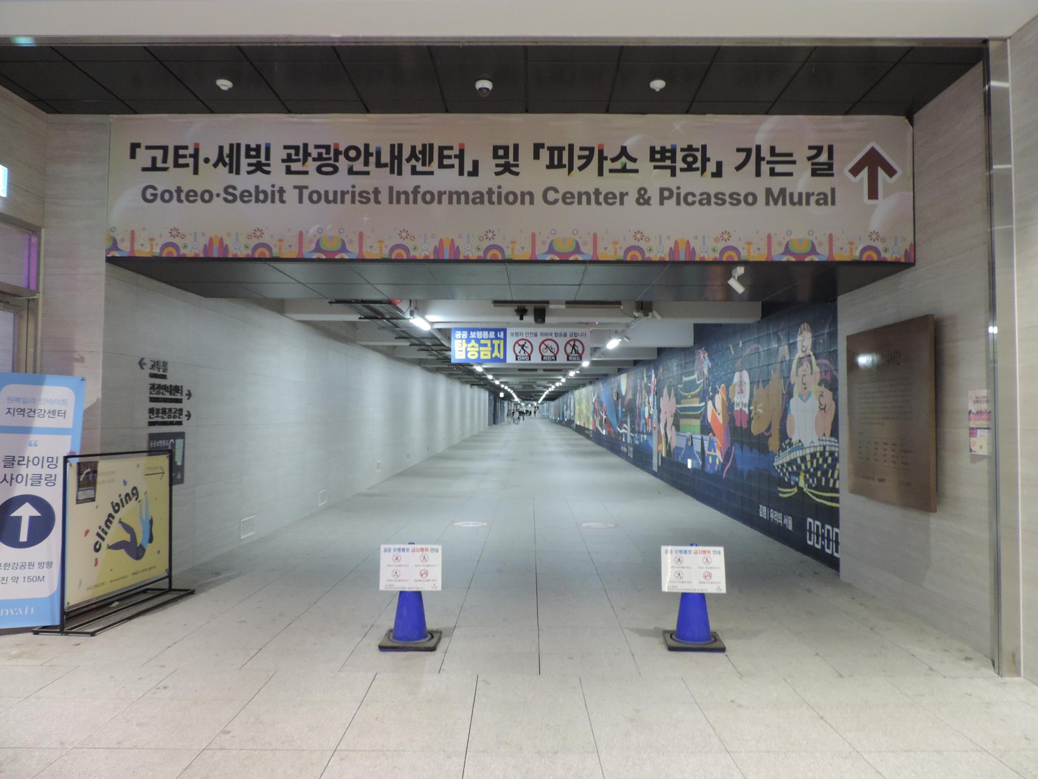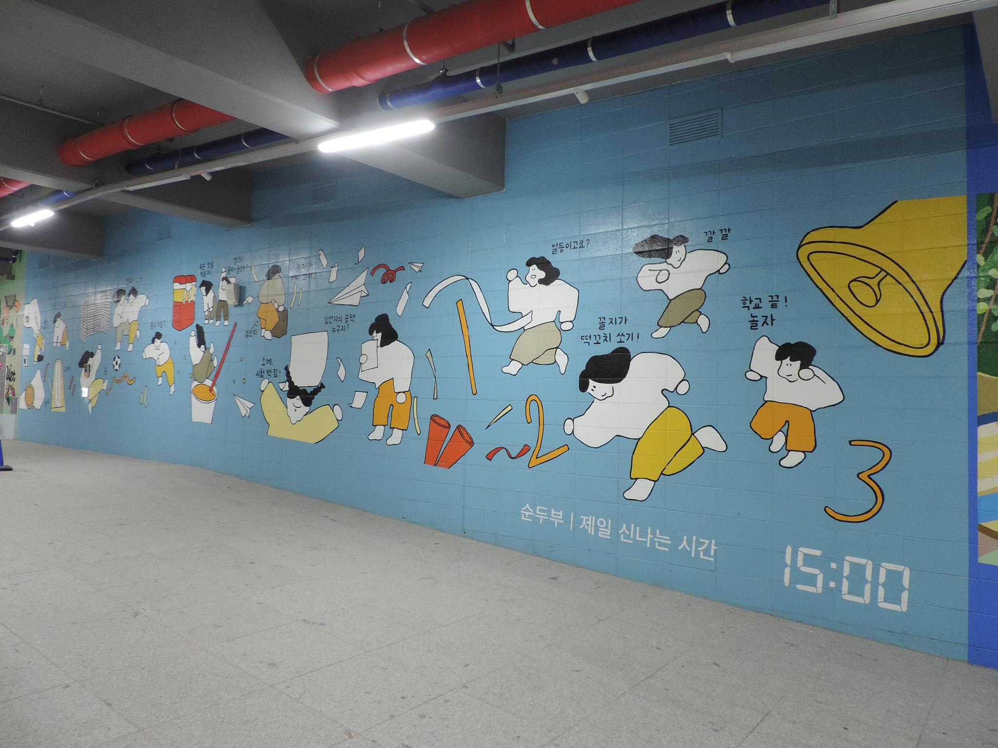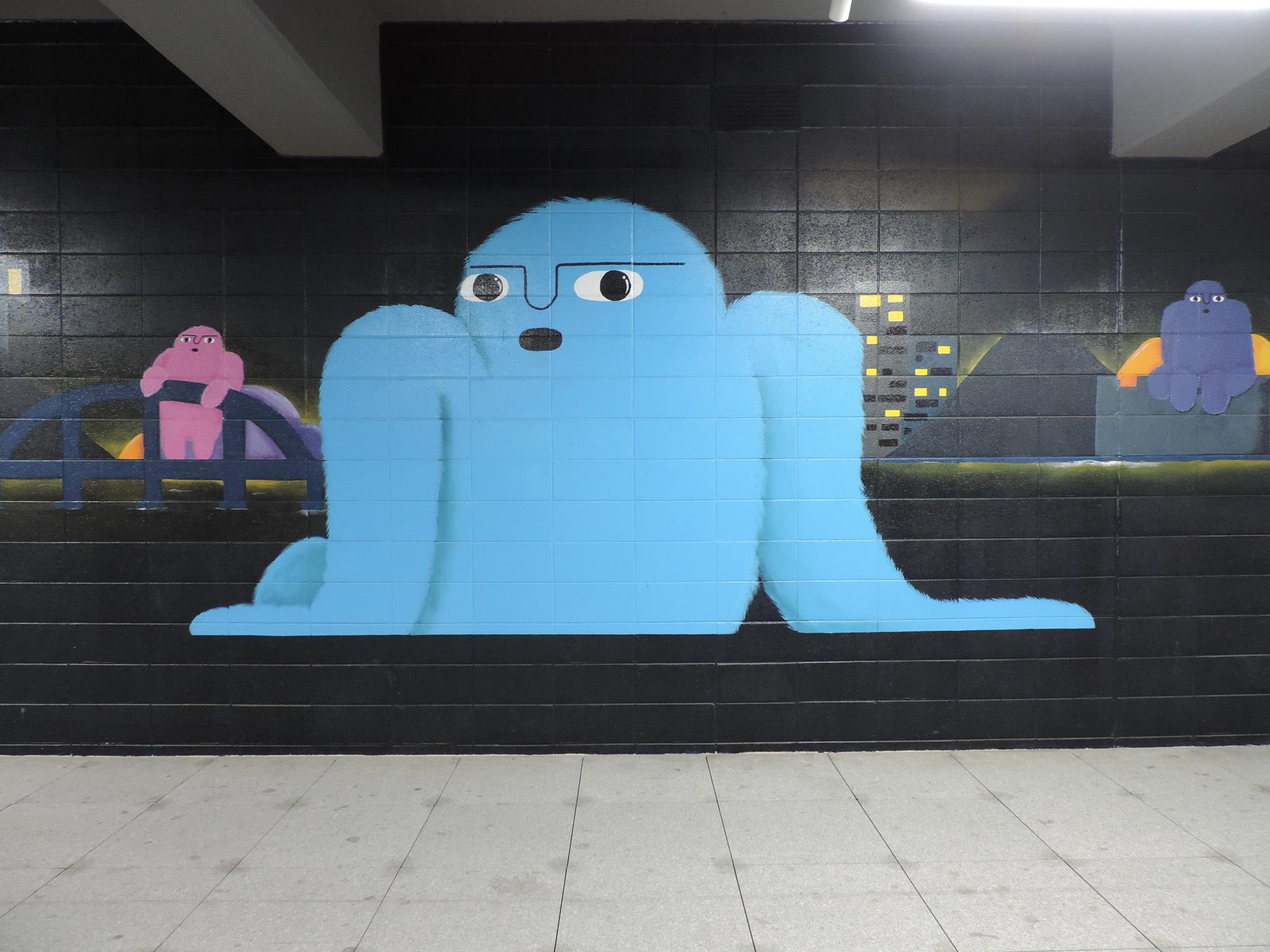 Each artist has interpreted the hour in their own style, resulting in a wide variety of techniques, from graffiti to comics to manga and abstraction. The passage has become an extensive underground gallery that provides a good insight into the Korean streetart scene. While you’re there, you should also stop by the tourist office, which is highly recommended. The staff can provide lots of information about streetart locations around and other tips. When you reach the end of the tunnel, assuming you started in the south, another masterpiece by Spanish artist LALONE awaits you in the northern foyer, featuring Picasso motifs to mark the city partnership between Seoul and Malaga.