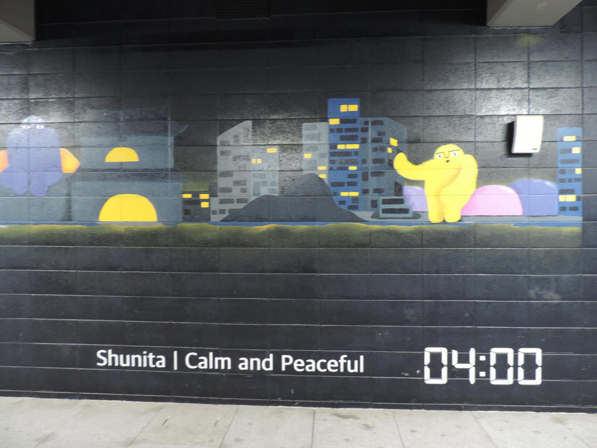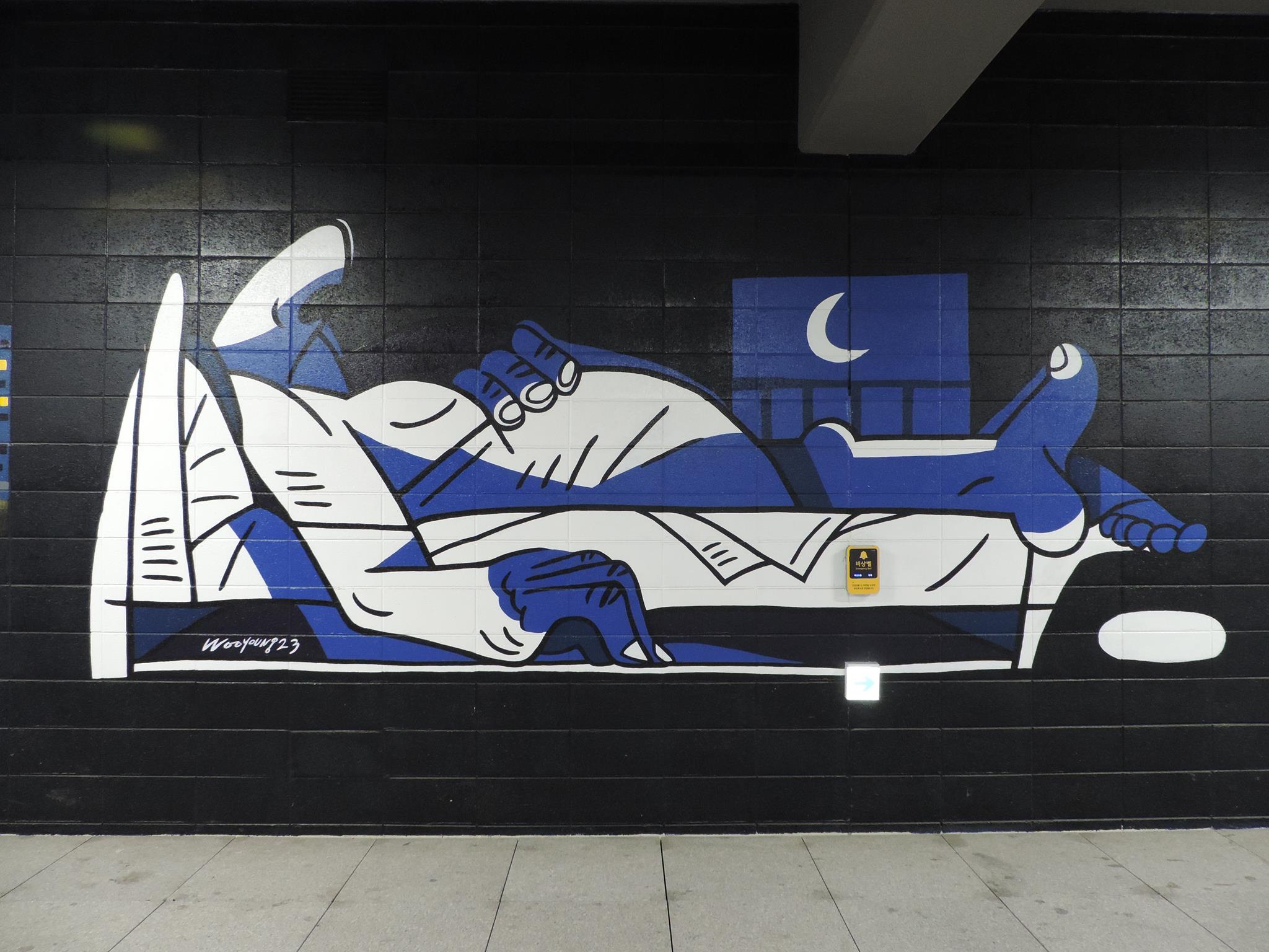 The underground shopping center at Gangnam Terminal is also known as “Goto Mall” and is directly connected to the subway lines 3, 7 and 9. There are more than 600 shops, restaurants, and boutiques located underground here. In addition, several long underground corridors lead away from the mall to other subway stations. One of these corridors is a real gem and a treasure trove for fans of urban art. At the west entrance of GoTo Mall, the path leads north, so don’t go into the mall, but turn into the tunnel in front of it. We made that mistake and ended up wandering around the mall forever looking for graffiti. It’s best to ask for the “Goteo Sebit Tourist Information Center,” which is located right in the middle of the long corridor that leads north under Banpo-daero Street to Hangnam Park on the Han River. Along this approximately 500-meter-long walkway passage, the magnificent “24 Hours Project” was created at the RAEMIAN ONE BAILEY STREETART GALLERY in 2024, in which 24 renowned Korean artists each created a work that deals with a specific hour of the day. From 0:00 to 24:00, with motifs about getting up, from lunchtime to rush hour or going to sleep. Pedestrians can experience Seoul’s daily rhythm through creative and also amusing artworks.