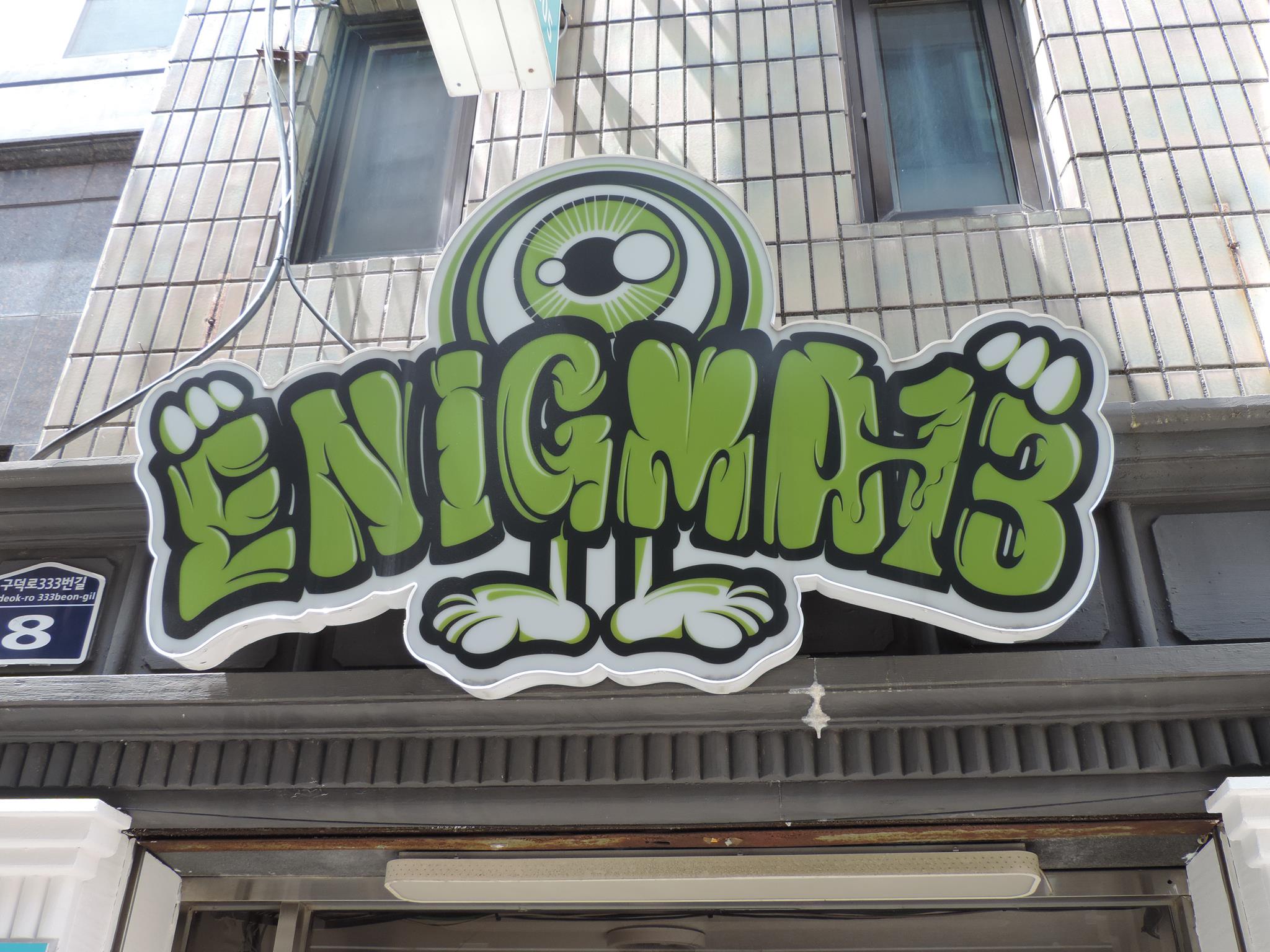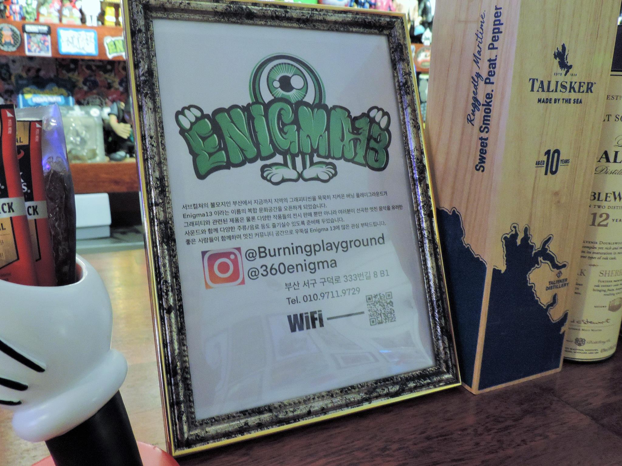 Store Description: In Busan, a wasteland of graffiti culture, Burning Playground, which has been silently protecting the local graffiti scene, has opened a complex cultural space called Enigma13. In addition to exhibiting and selling various works of art, including graffiti-related products, we have prepared a variety of alcoholic beverages and music to enjoy along with the beautiful sound of your choice. We ask for your interest in Enigma13, which will stand tall as a wonderful community space with good people. – Enigma13