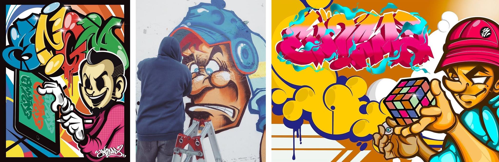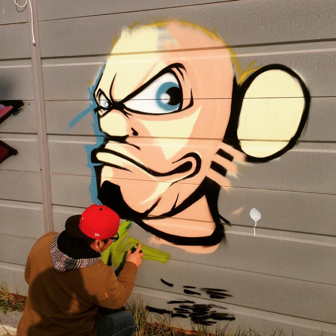 Tell us more about your graffiti. You paint letters but also characters. Mostly hip hop guys or breakers in a gangster style, but not photorealistically, rather comically.