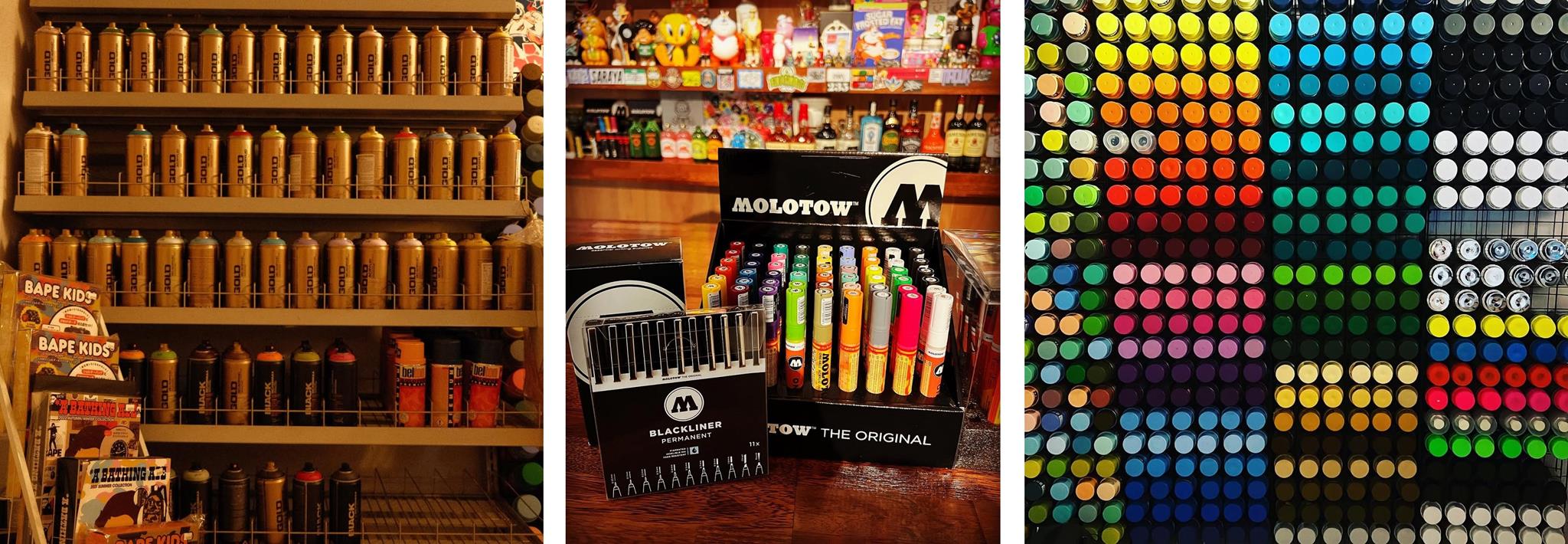 Yes, we sell graffiti-related spray paints and various nozzle markers, and Korean graffiti artists send us their drawings and exhibit them. We order from a large Korean importer. Mainly the spray cans are from MOLOTOW. But we only sell offline, and order books online. We also get help with magazines from the CMK CREW in Japan.