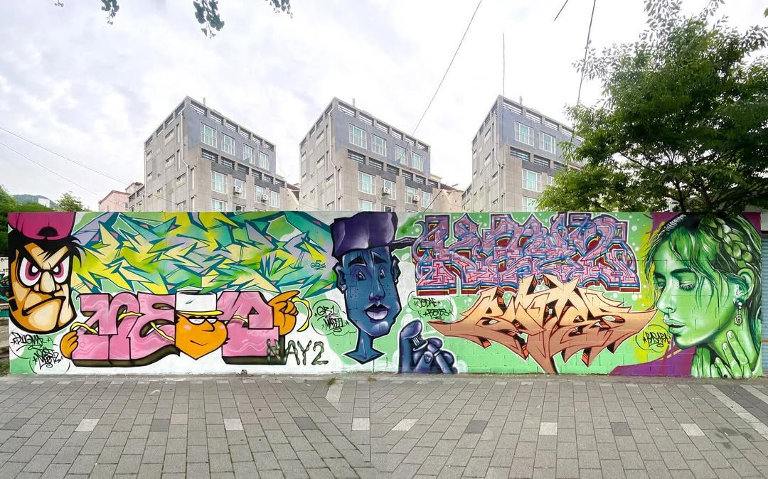 Busan is considered a wasteland of subculture, so it is poor in terms of graffiti. However, young artists who are just starting out are gradually finding spots and drawing pictures, and the number of artists is increasing one by one. It is hard to find public spray spots, but they draw pictures at skateboard shops, redevelopment areas, or after consulting with the owner of the wall. The demand for spray cans is not high yet, but it is gradually increasing. Most graffiti artists from Busan are active in Seoul, but young artists are also slowly moving Busan.