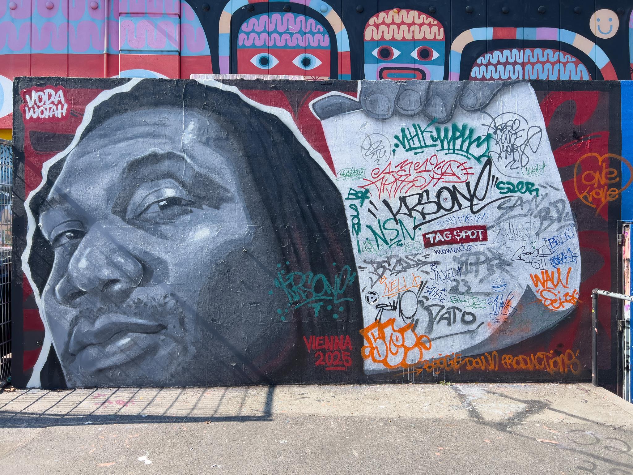 That was a really dope project! I painted it a week before KRS One’s live show in Vienna, right in front of the club where he was performing. I created a piece of him holding a piece of paper that said “KRS One tag spot,” so that people could tag the paper themselves. At that time, I didn’t even know if he would notice it. But I prepared a print for him with a picture of the wall and went to the club a couple of hours before the show. His wife saw the print and invited me backstage, where KRS One was. We spoke a bit, and he was the coolest and most grounded person ever. Then, just before the live show, when everyone was already inside the club, he came outside and tagged the wall himself. That was such a powerful moment for me.