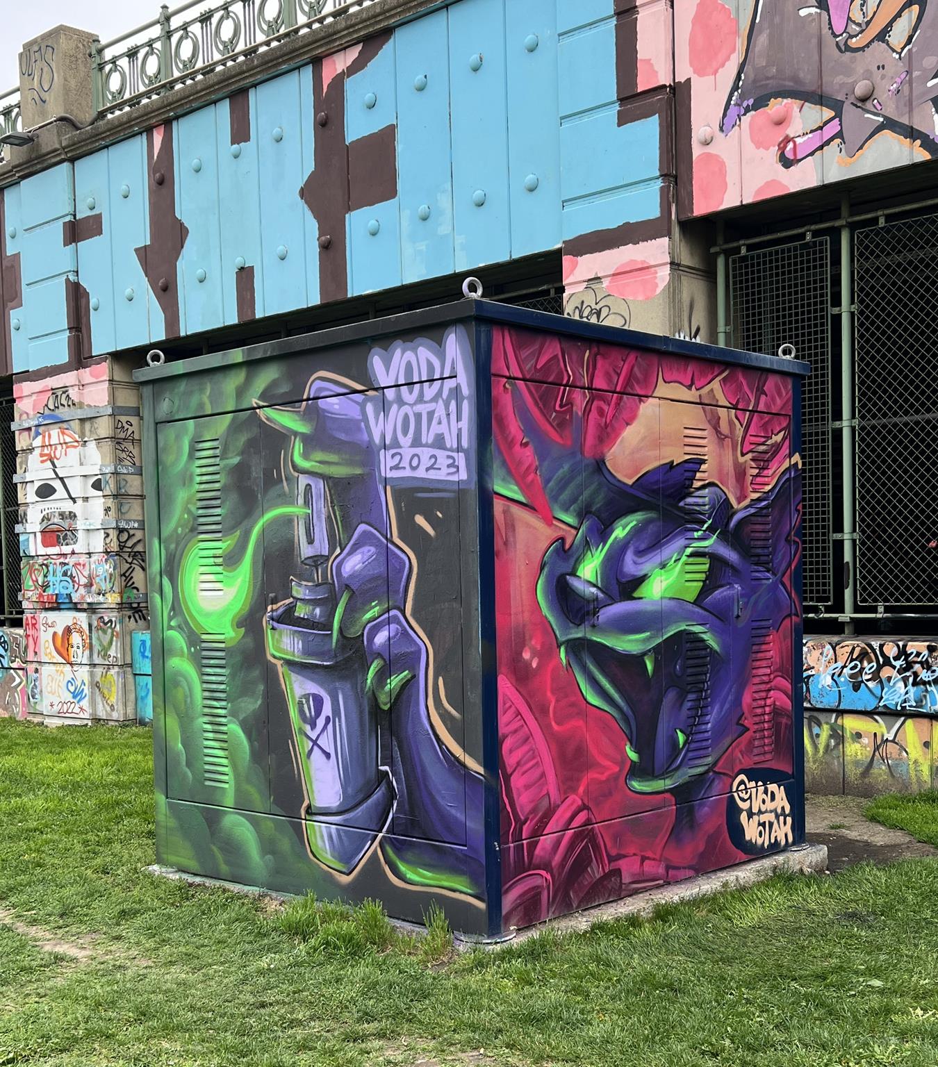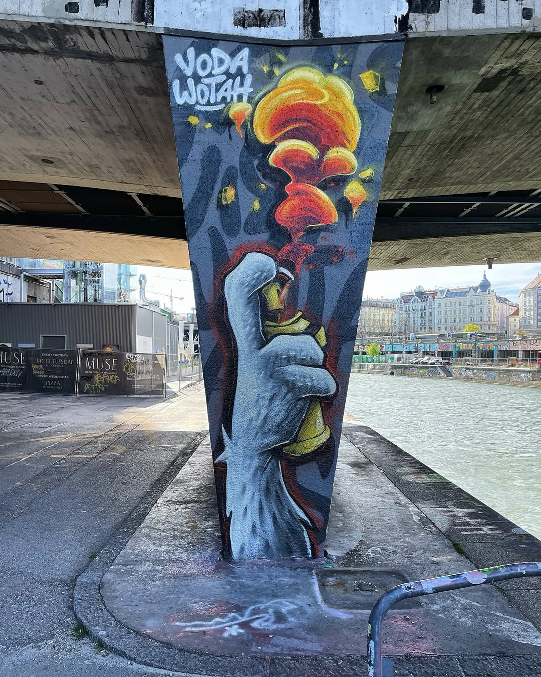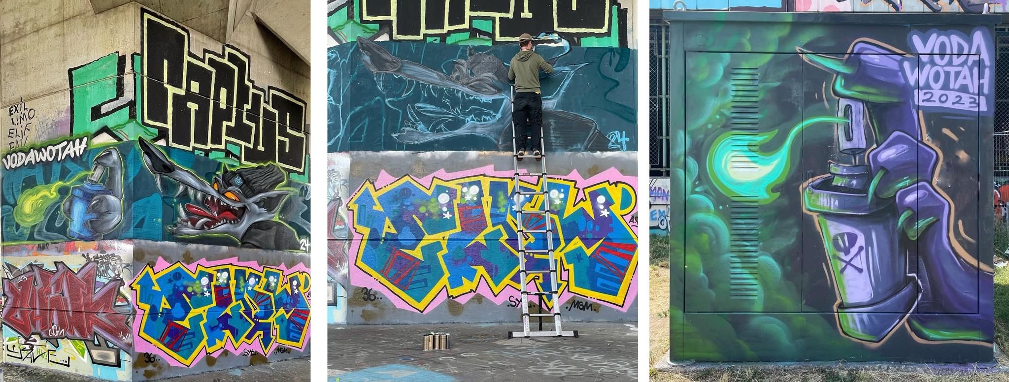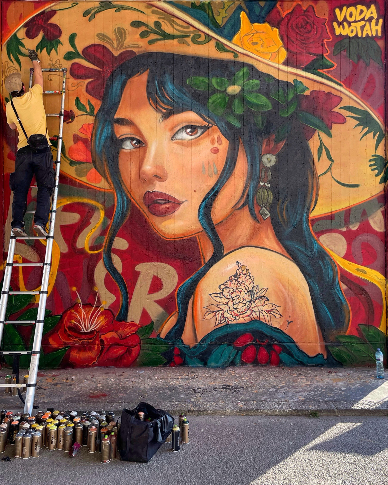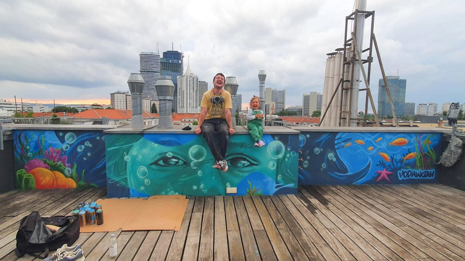 The artist MARTIN IVANOV, better known as VODAWOTAH, started with graffiti and streetart in 2008 in the Bulgarian city of Ruse. Meanwhile he lives in Vienna, Austria, where he regularly paints magnificent works on the Danube Canal and huge murals around the city or abroad. The colorful hobby has become a profession and he creates extensive commissioned works, but of course also continues to spray as a passion funtime. His fantastic works often feature comic style portraits, but also animal like characters or lively spray cans.