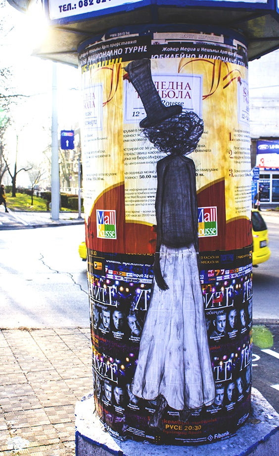 That was an absolutely amazing project. It was actually one of my first paste-up projects. I did it just before I graduated from university, and it was kind of part of my graduation, but I did it independently. I searched in the library in Ruse, Bulgaria for old historical photos, and then I mixed them with the characters I was creating at that time and pasted them around. Ruse is a very historical city because of the Danube River, and I wanted to connect its rich history with modern street art. Yes, I painted the works on paper first and then pasted them on the walls at the train station.