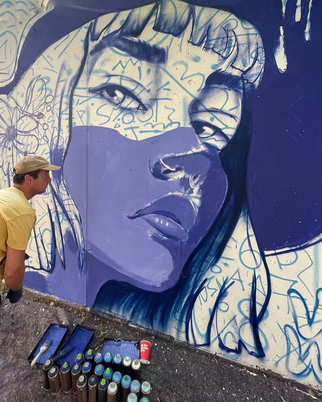 I create my work using both spray paint and acrylics, depending on the surface and scale of the mural. Spray paint gives me the texture I need, especially for large walls, while acrylics allow for more control and detail in certain areas. My characters can be inspired by anything—a face on the street, a fleeting moment, or even just a mood. I gravitate toward bold, bright colors because they bring energy and warmth to the space, and I love creating works that radiate positivity and spark connection, whether it’s a huge wall or a smaller street piece.