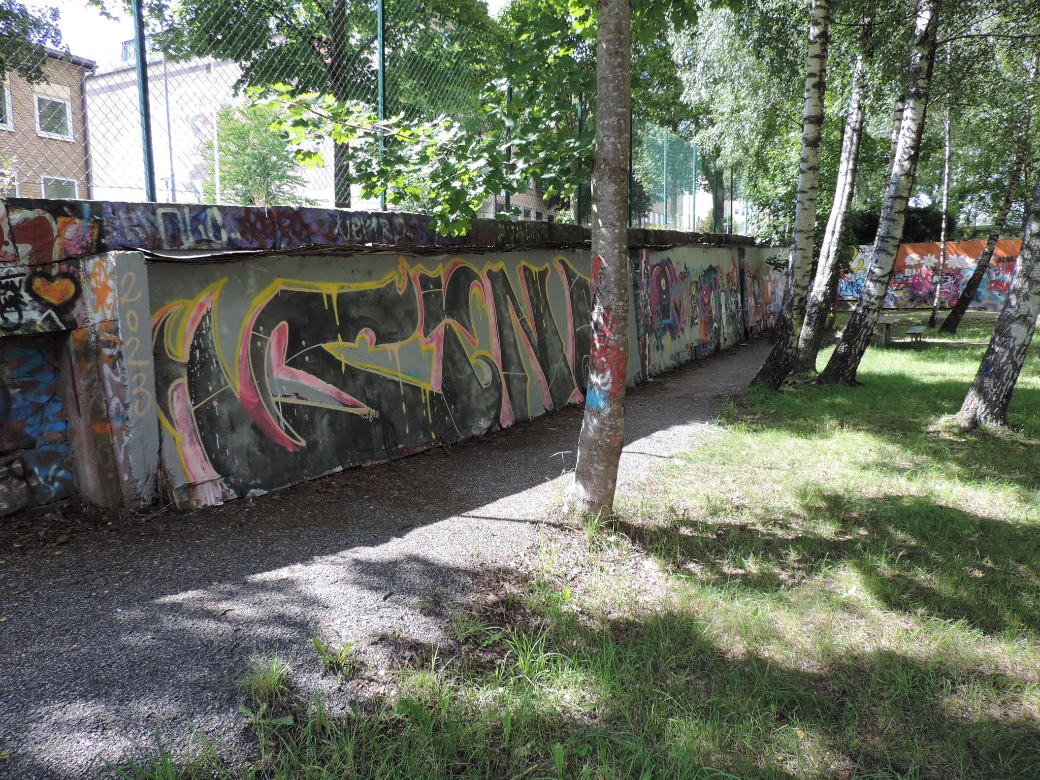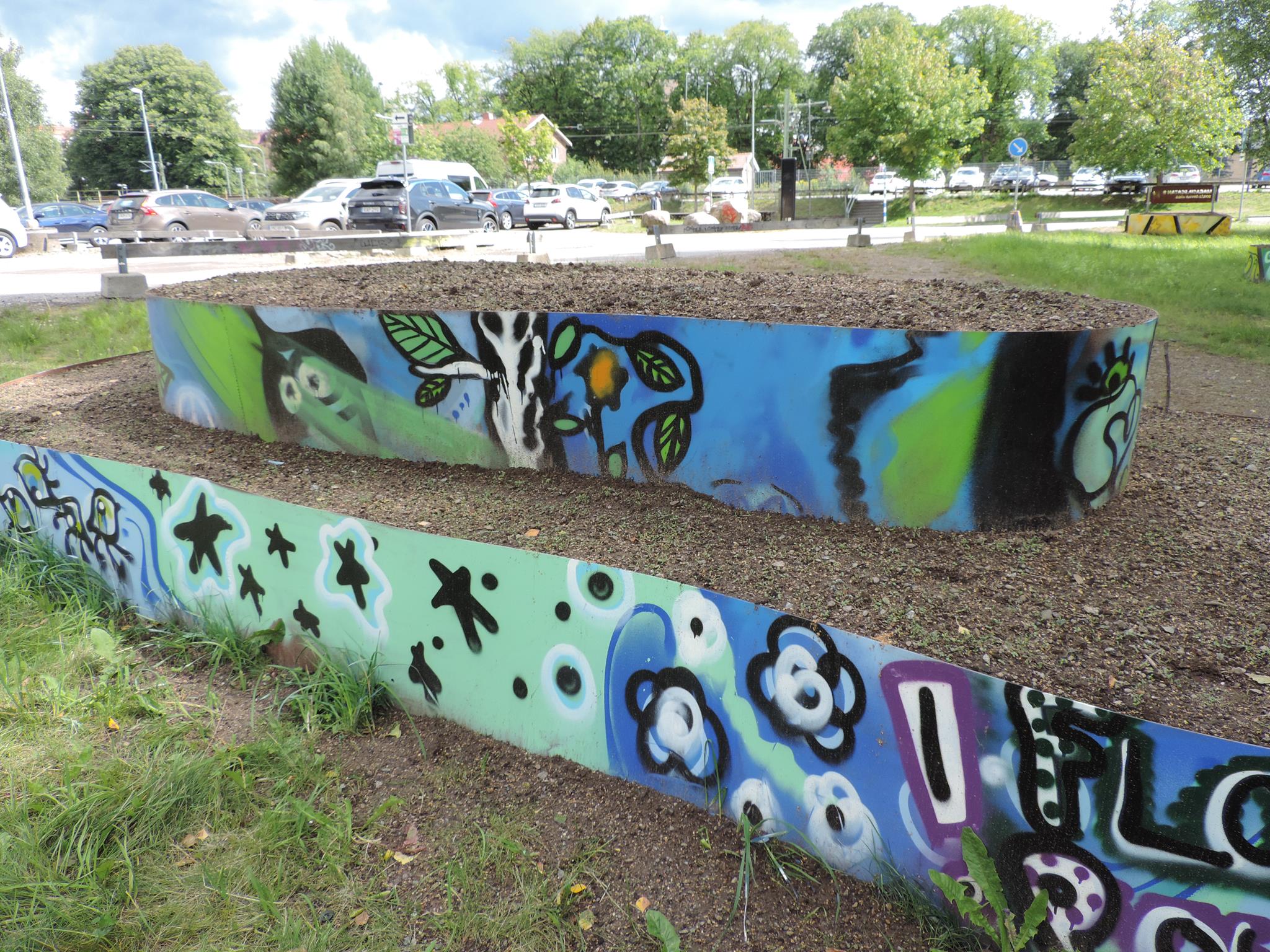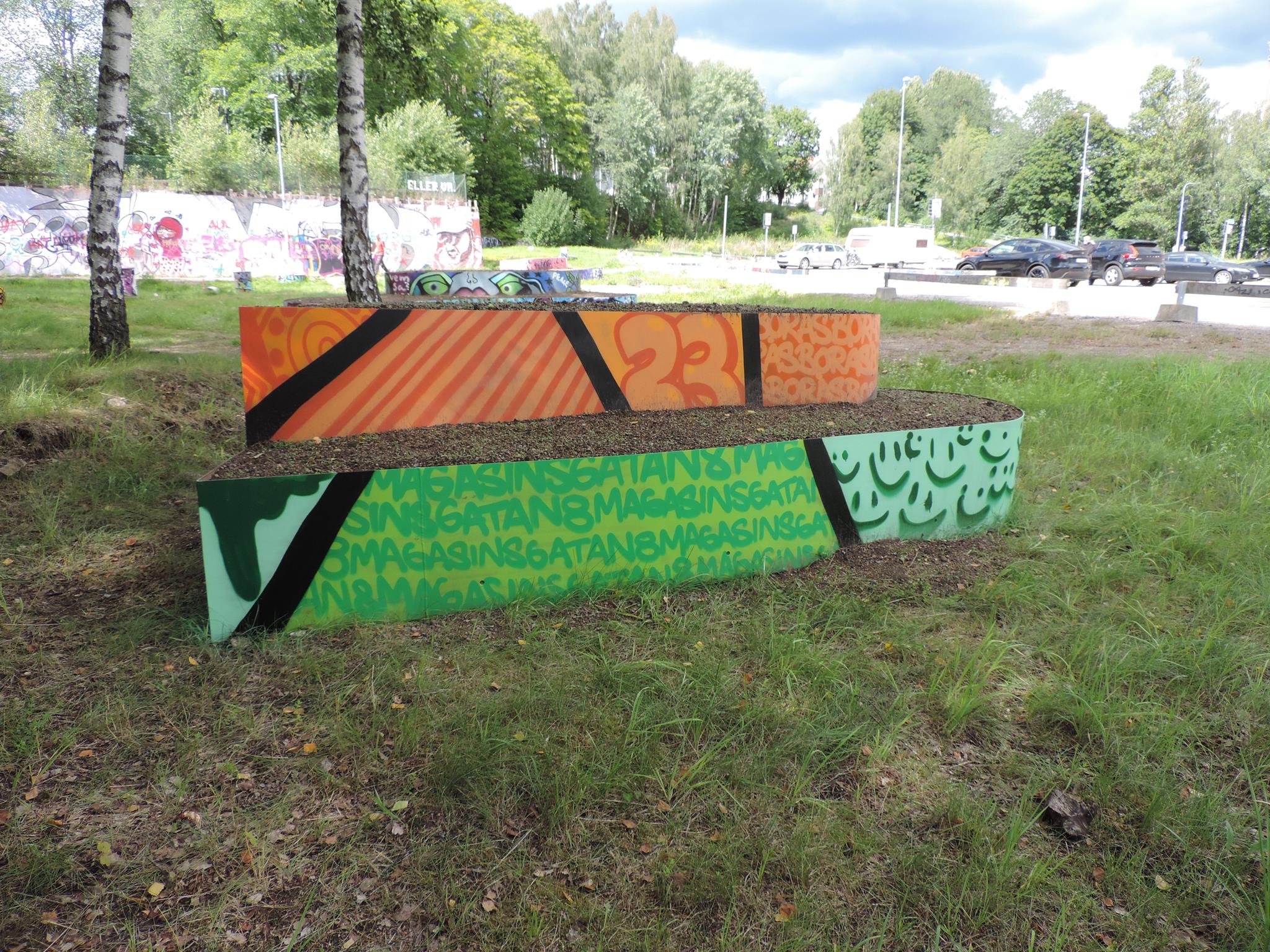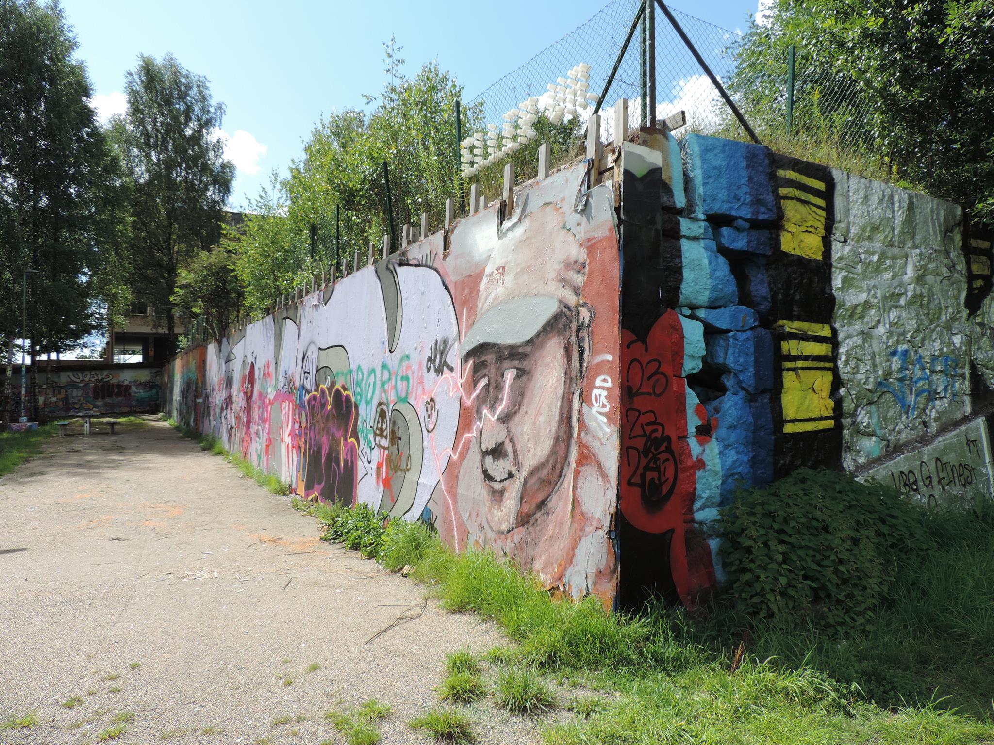 Here everyone, professionals and beginners, children and adults, can express themselves artistically in the middle of Borås. The open wall at Magasinsgatan 8 provides space for everyone who wants to paint and create in public. The facades are 100 meters long and between 0.8 and 3 meters high, with both plastered and boarded surfaces. At the corner of the wall there is a bin for spray cans. The open wall was inaugurated on September 3rd in 2017 in connection to the NO LIMIT urban art festival and was sponsored by XL BYGG, Norrby Trä, and Flügger Färg in Borås.