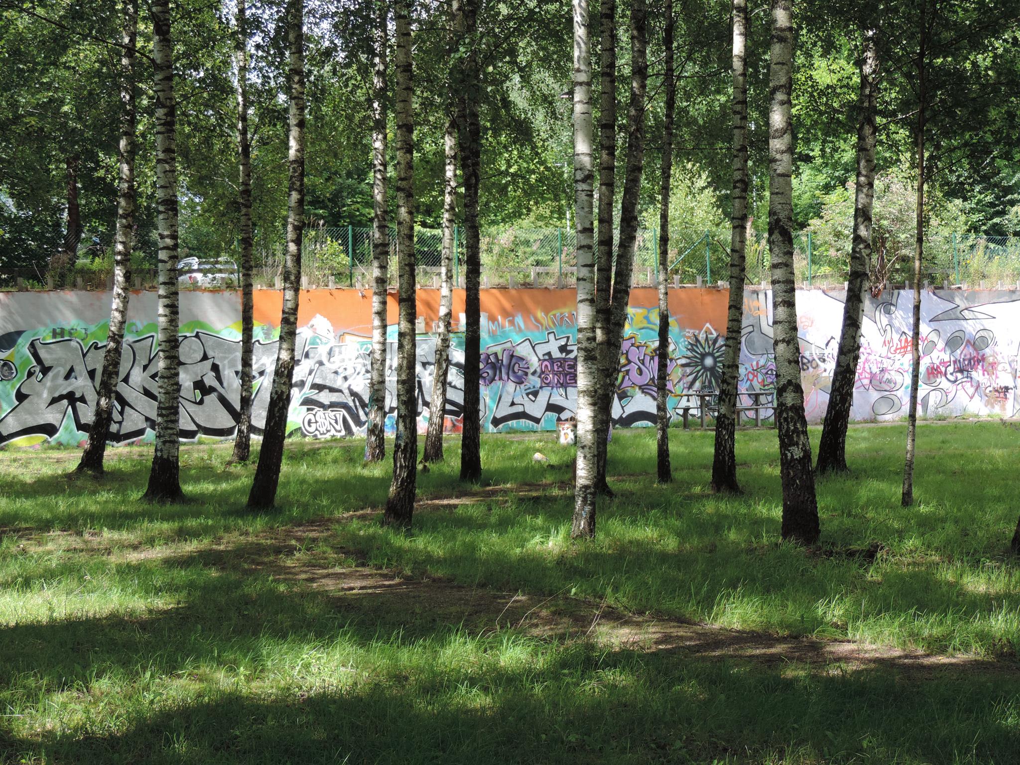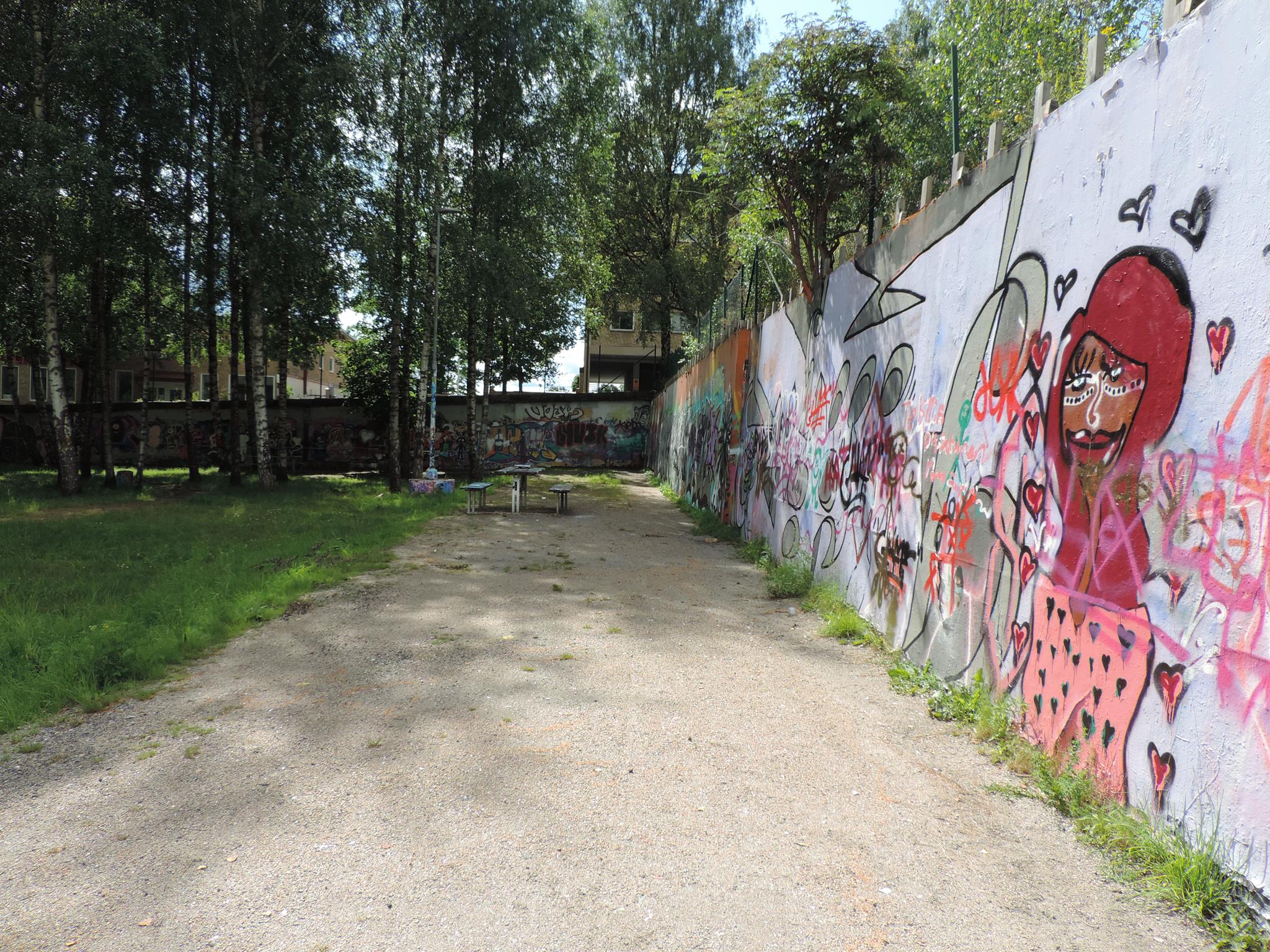 In 2017, part of the existing wall was covered with a paintable surface. The previously dense birch grove was thinned and the site has been made accessible with gravel paths and park benches. To create a safe environment even during the darker periods of the year, the area has been illuminated. The opening and the program at the open wall were produced with the support of Emmy Hilmerssons Minnesfond. In a 2018 citizen survey, the open wall received a positive rating. In the fall of 2019, the rest of the wall was also covered with paintable surfaces, and the wall has now been completed according to plan. Since then, the wall at Magasinsgatan 8 has been painted many times by local and visiting creatives.