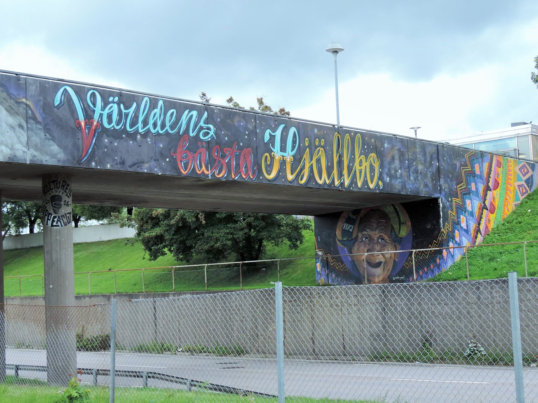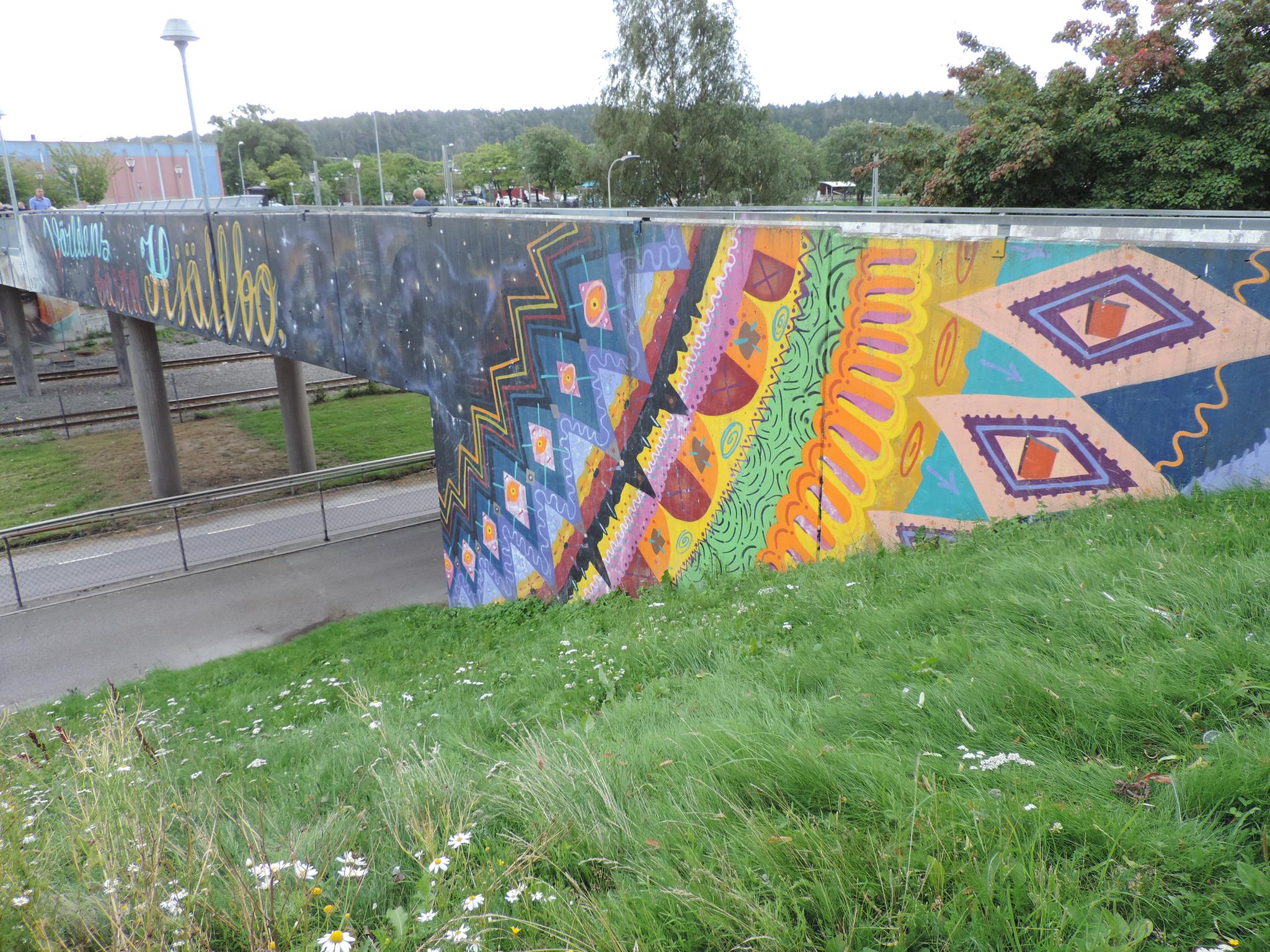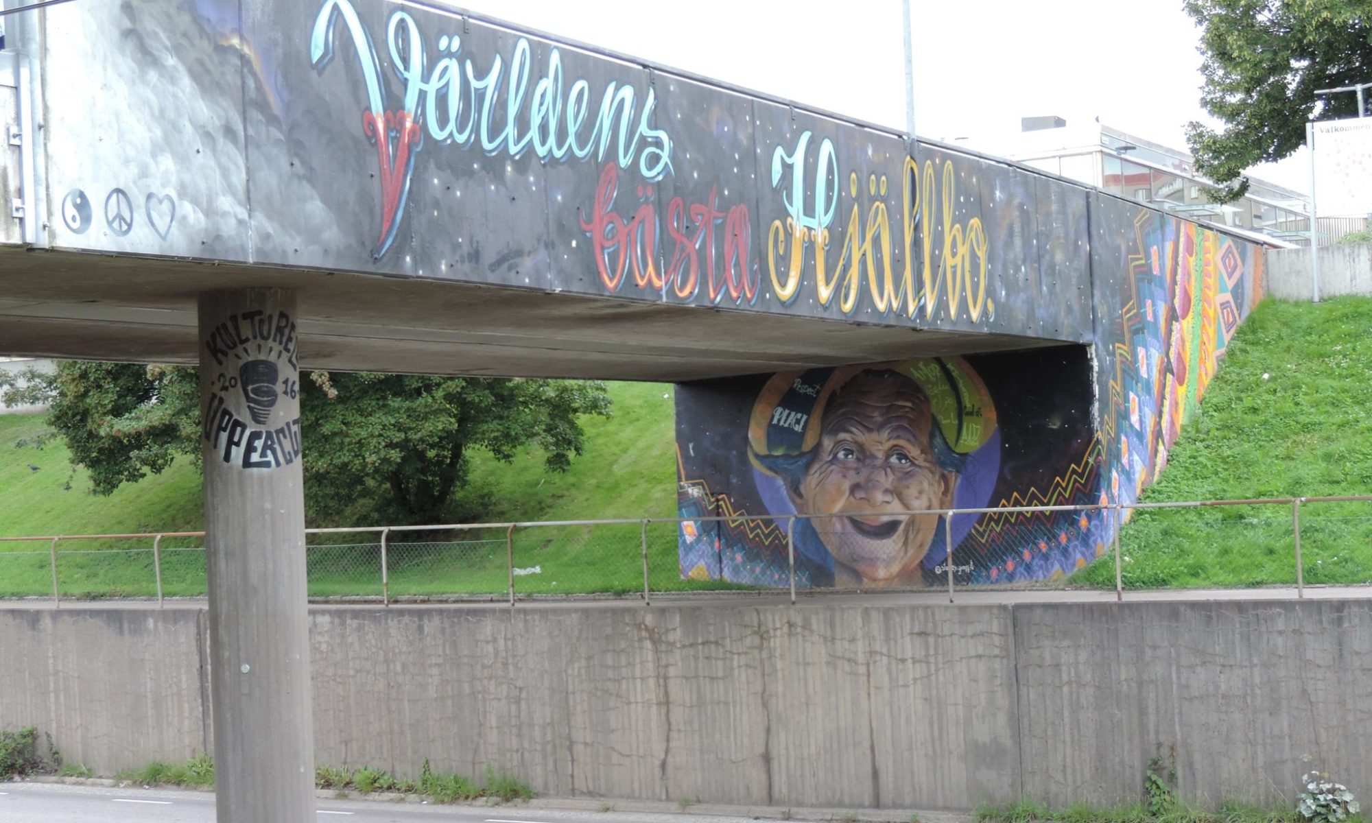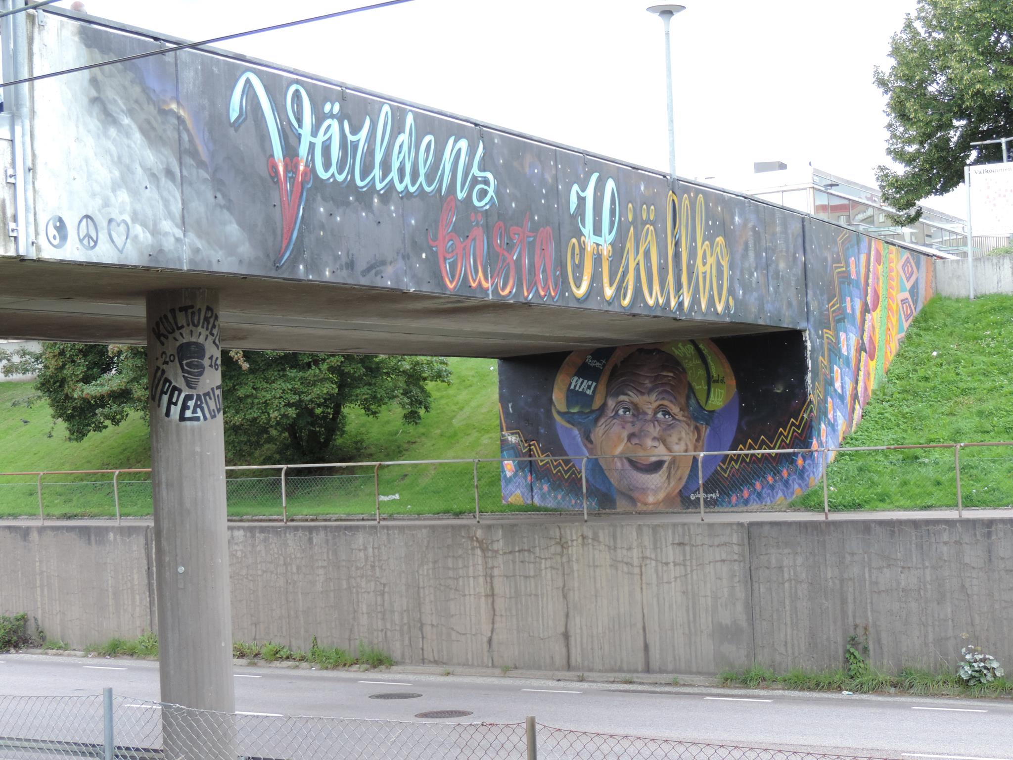 The artwork from STARLEY was made during the ARTSCAPE festival in 2016 on the walls of the pedestrian bridge at Hjällbovägen in the district Hjällbo. „Världens bästa Hjällbo“ means in English „The world’s best Hjällbo“. On the other side of the bridge is written „See with us, you be smiling“.