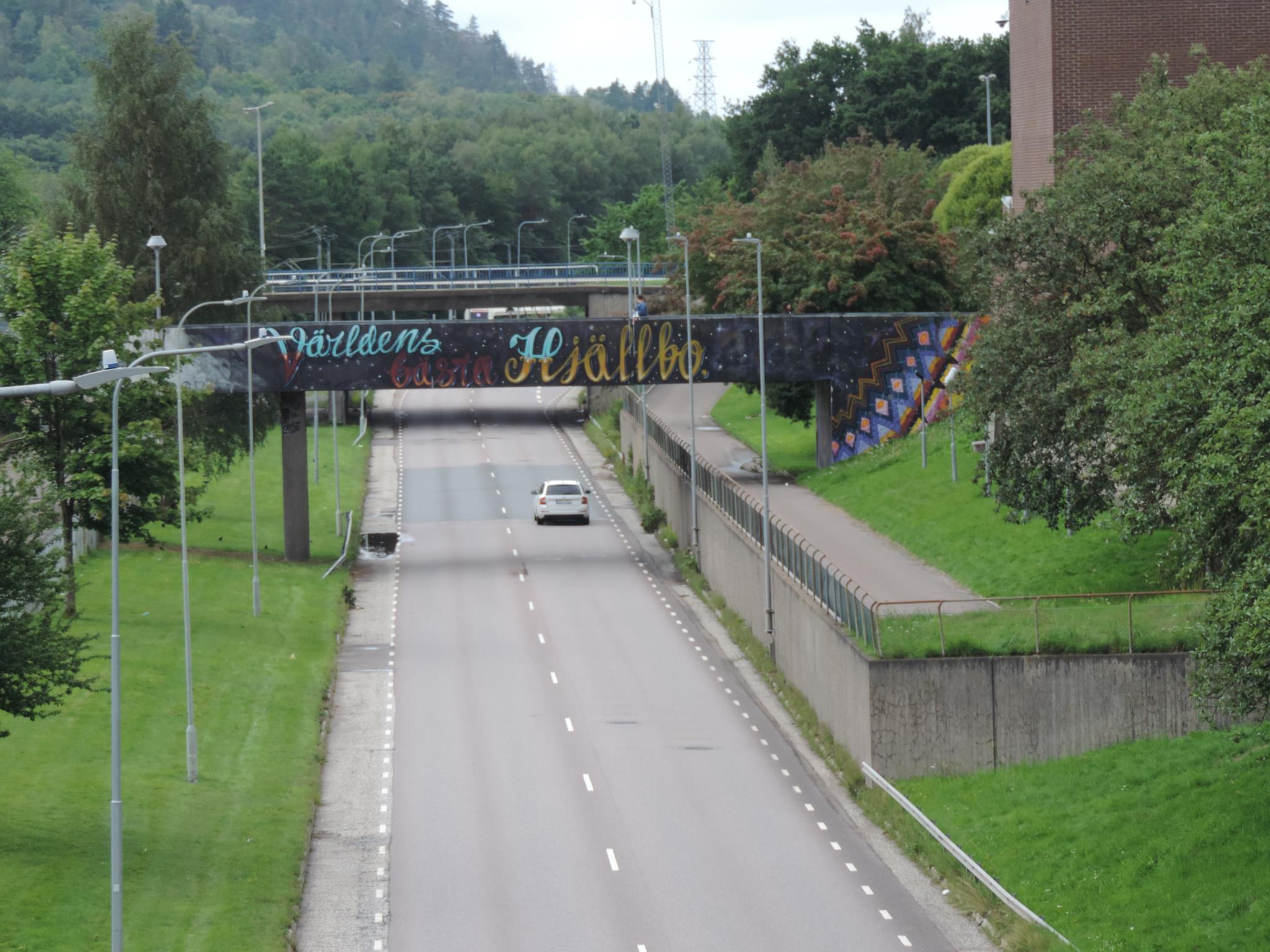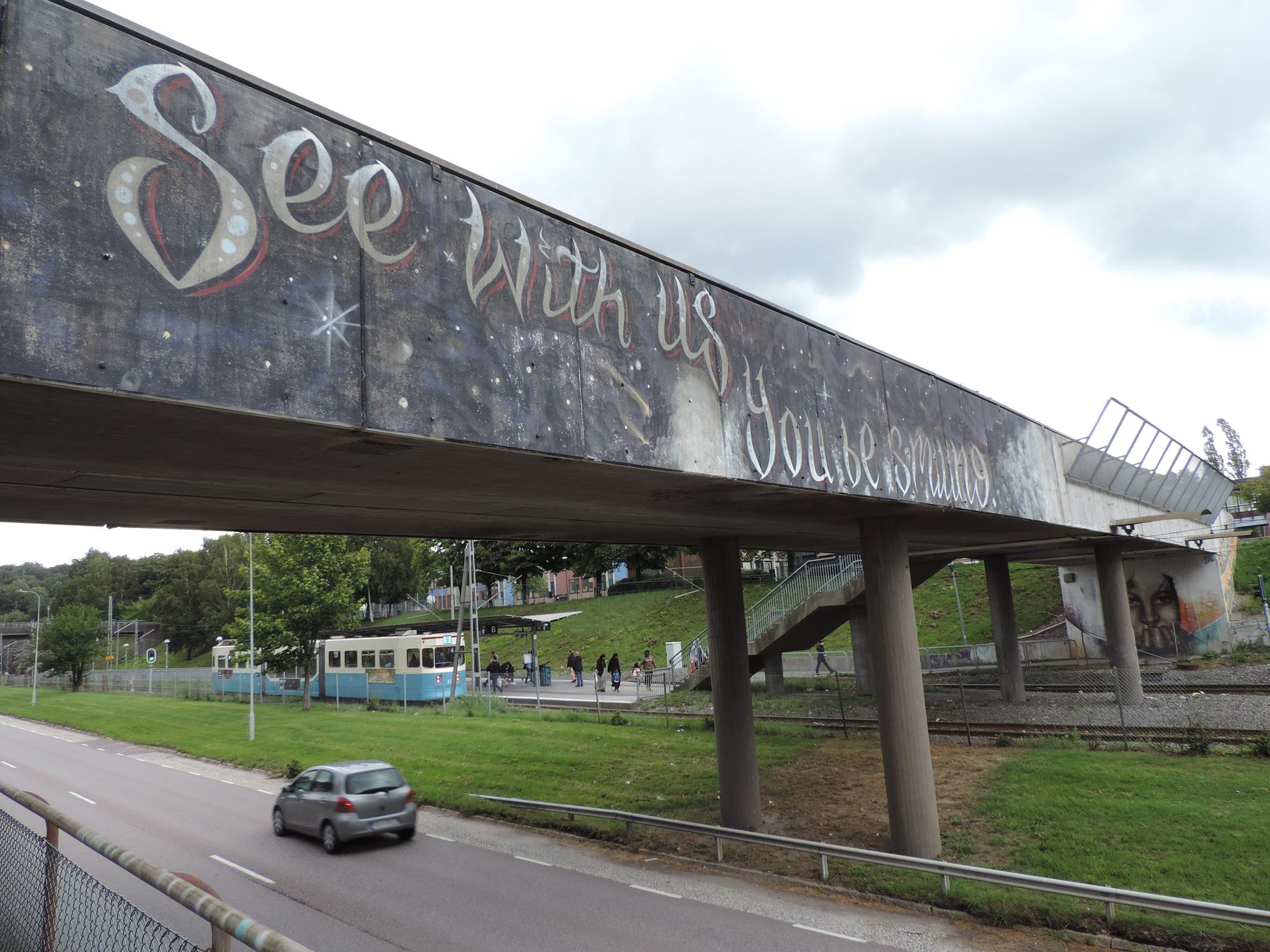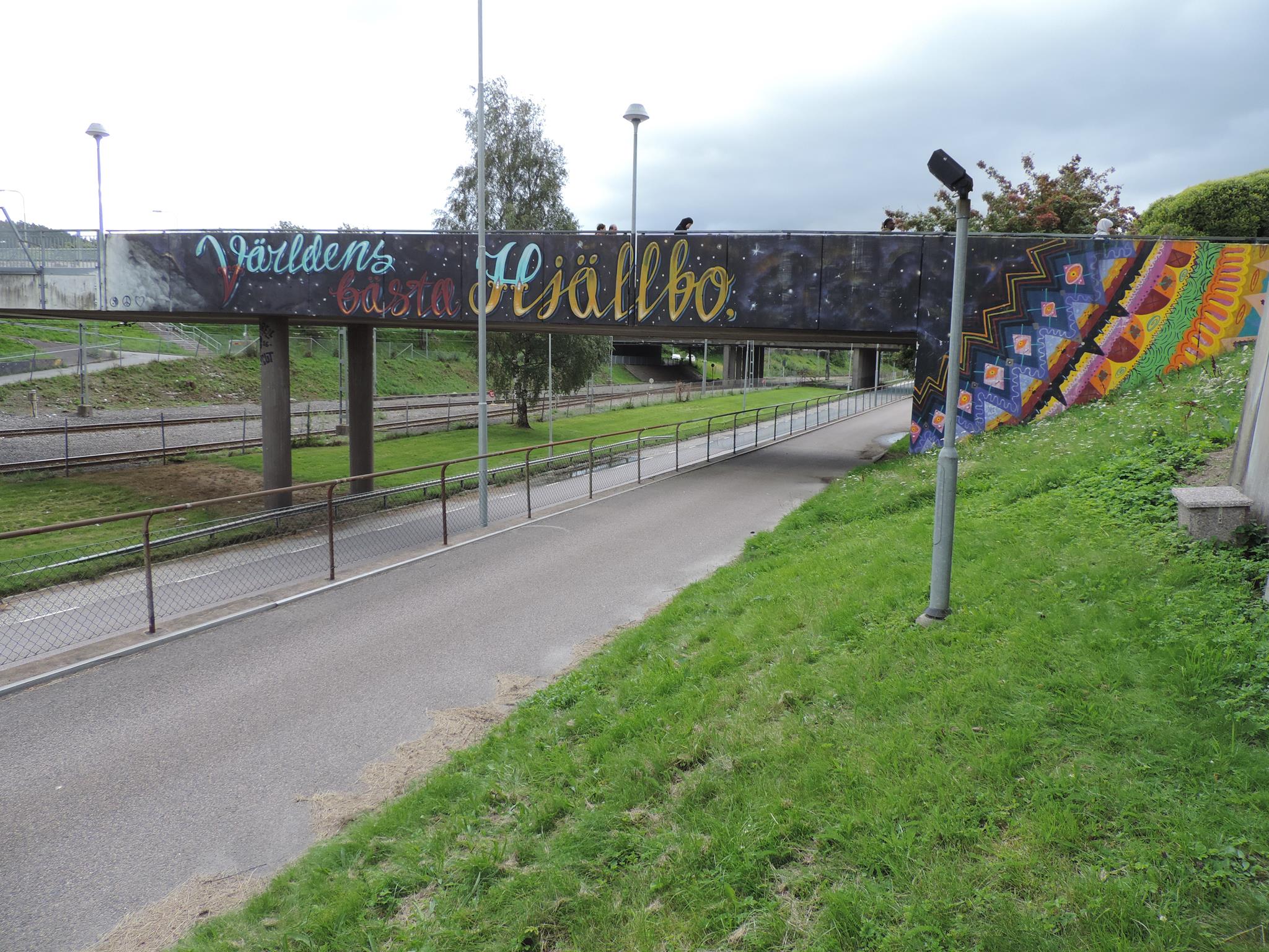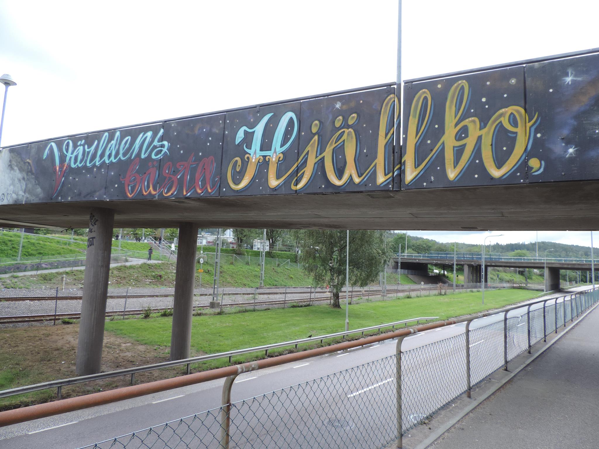 The artwork from STARLEY was made during the ARTSCAPE festival in 2016 on the walls of the pedestrian bridge at Hjällbovägen in the district Hjällbo. „Världens bästa Hjällbo“ means in English „The world’s best Hjällbo“. On the other side of the bridge is written „See with us, you be smiling“.